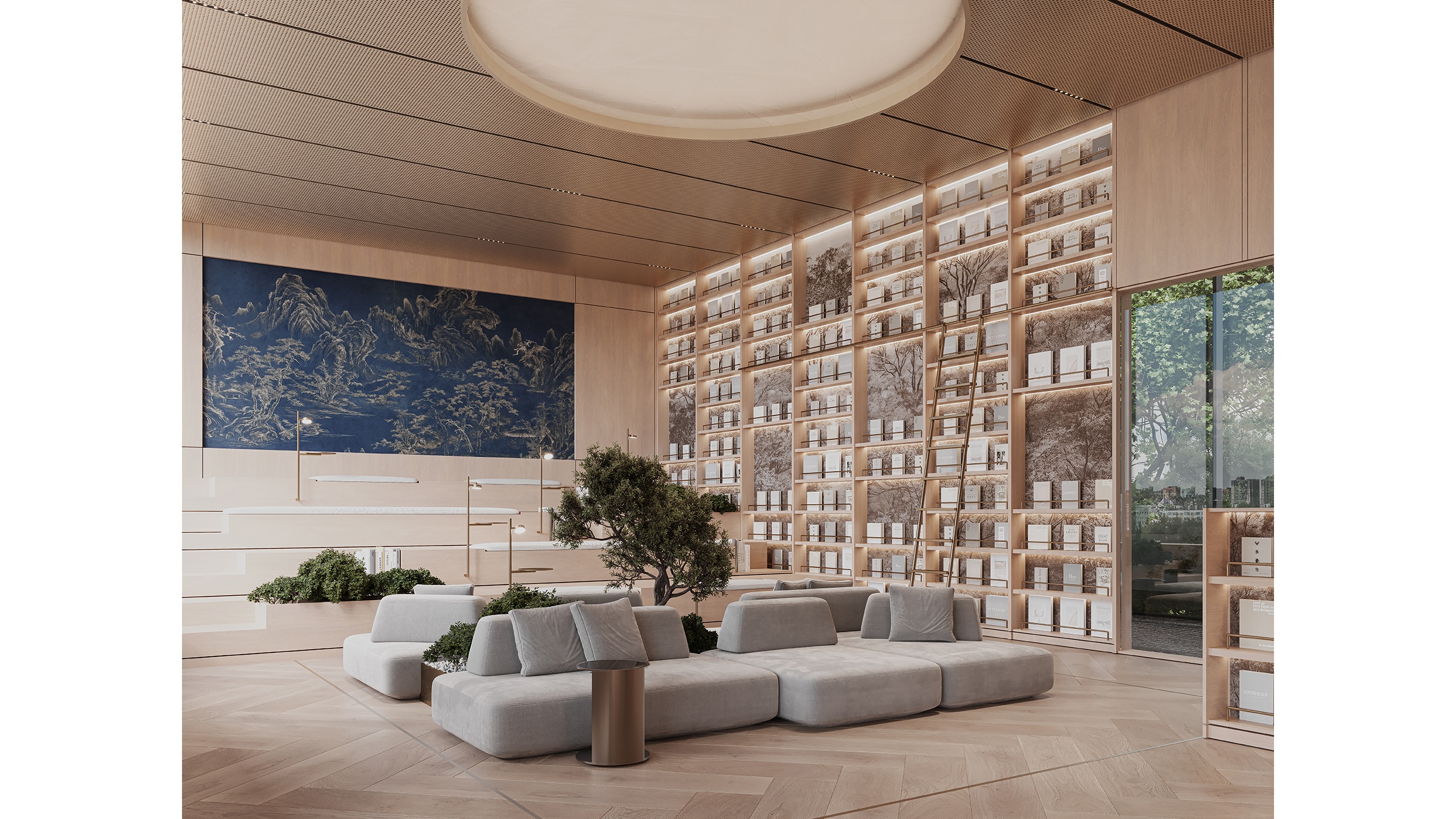 The third zone is designed for long-duration reading and relaxed engagement. Soft seating arrangements for relaxed reading, island display units showcasing curated book selections, and integrated seating around display elements for browsing define this area. Books are presented in a more tactile and accessible way, encouraging users to interact physically with the collection. This zone transforms reading into an exploratory and immersive experience.
