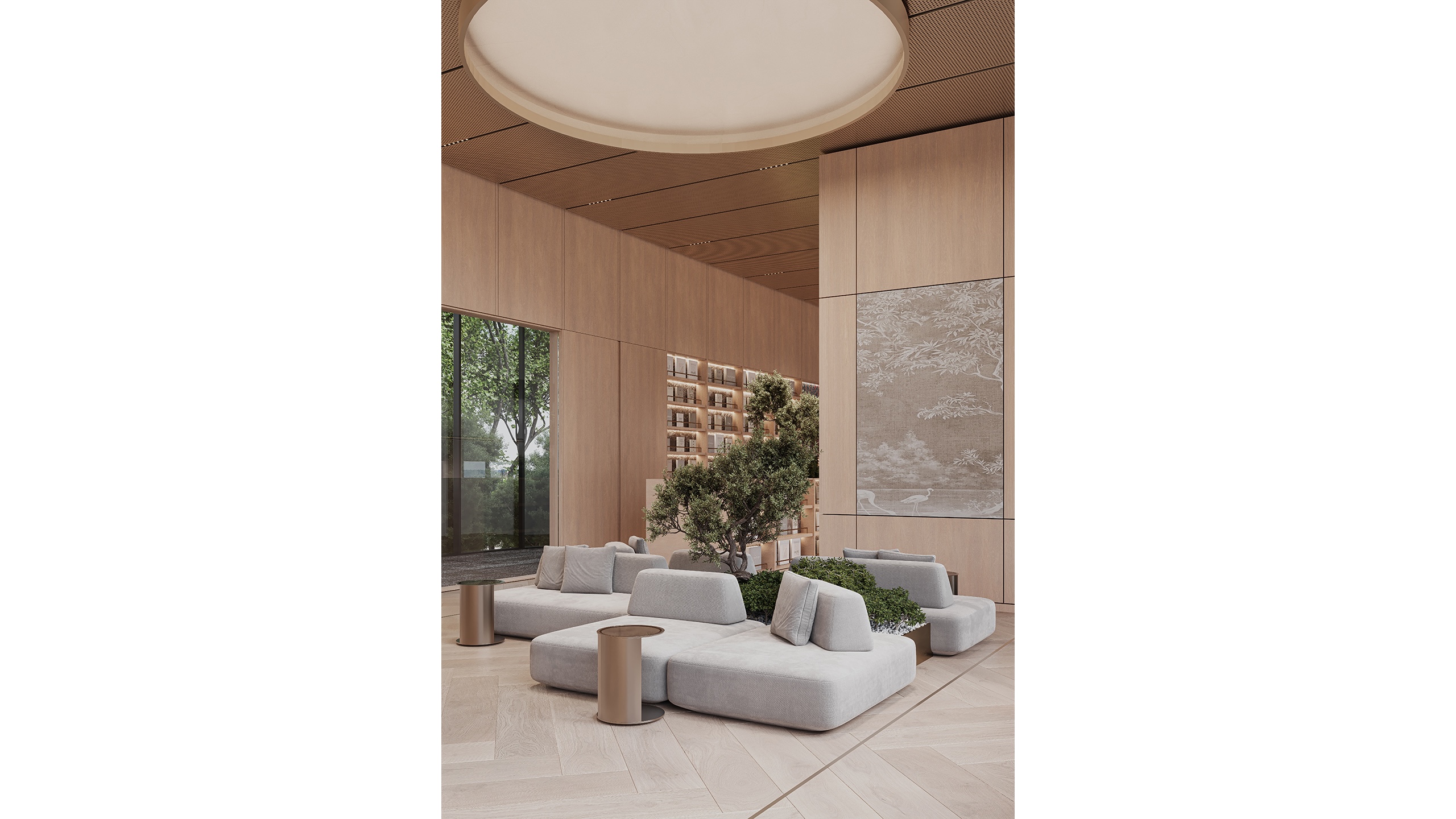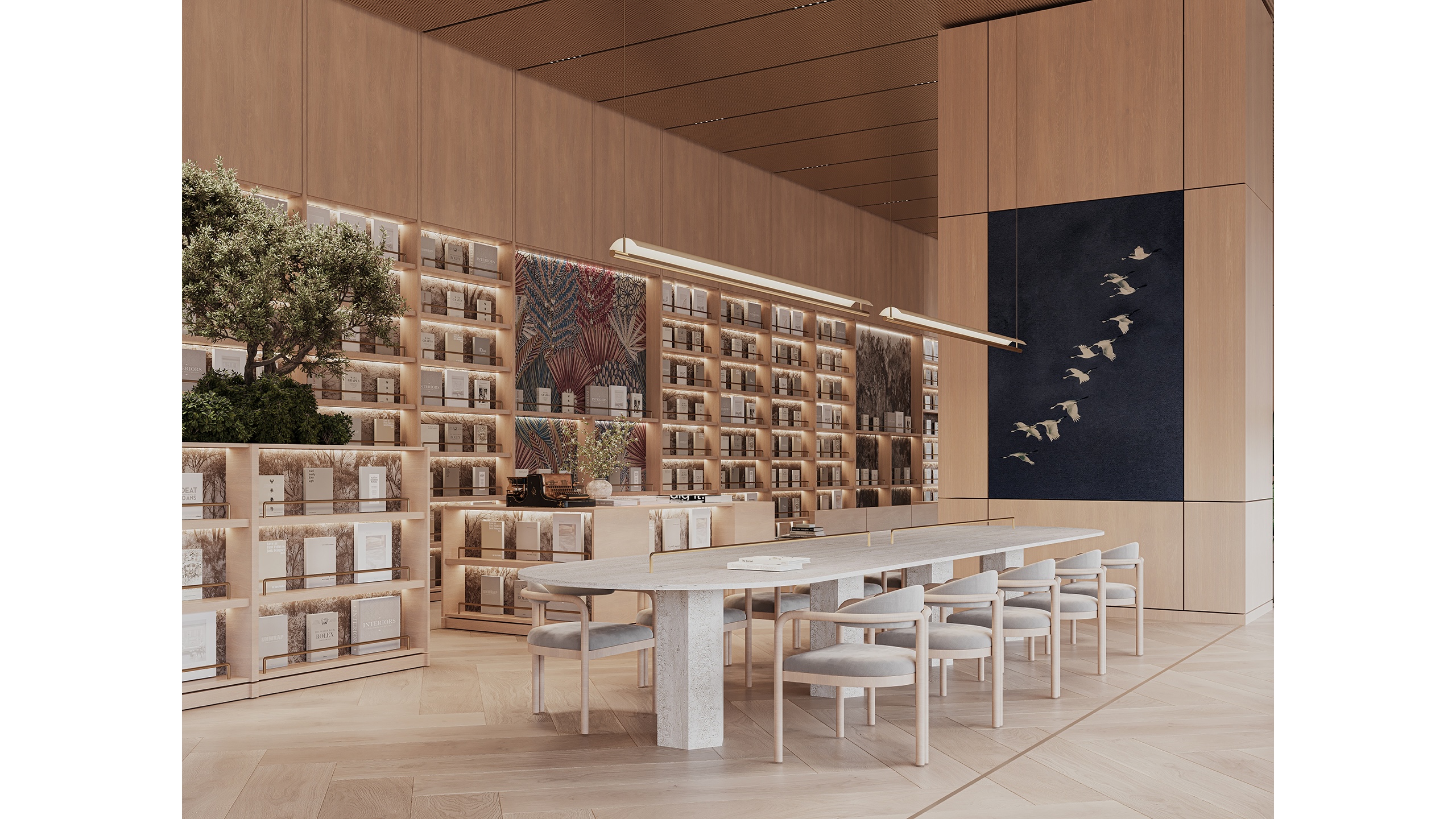 The interior language of the Quiet Library is defined by a soft, natural material palette. Light-toned wood forms the primary architectural surface, establishing a sense of warmth and visual continuity throughout the space. This is complemented by soft-textured textiles used in seating elements, which enhance acoustic comfort while adding tactile depth. The result is a modern yet welcoming environment, where minimalism is softened through material richness.