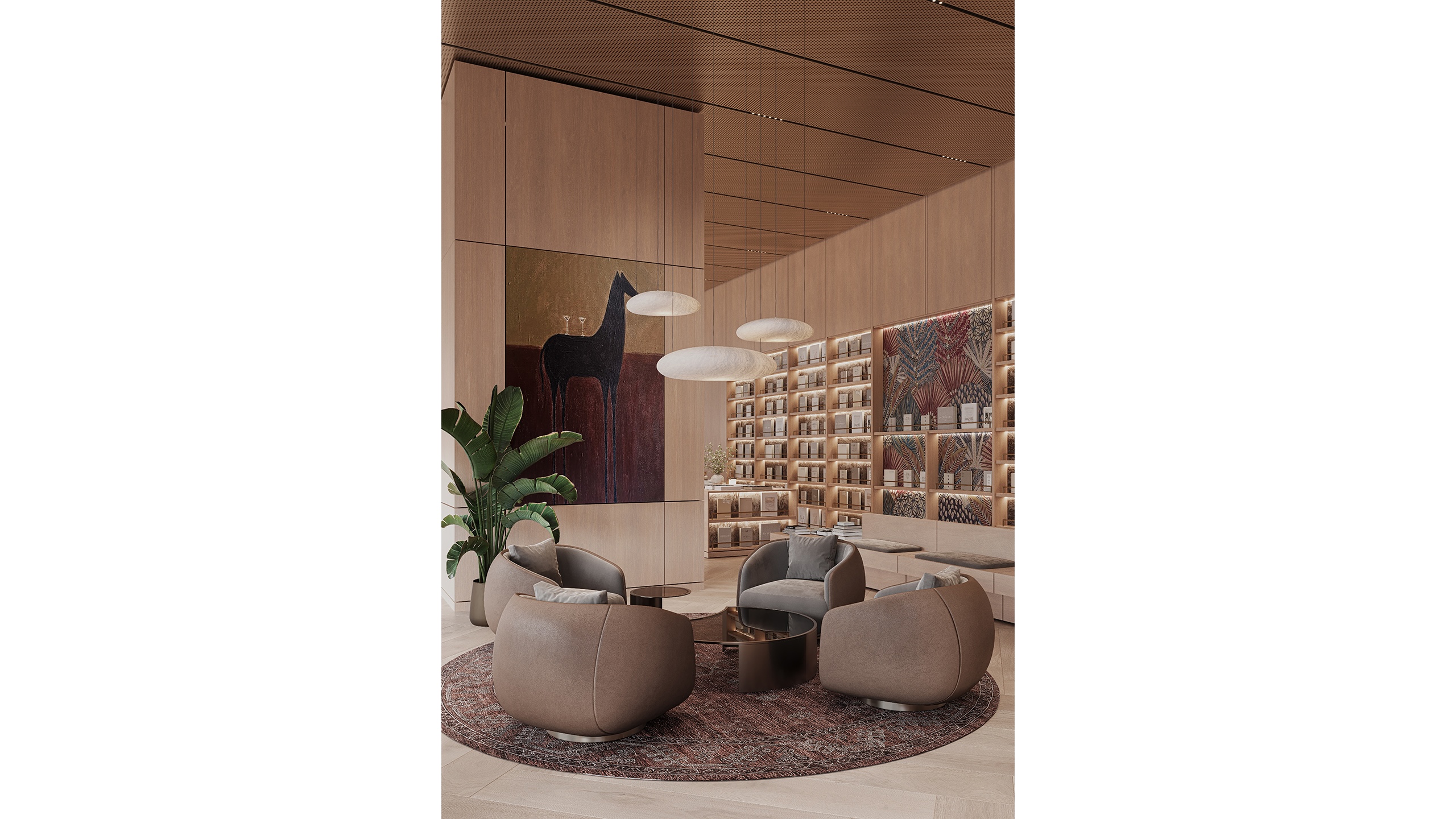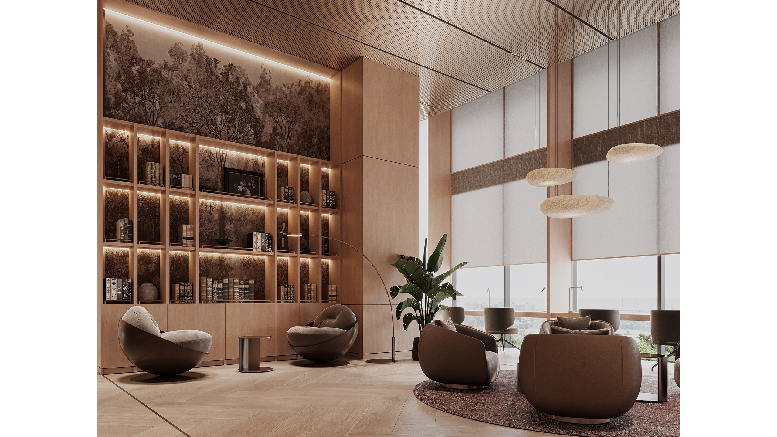 The Silent Library within the Amra Project by Citi Developers is designed as a calm and contemplative space dedicated to reading, writing, and focused individual work. Conceived as part of a dual-library system, it complements the more social Collective Library, while offering a deeply atmospheric environment for concentration and intellectual retreat. This space is shaped by the idea of quiet productivity, where material warmth, controlled lighting, and spatial layering come together to support extended periods of focus in a comfortable and inspiring setting.