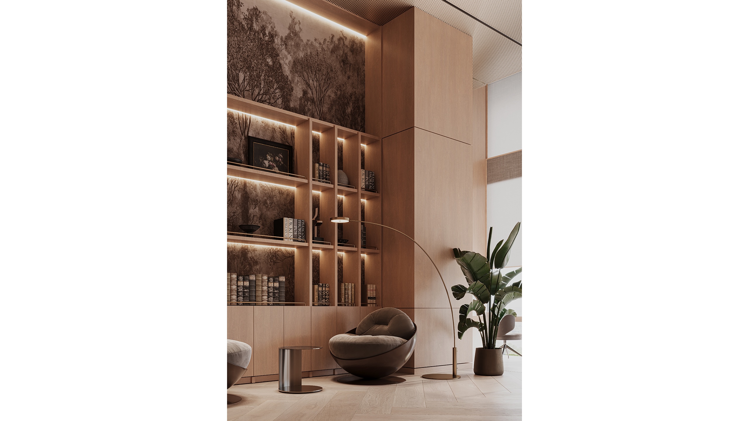 This balance between simplicity and warmth creates a space that feels both contemporary and timeless, supporting long-term usability without visual fatigue. Subtle decorative elements such as curated artworks, paintings, and indoor plants introduce layers of personality, transforming the library into a holistic and lived-in environment rather than a purely functional study space.