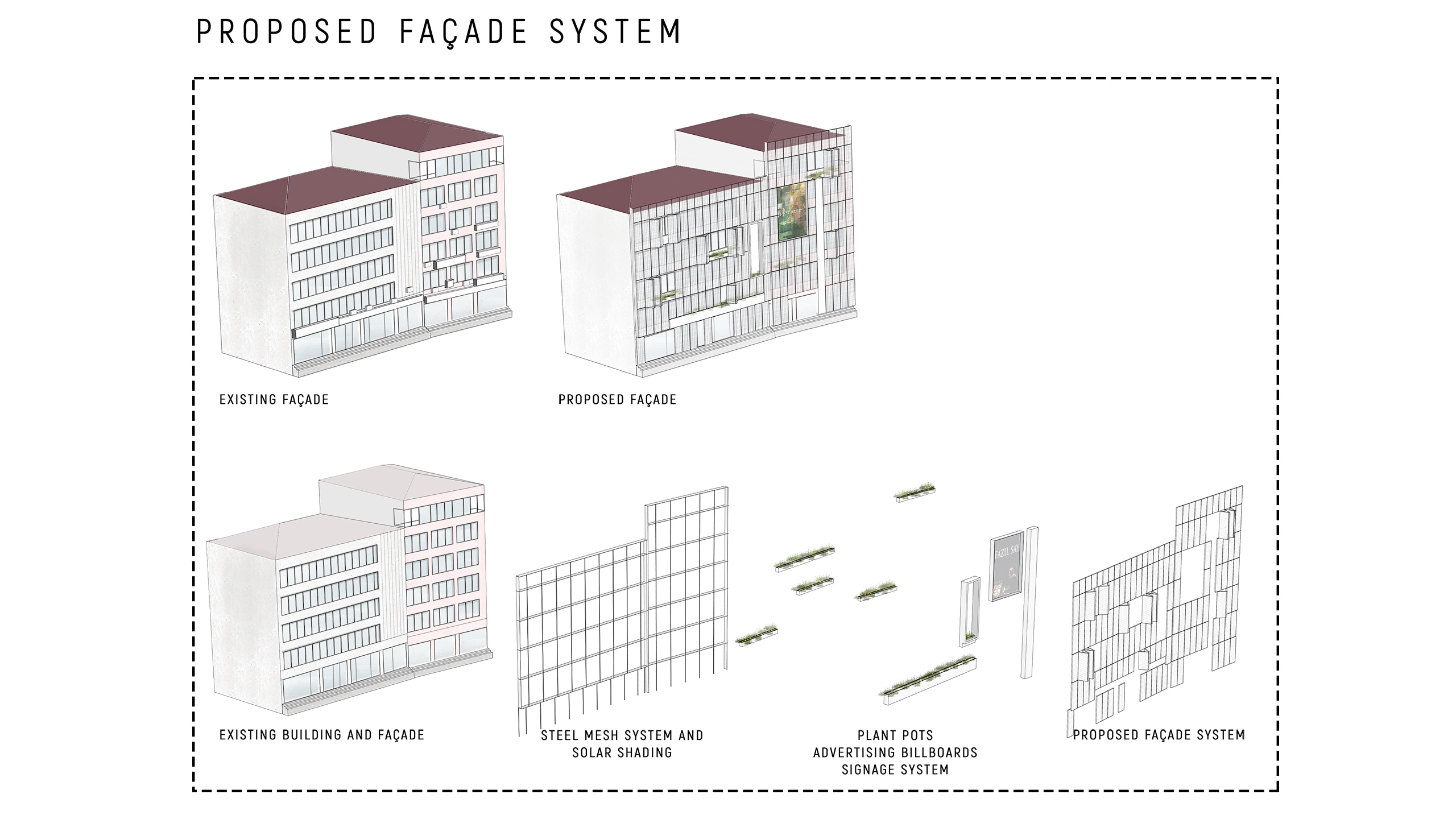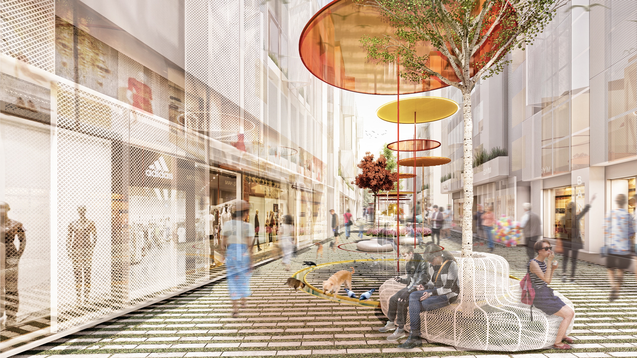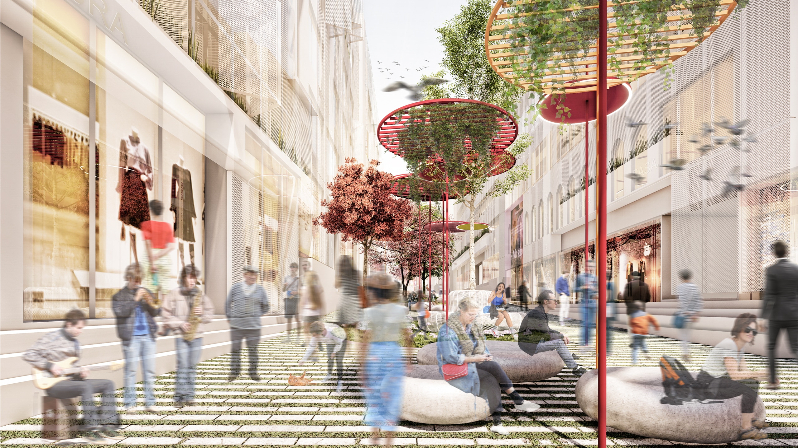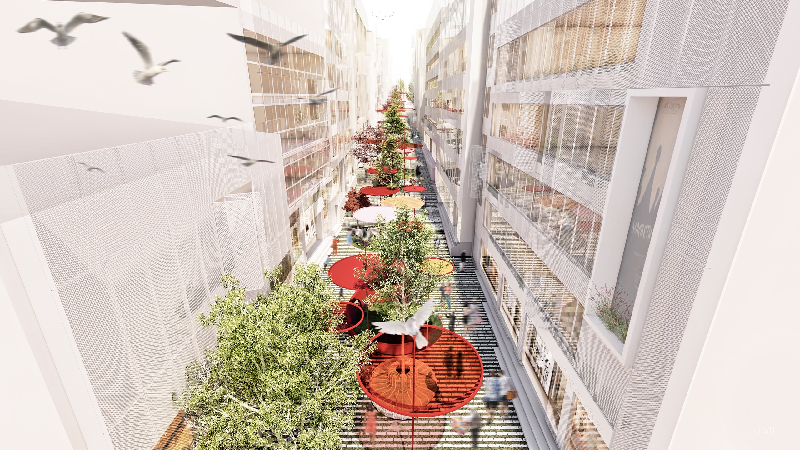 By transforming the façade silhouette into a refined architectural layer and creating public gathering spaces, the design strengthens the commercial vitality of the street while preserving and reinterpreting its historic identity.