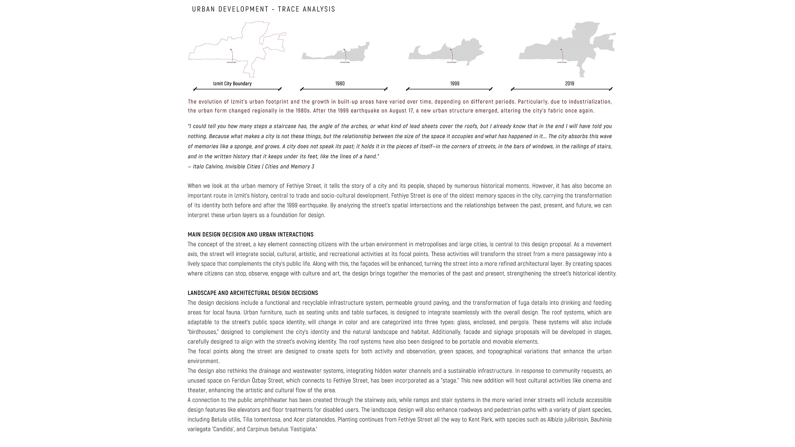 Fethiye Street stands as one of Izmit’s most significant urban memory corridors, weaving together the city’s historical layers with its contemporary social and cultural life. For decades, it has served not only as a commercial spine but also as a symbolic route connecting the collective memories of the city and its residents. Following the transformations before and after the August 17, 1999 earthquake, the street evolved into a space where past, present, and future converge, making it a focal point for urban regeneration.