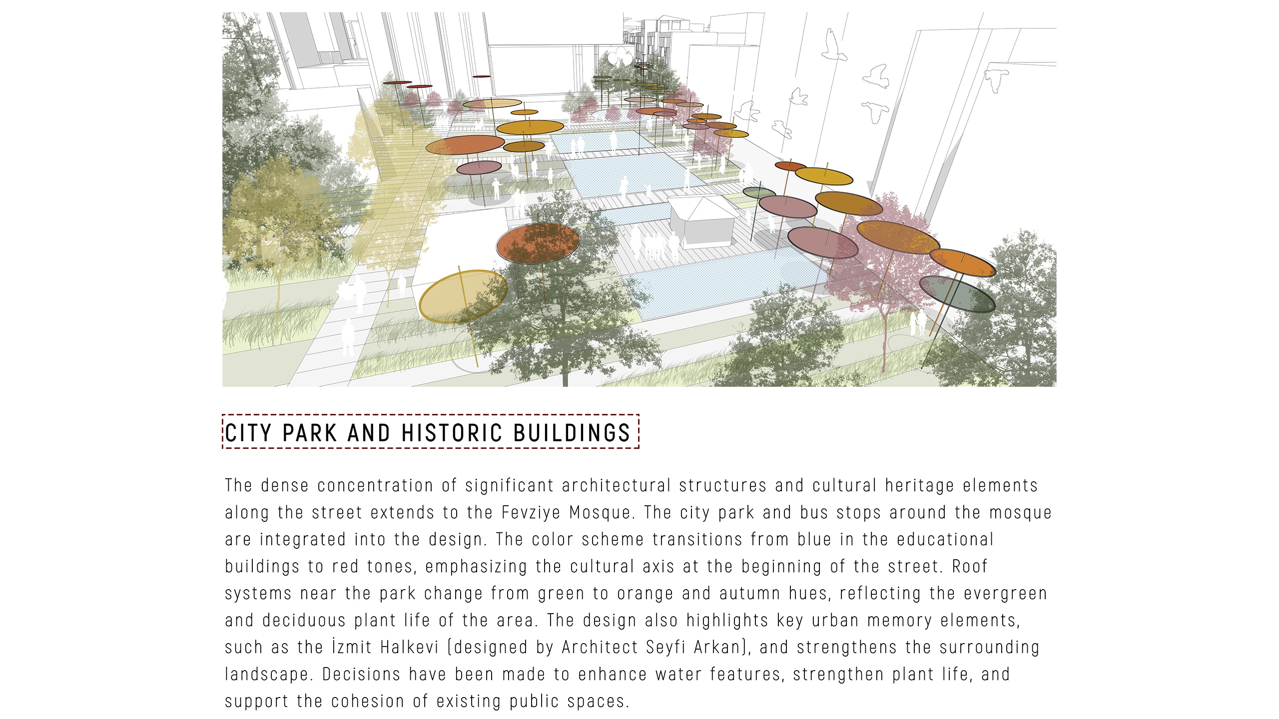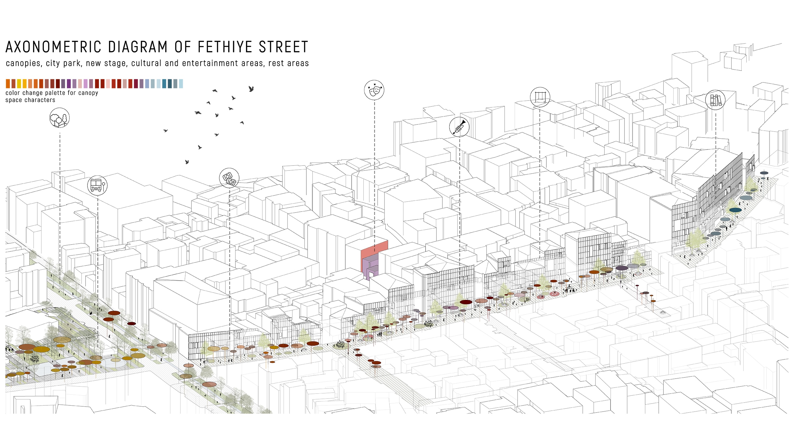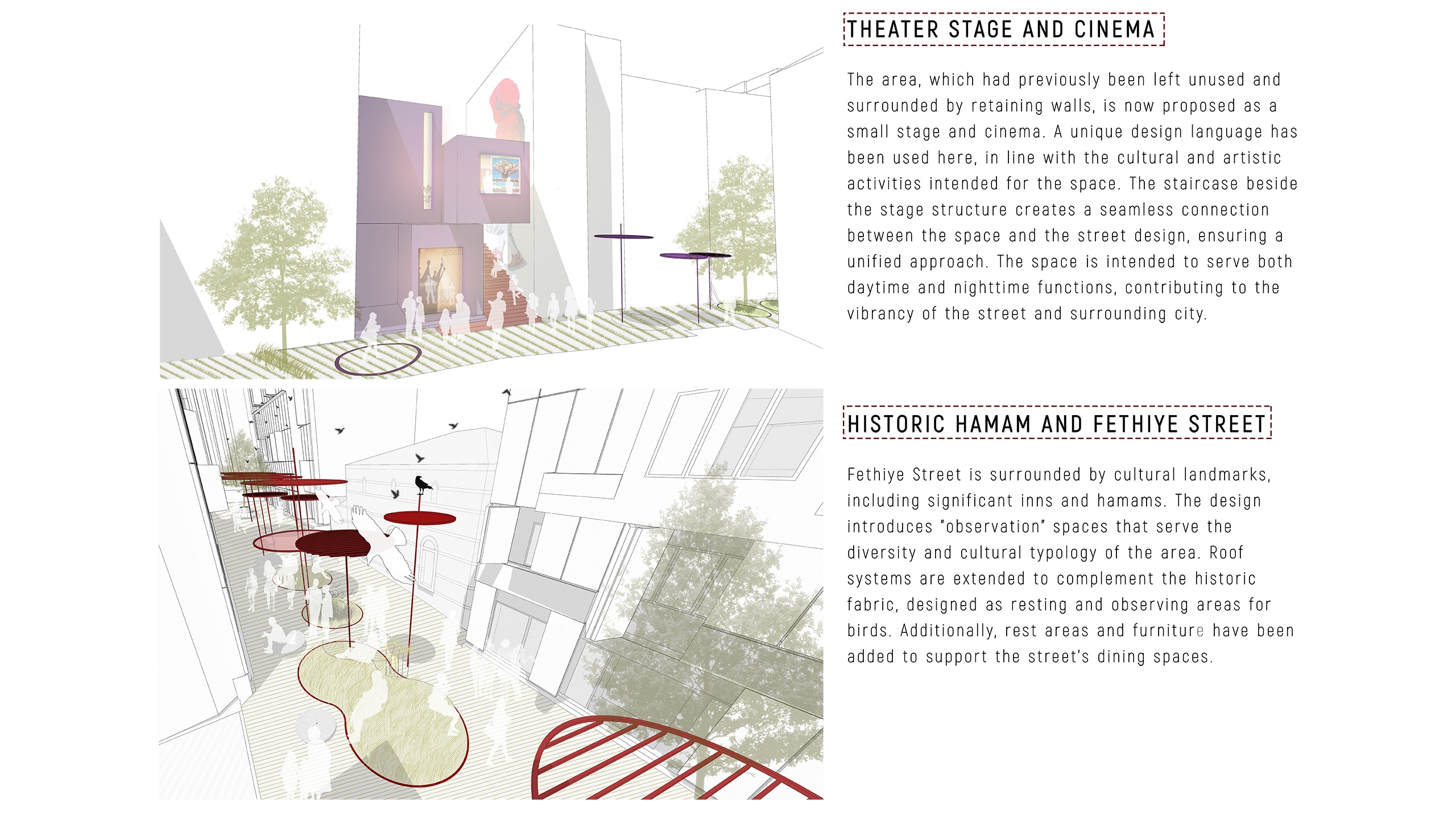 The project approaches Fethiye Street as a dynamic movement axis within the metropolitan fabric: a place where residents meet, pause, observe, and engage with culture. The main design intent is to enrich the street’s transitional nature with focal points for social, cultural, artistic, and recreational activities, while enhancing its architectural and landscape quality.