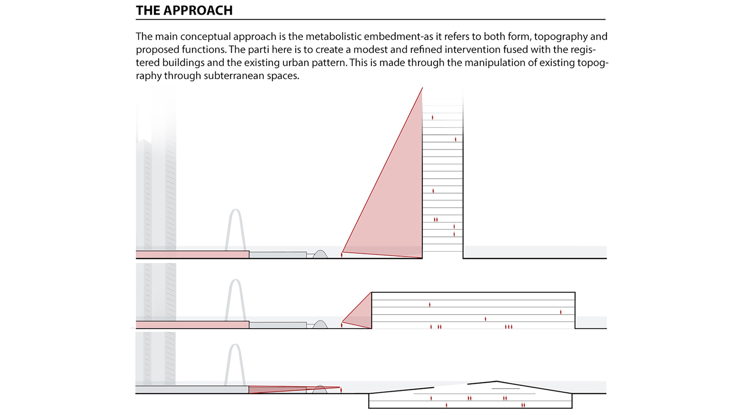 The intervention redefines the site through a sensitive manipulation of the topography, embedding parts of the program in subterranean volumes that harmonize with the landscape rather than dominate it. This approach fosters a continuity between the old and the new, allowing heritage to coexist with modern development.