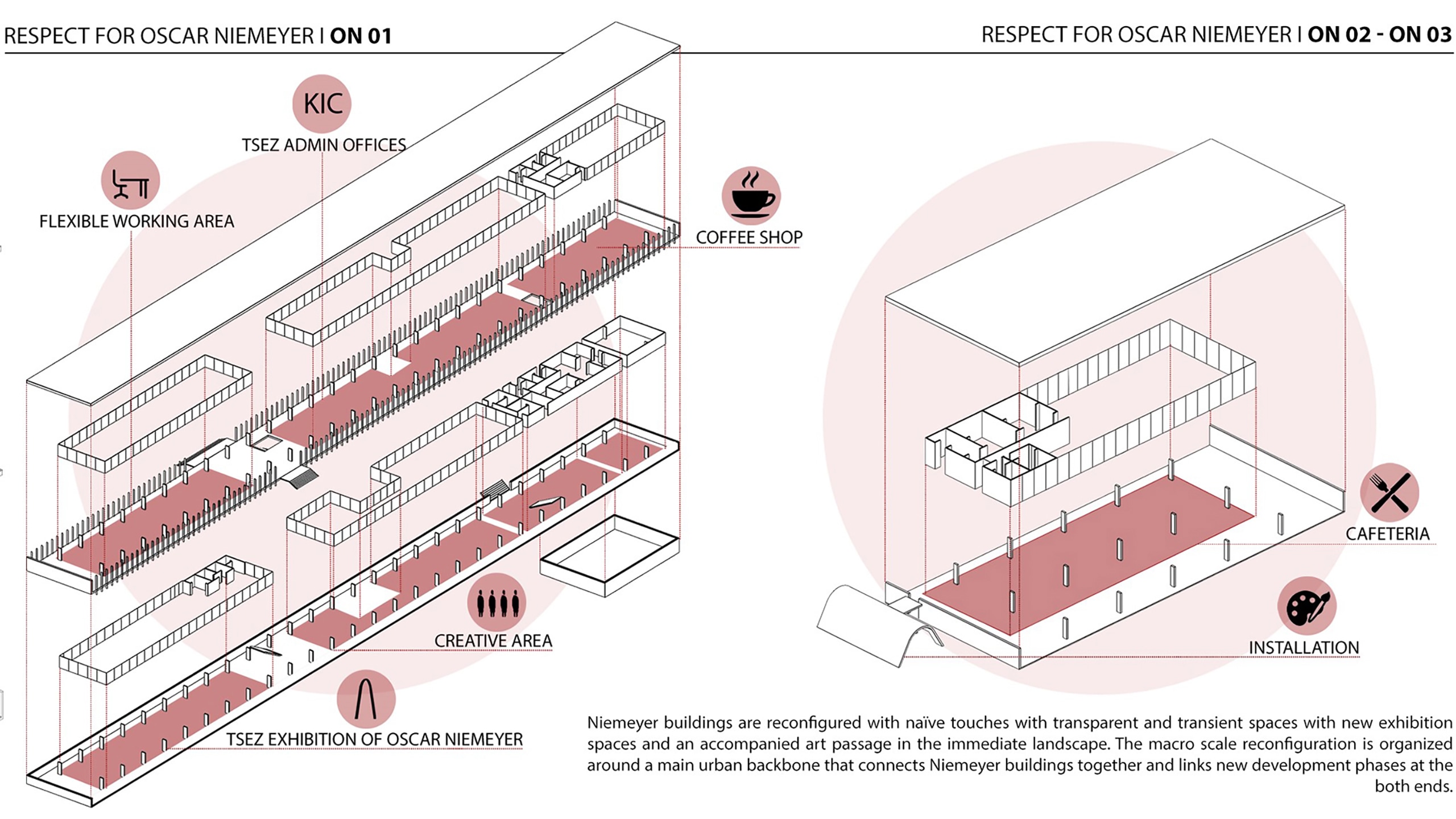 The Niemeyer buildings are reinterpreted with naive and respectful interventions, where translucent spaces invite light and motion, enhancing their public character while preserving architectural integrity.