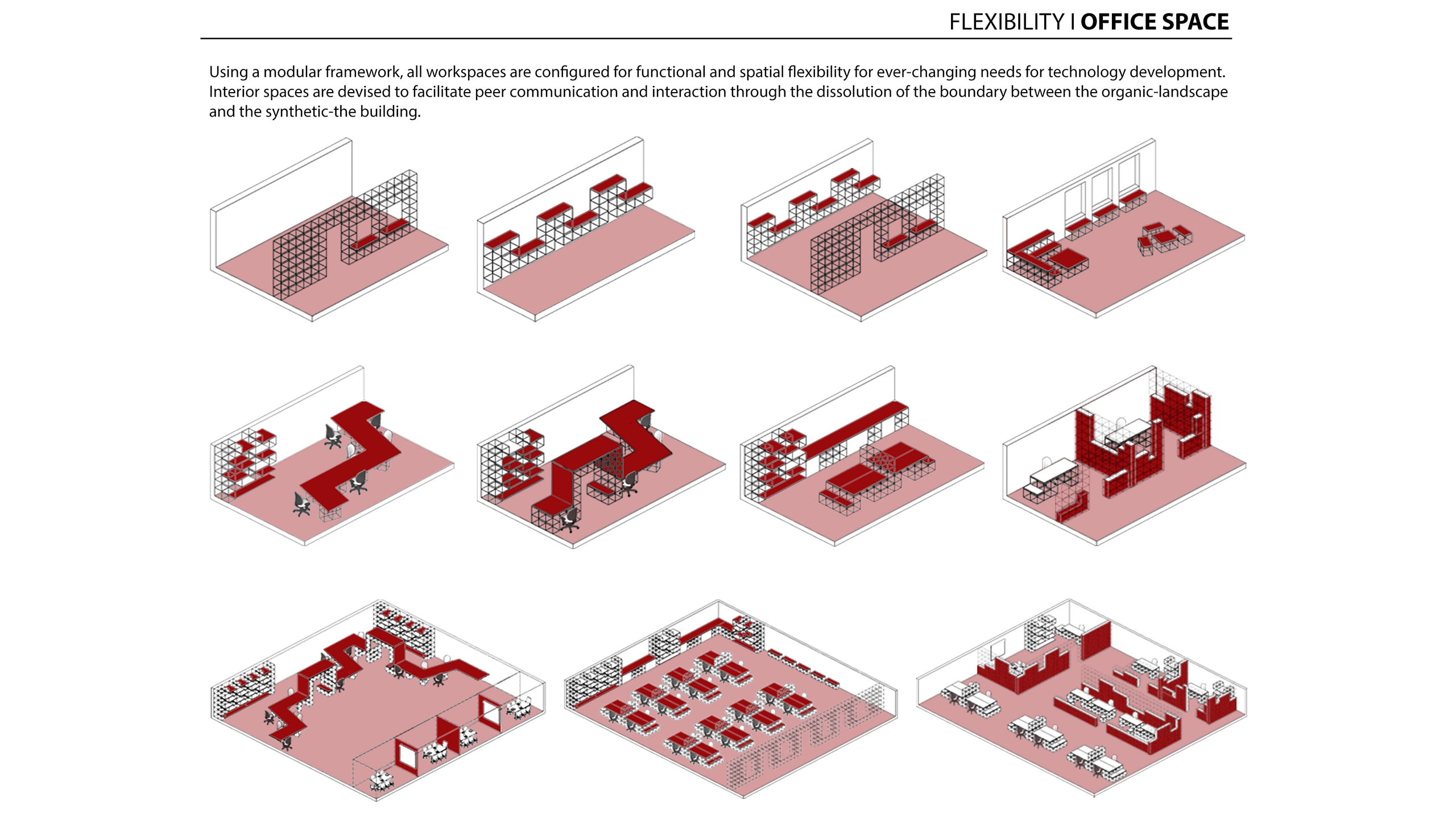 One of the defining strengths of Flowscape is its emphasis on modular and adaptive spatial planning. The interior configuration enables maximum flexibility, essential for responding to the evolving needs of technology and innovation sectors.