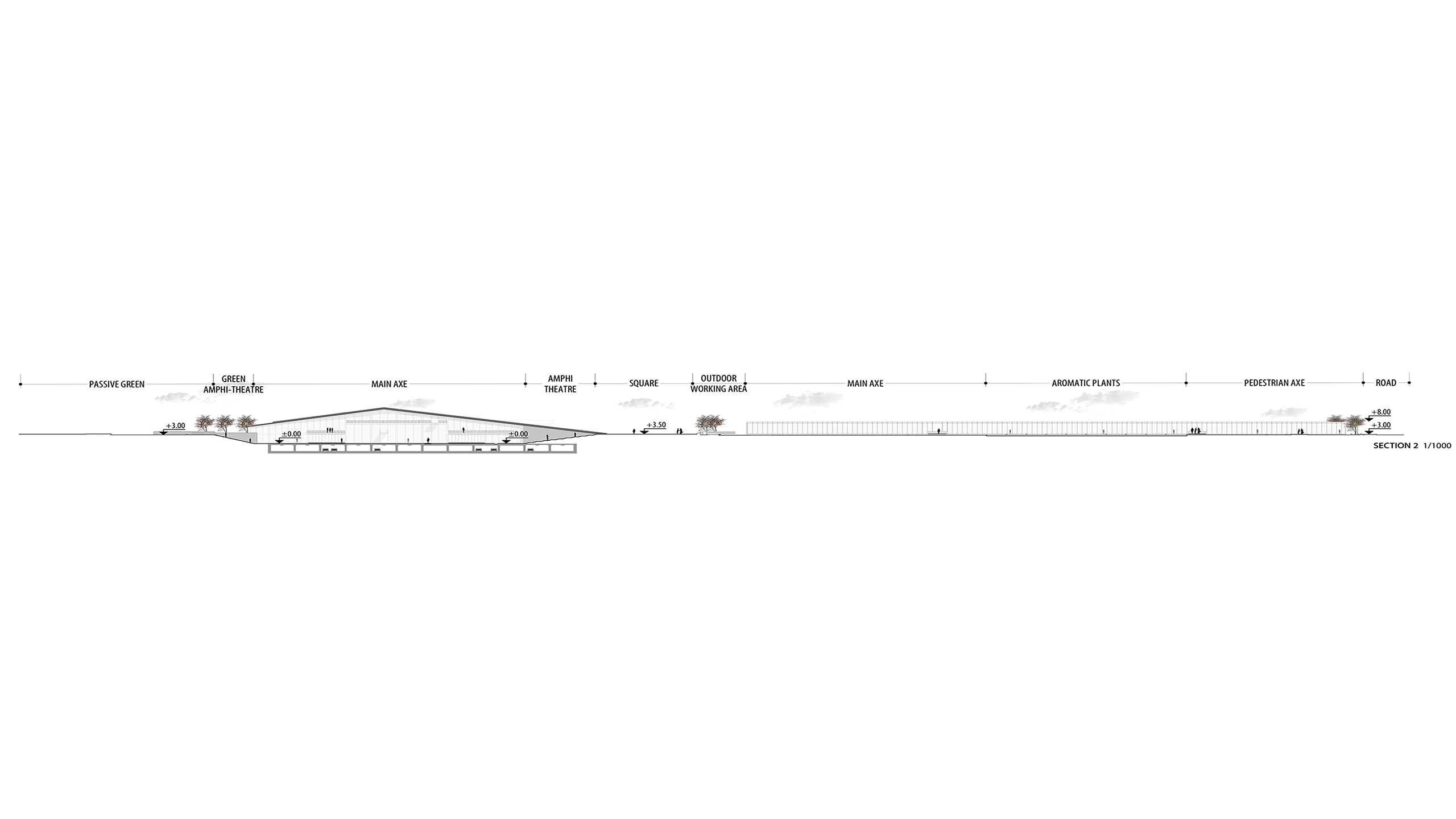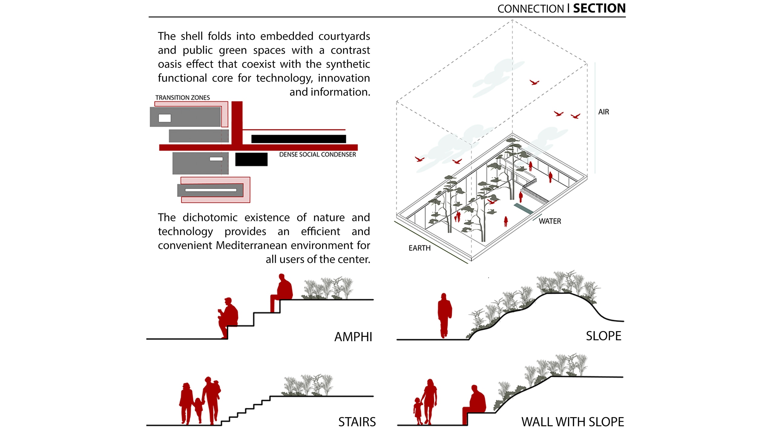 This dichotomy between nature and structure creates a Mediterranean microclimate that enhances comfort and sustainability. The Oasis becomes a social and ecological hub where users of the center can experience both serenity and stimulation.