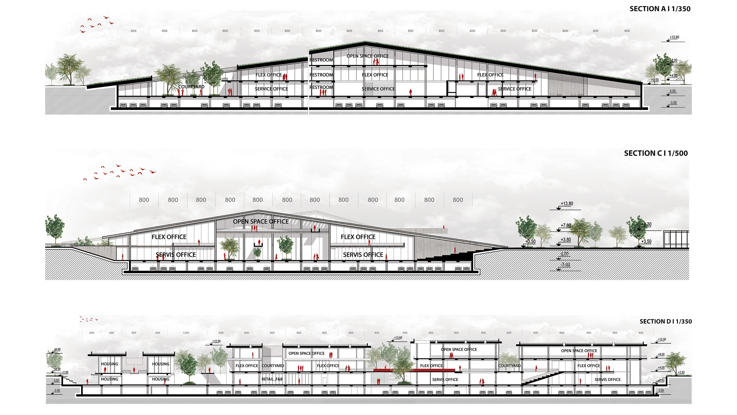 In addition to research and innovation facilities, the project integrates residential components. Housing units are planned with modular block systems, each connected to private gardens, offering a human-scaled living experience. These residences are strategically located under the folded roof structure to ensure climatic responsiveness, passive shading, and natural ventilation - key considerations for the Lebanese coastal climate.