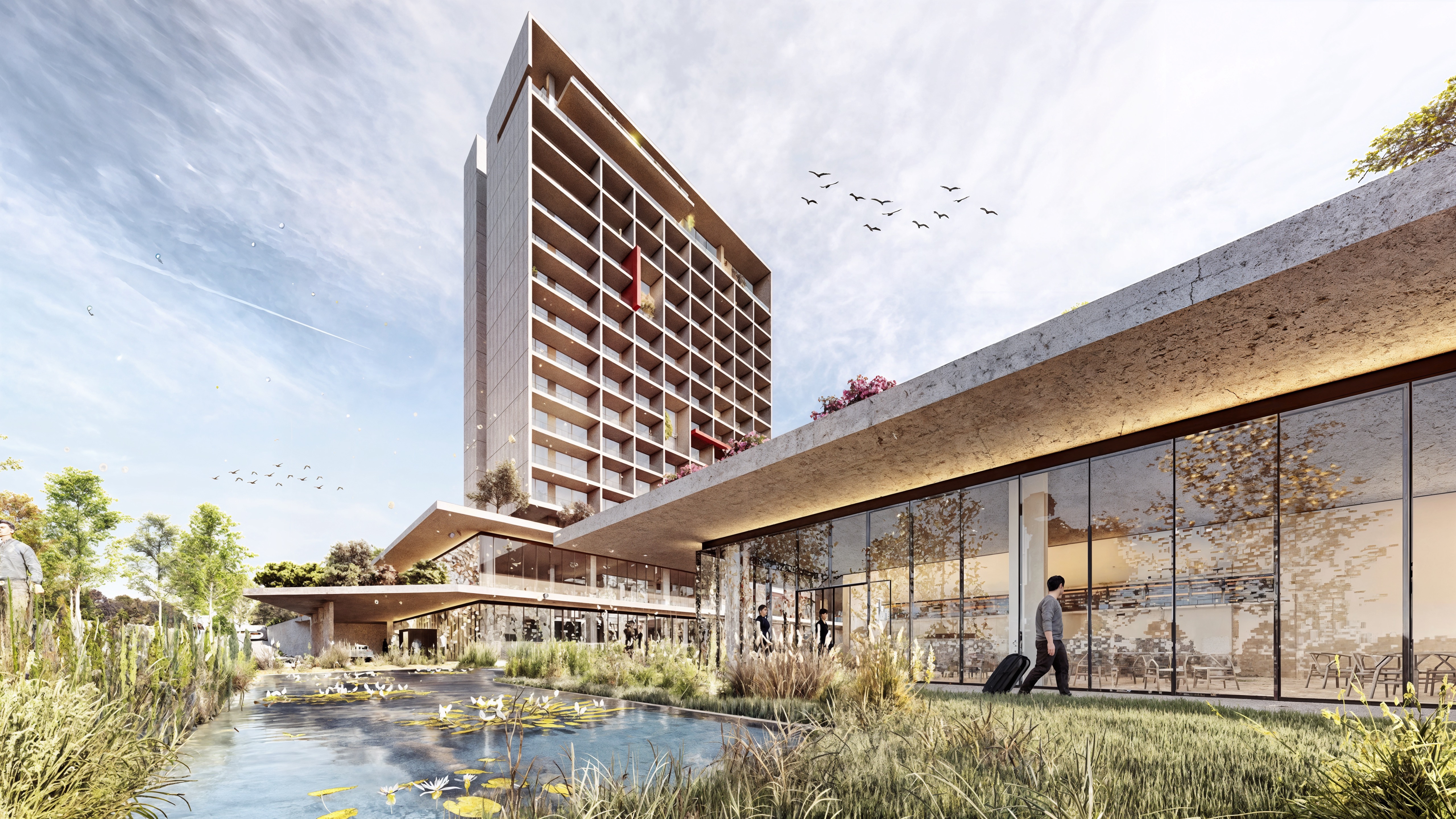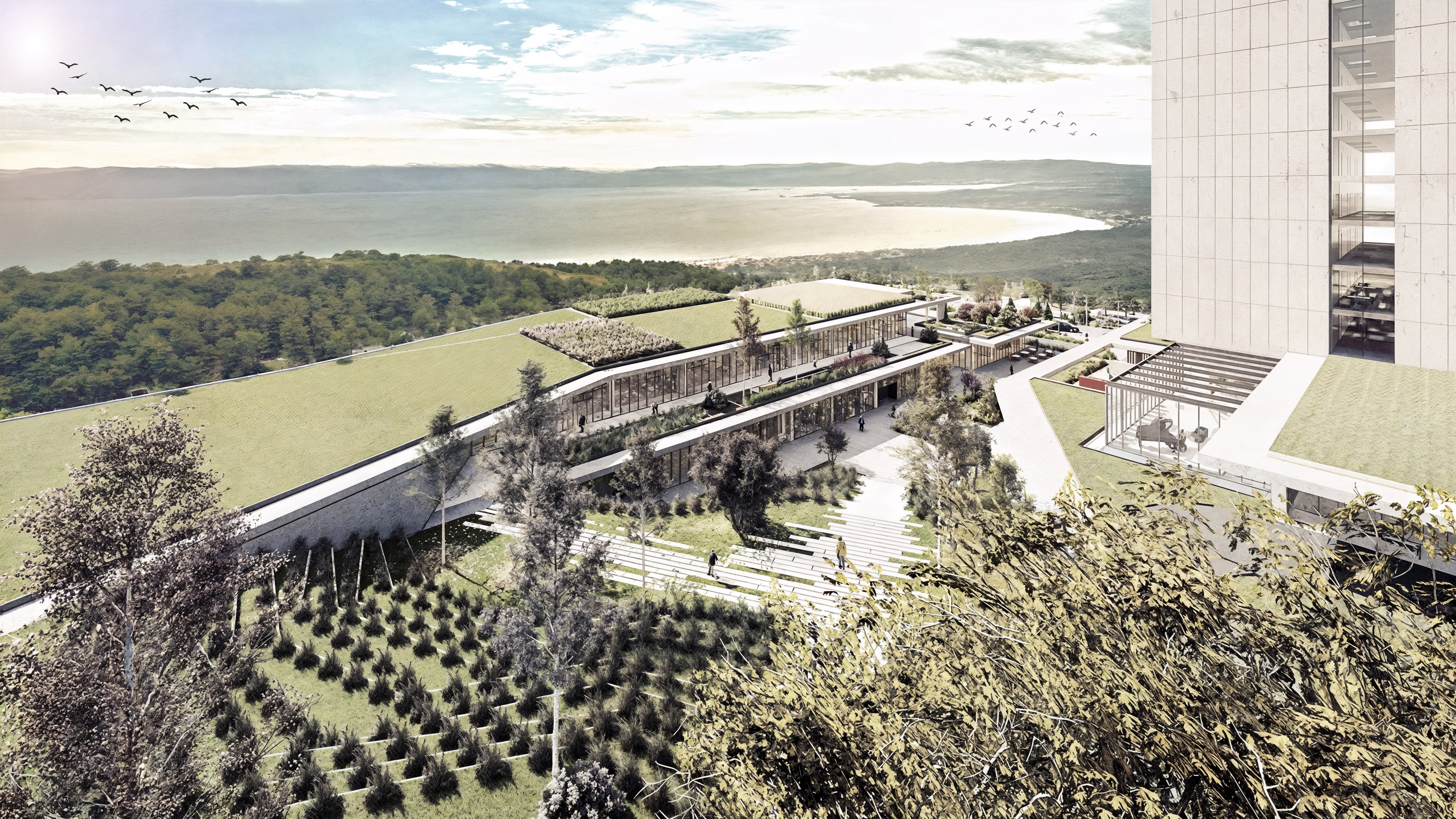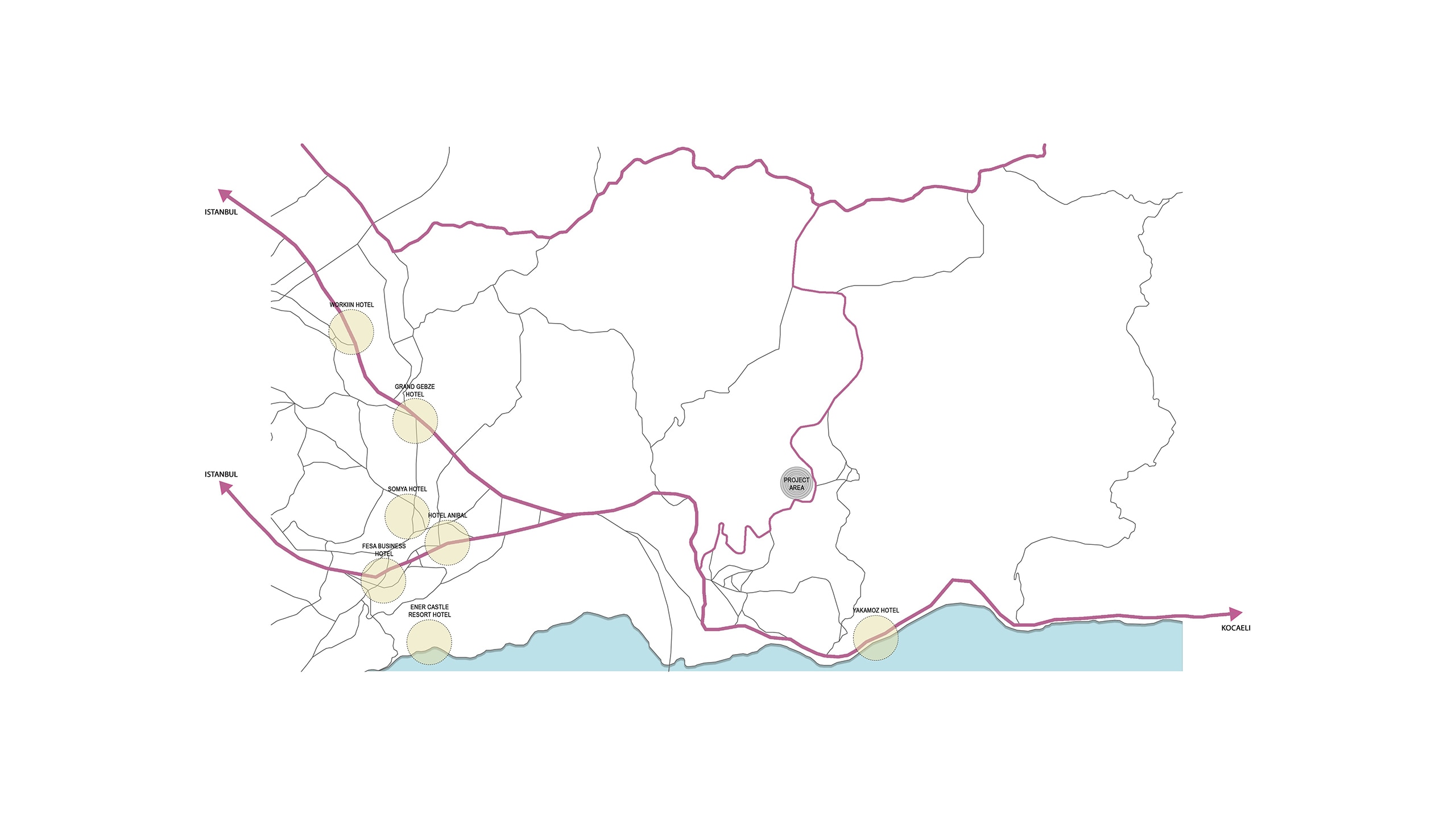 Rising from the base structure, the hotel tower is designed as a vertical landmark within the otherwise low-rise industrial context. Positioned at a high point on the site, the tower enjoys unobstructed views of the surrounding landscape and the distant Gulf of Izmit. Every guest room is oriented towards this view, with the tower’s single-loaded corridor layout ensuring panoramic vistas from each unit. This orientation not only enhances the guest experience but also adds a premium visual and environmental quality to the hospitality offering.