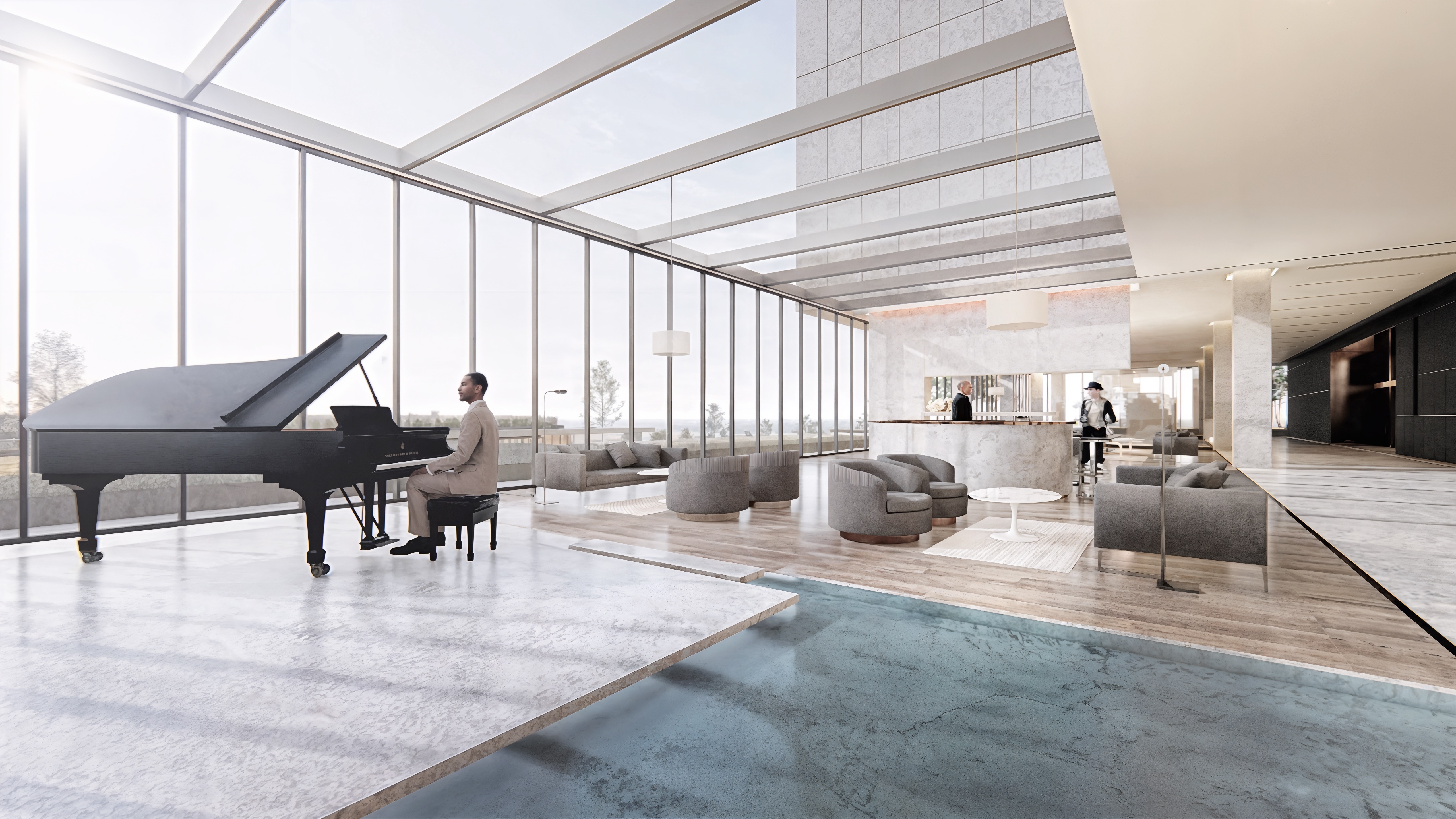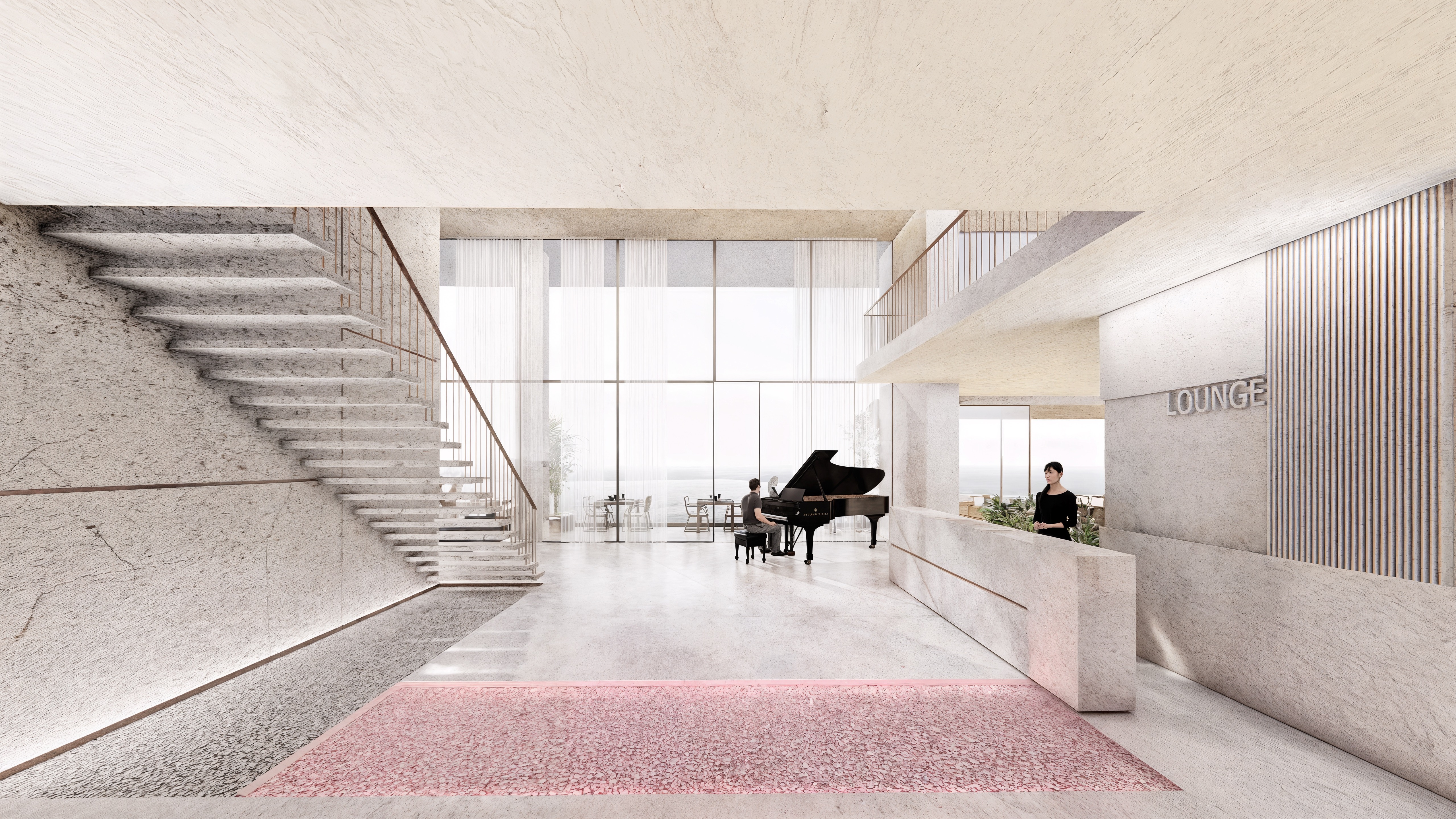 The project takes full advantage of the site’s natural slope, integrating it into the architectural design to create a layered and intuitive experience. A two-level base structure follows the topography and forms the foundational "shells" of the program. This base is then sculpted and opened at the center to form a generous, landscaped courtyard that becomes a key organizing element and social space within the project.