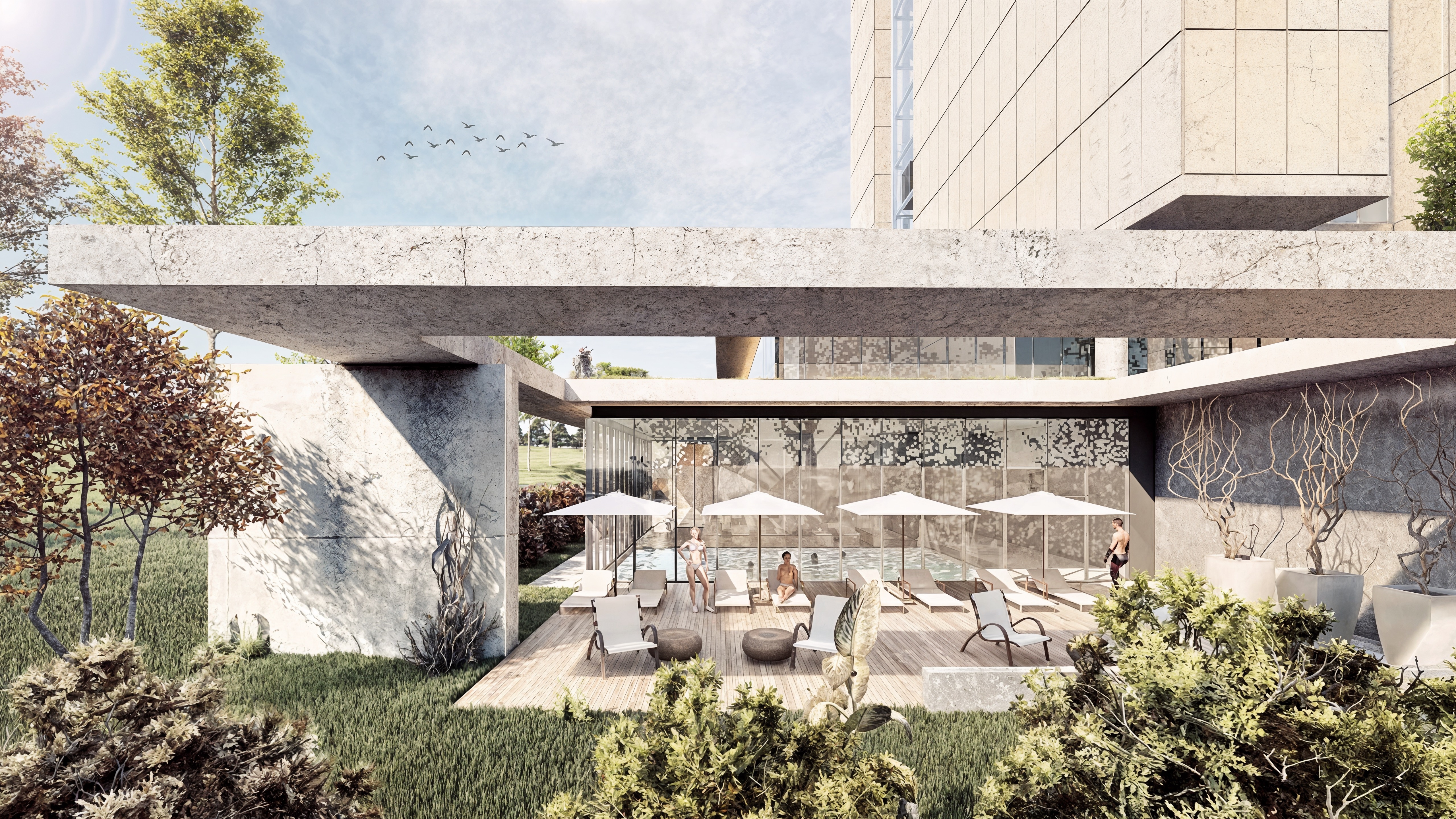 The design concept is based on a clear spatial and programmatic division, distributed across two primary architectural volumes, or "shells." These volumes are shaped in response to the site's natural topography and are separated by a central courtyard, which acts as the heart of the project - a communal space that brings light, air, and interaction into the built fabric.