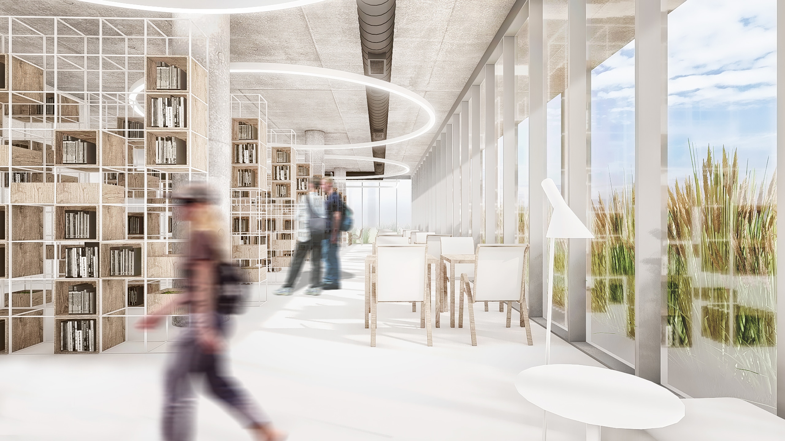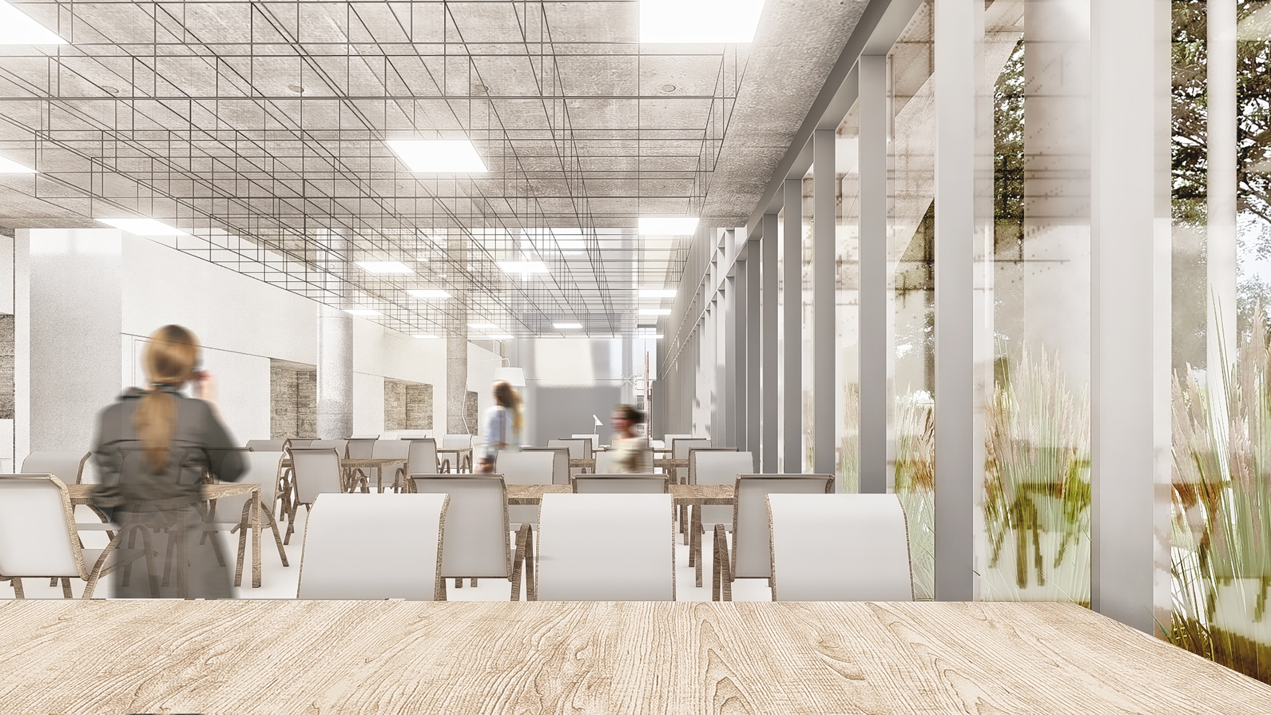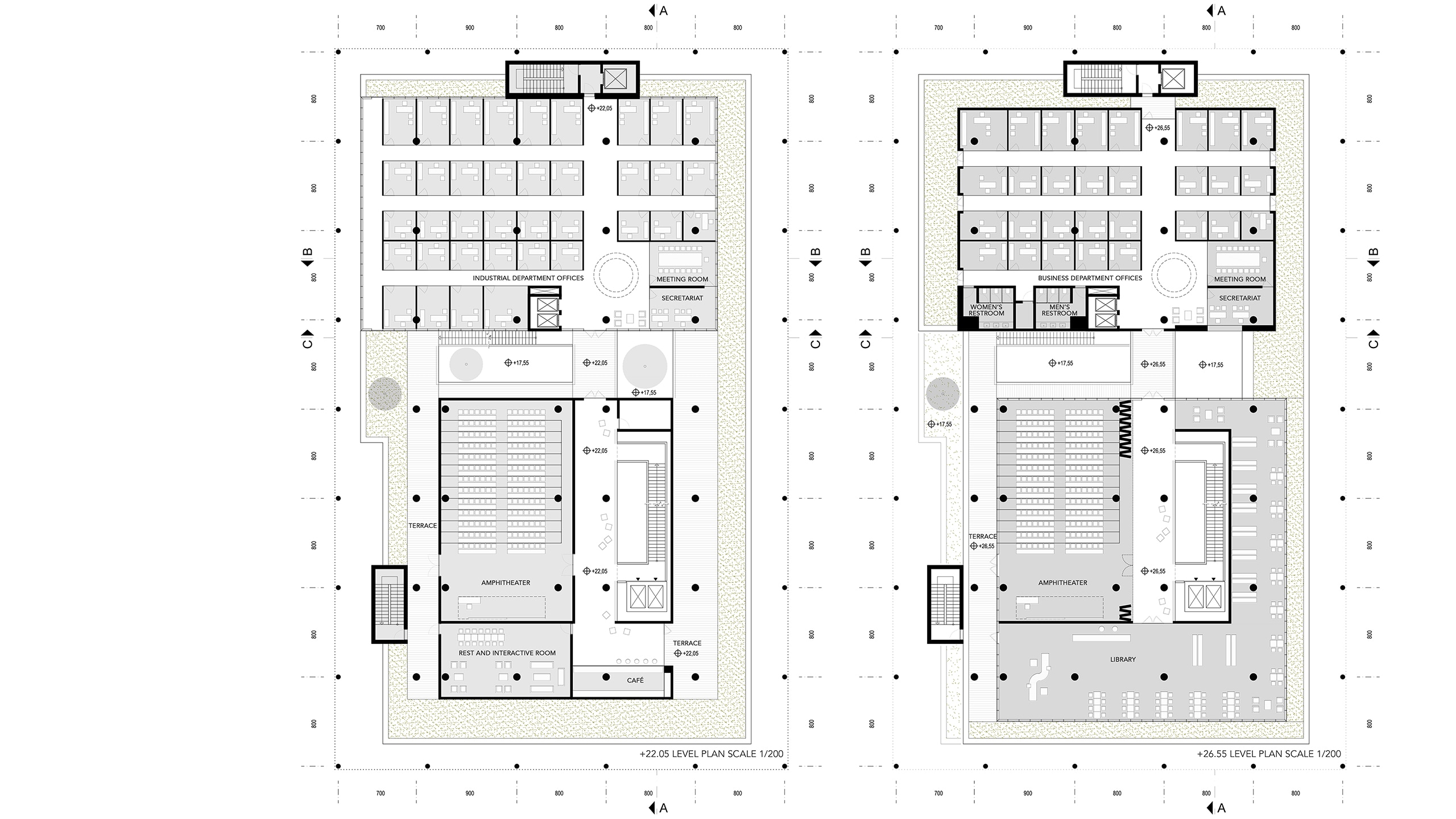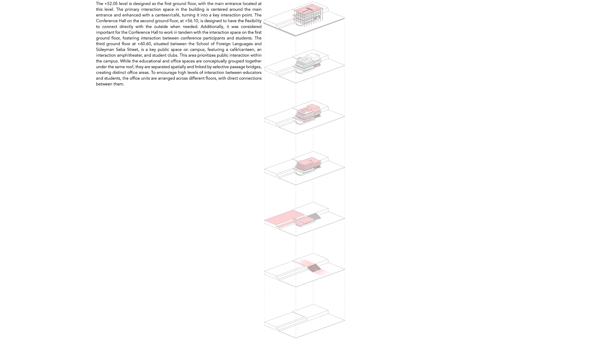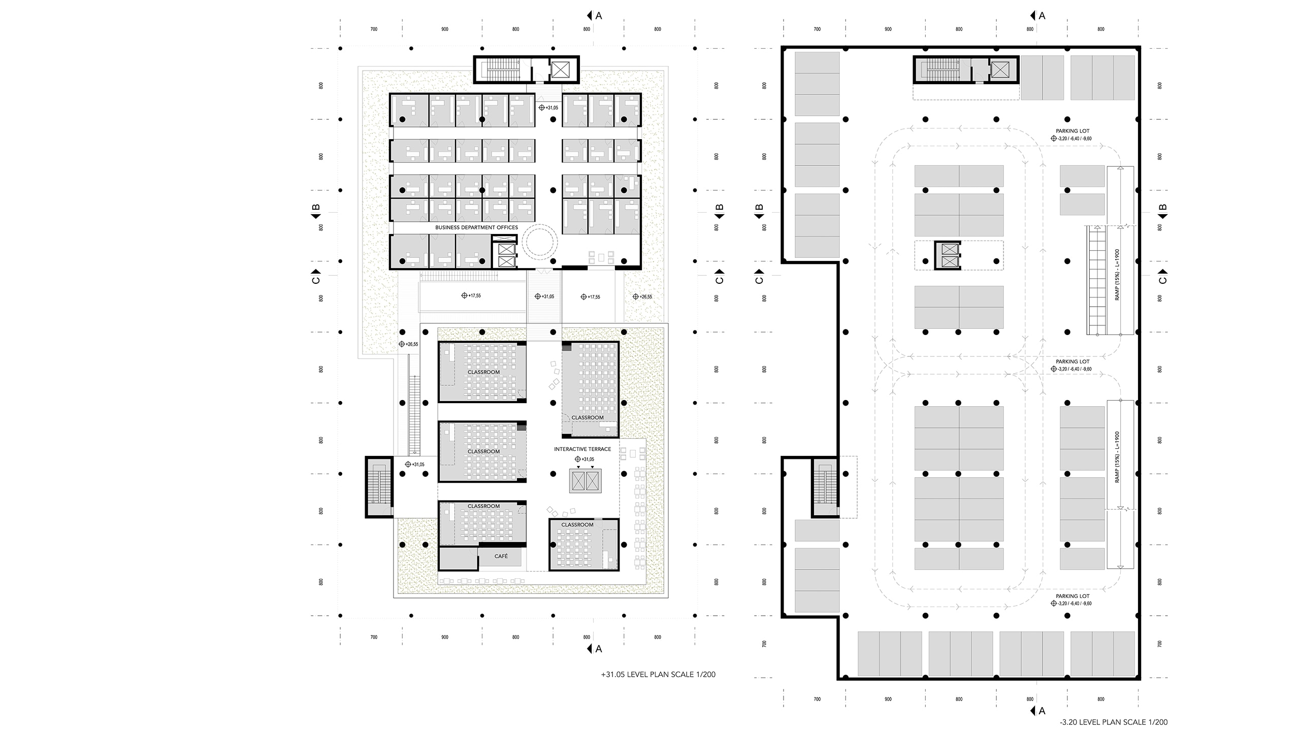 A central interaction node - consisting of a semi-open plaza, a café/canteen, and an amphitheater - acts as a daily gathering point for students, faculty, and visitors. This area fosters both planned and spontaneous meetings, transforming circulation into collaboration.