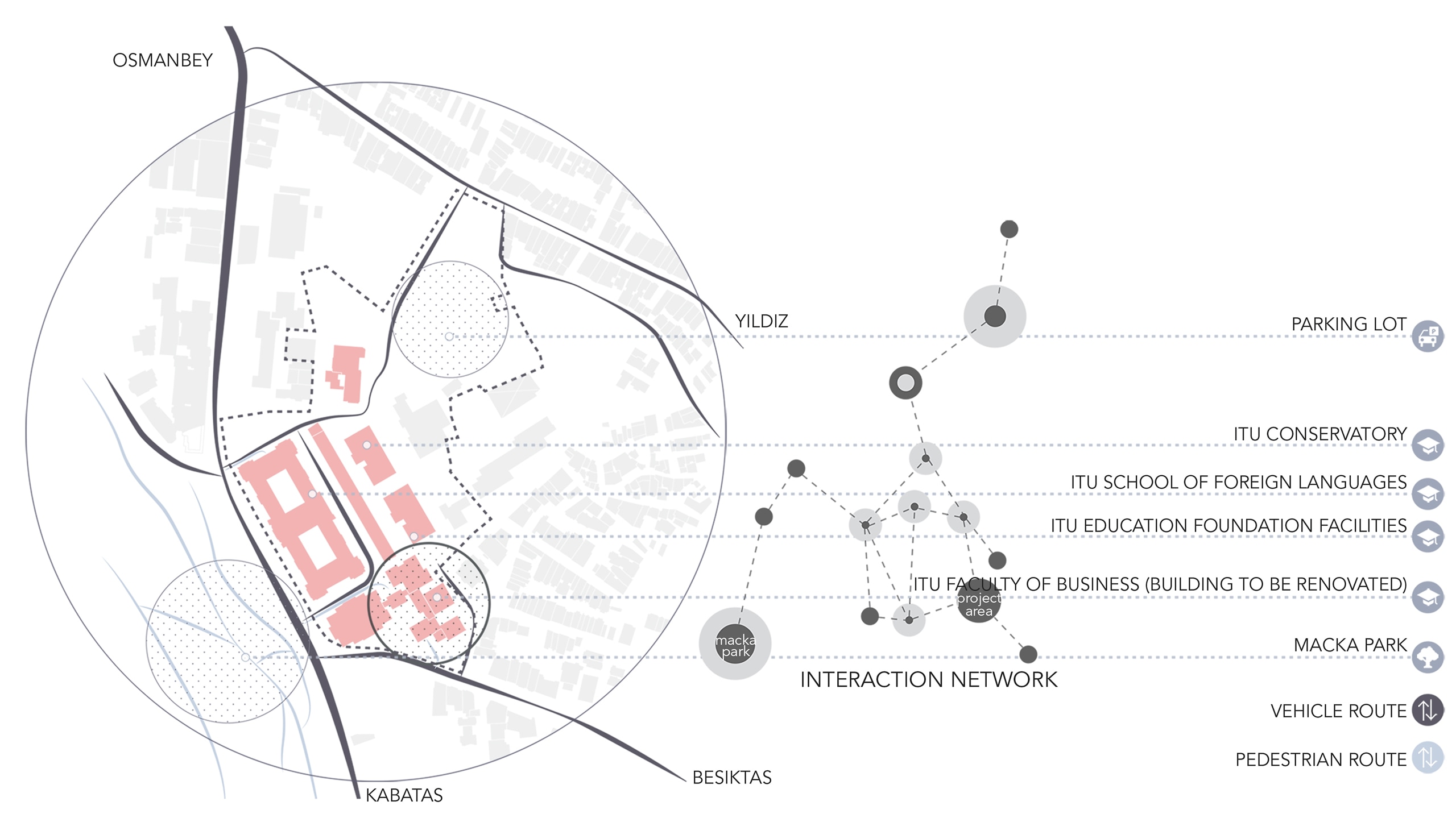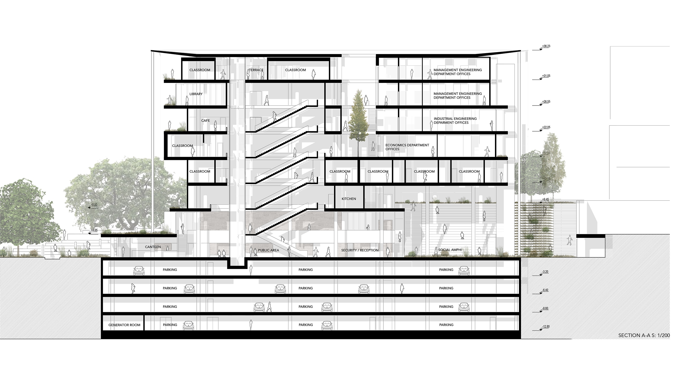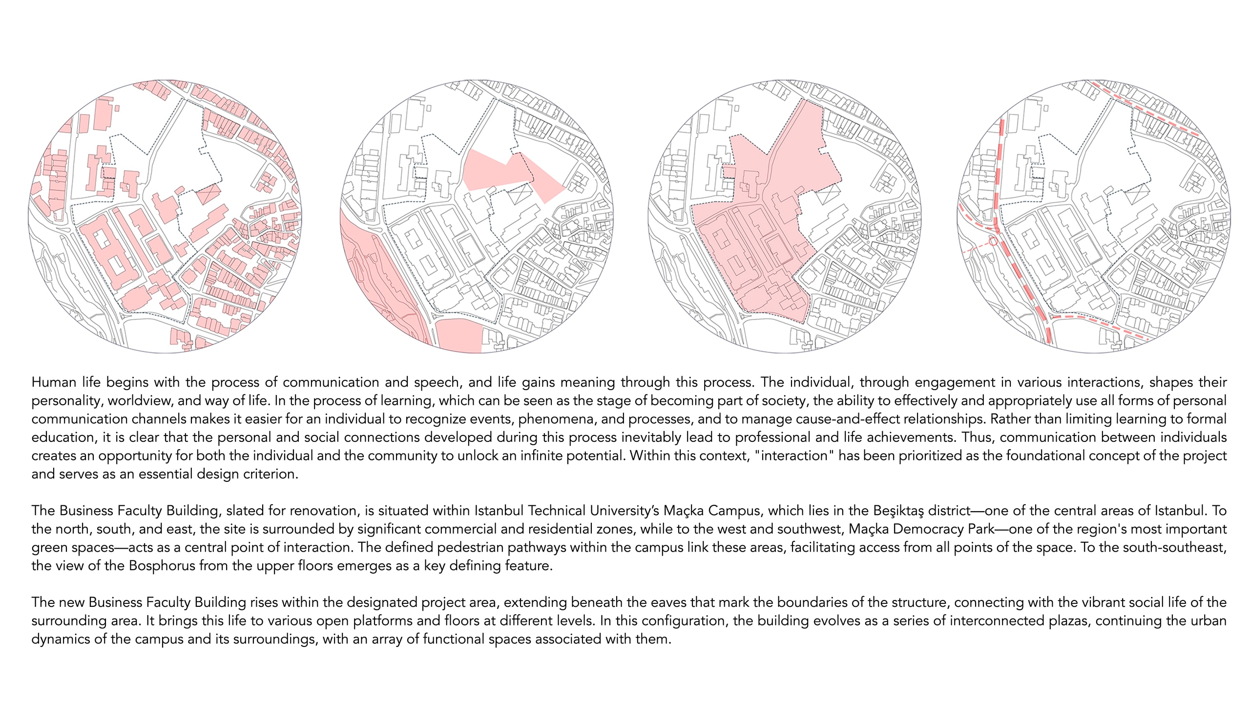 The proposed design for Istanbul Technical University’s Faculty of Business redefines the academic experience through a dynamic blend of interaction, sustainability, public space, and cultural continuity. Located in Besiktas, one of Istanbul’s most vibrant districts, the project is set within the ITU Macka Campus and responds to both urban context and educational needs with sensitivity and vision.