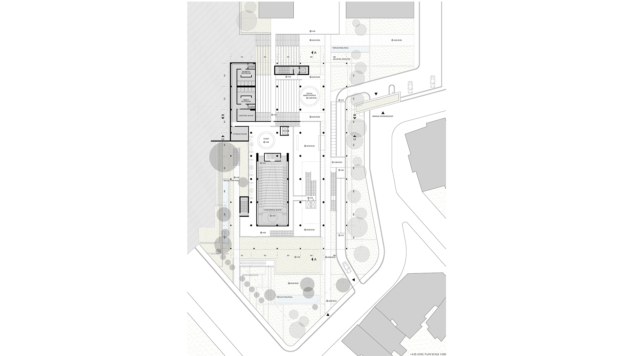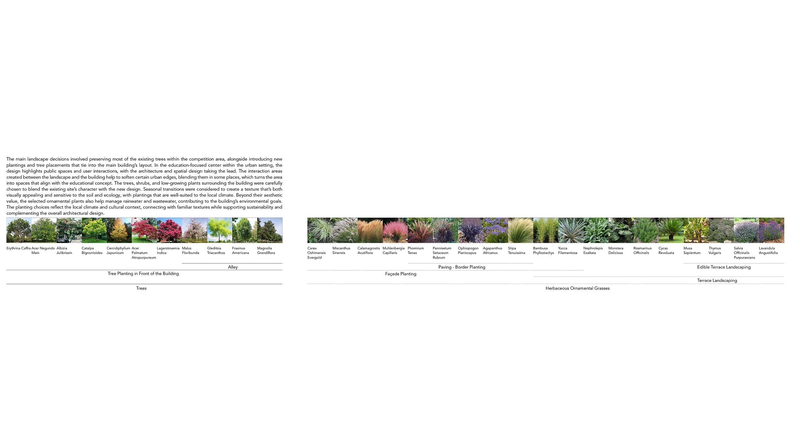 A diverse mix of species such as Catalpa bignonioides, Magnolia grandiflora, and Gleditsia triacanthos offers seasonal richness and environmental resilience. Low shrubs and grasses like Carex oshimensis, Miscanthus sinensis, and Stipa tenuissima are used in terraces, courtyards, and building edges to soften urban boundaries and enhance user experience.