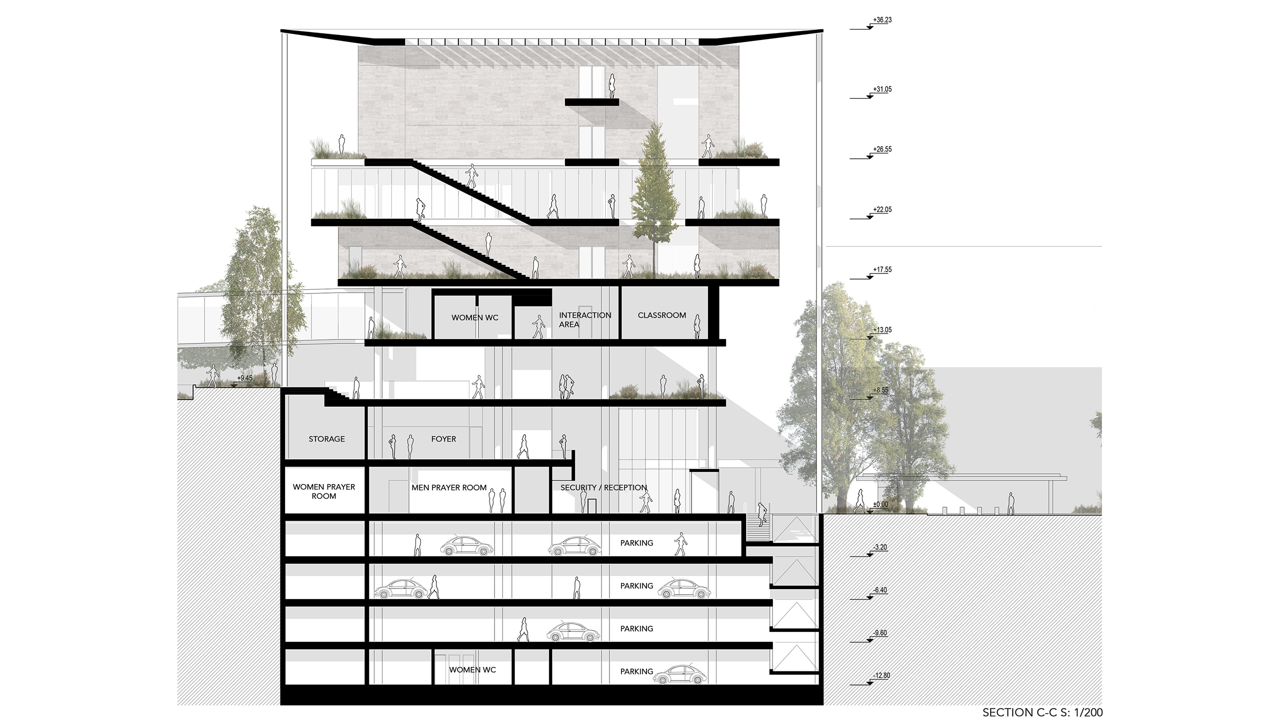 The core design idea revolves around "interaction": the belief that communication shapes both individuals and communities. Inspired by the philosophy that meaningful encounters lead to transformative experiences, the project places human connection at the center of the architectural concept.