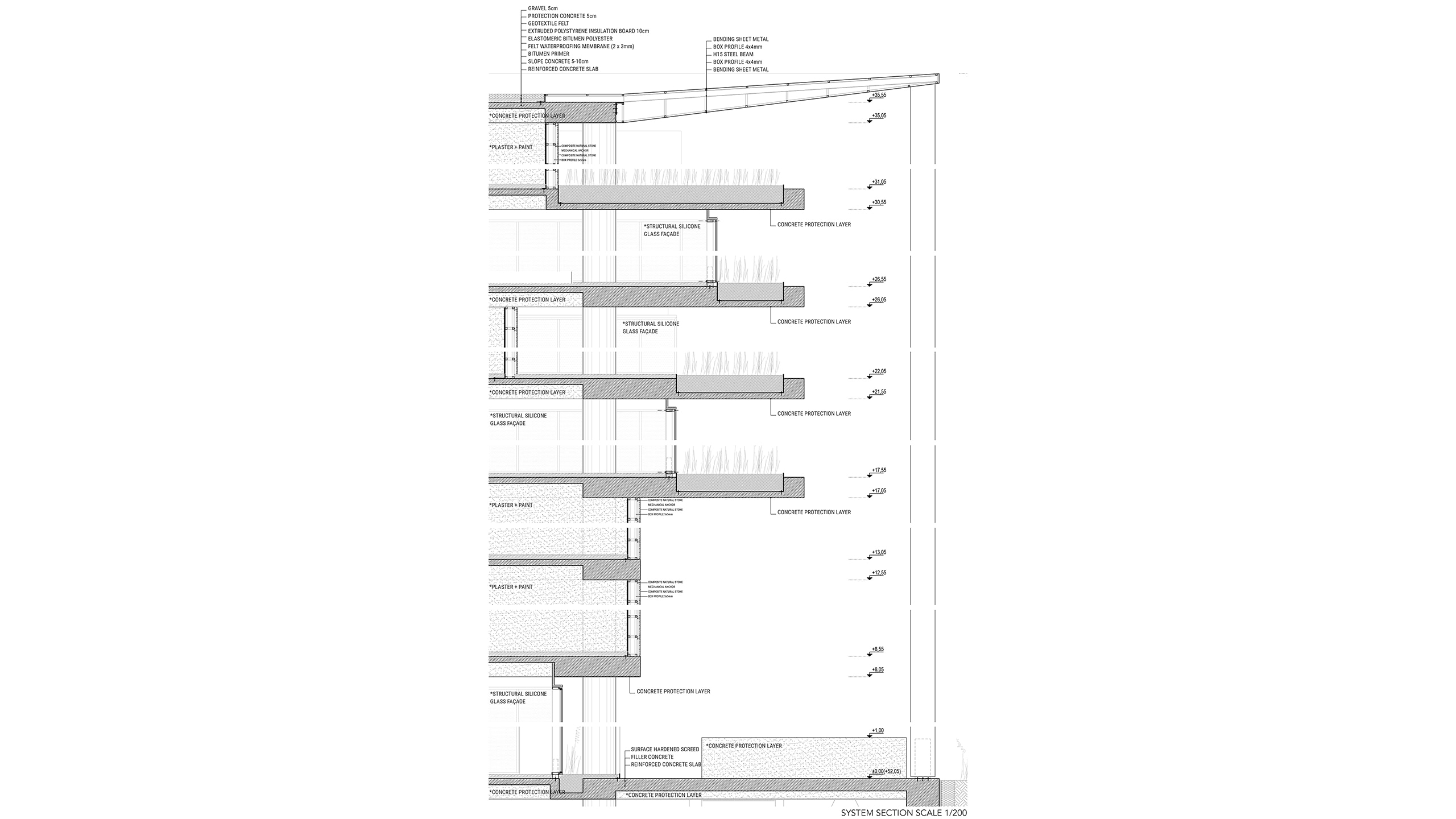A large canopy unifies all levels and creates open, semi-open, and closed spaces that function together in all seasons. The design encourages visibility, openness, and a sense of "being together" across all floors - from the courtyard to the terraces.