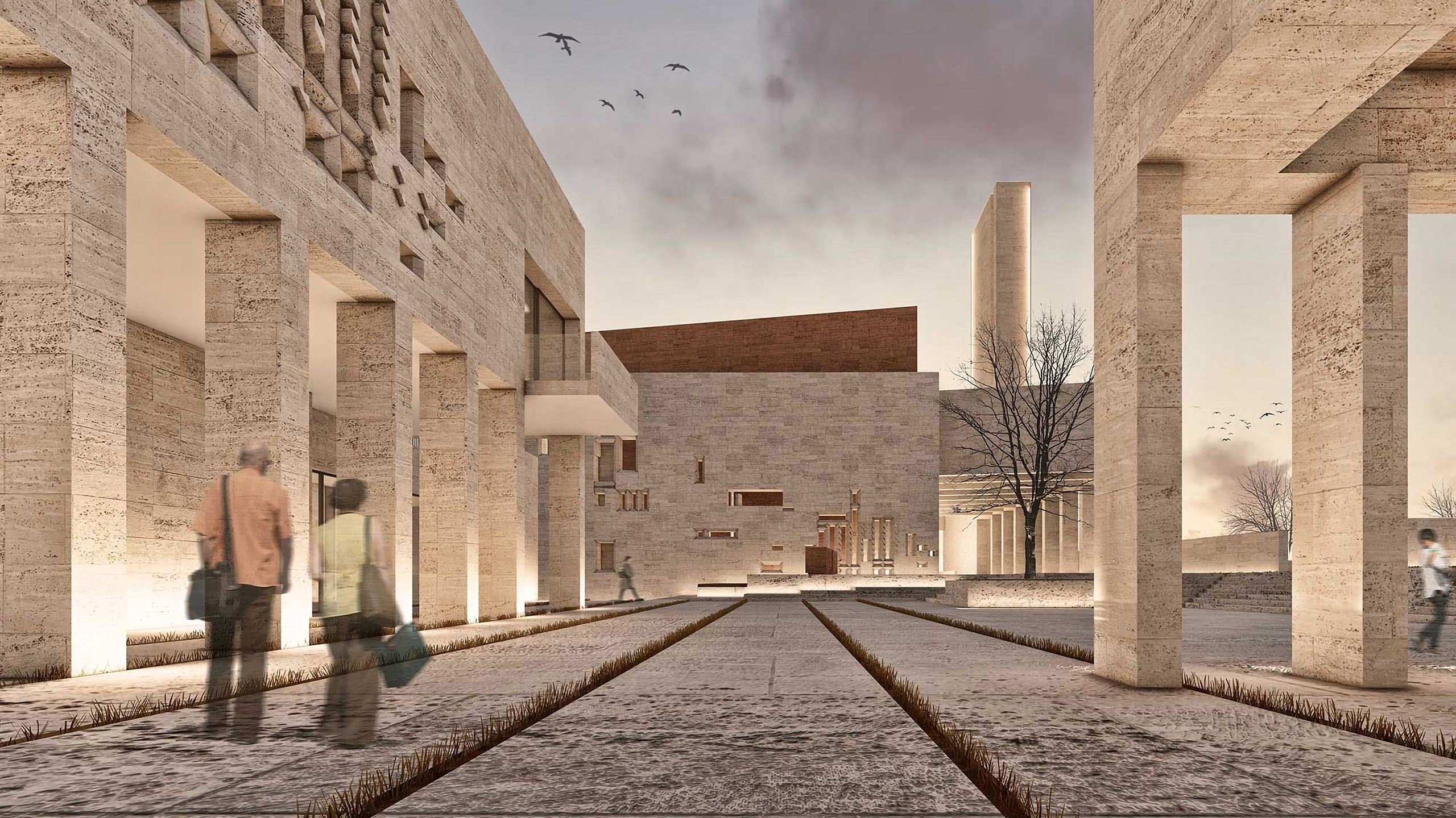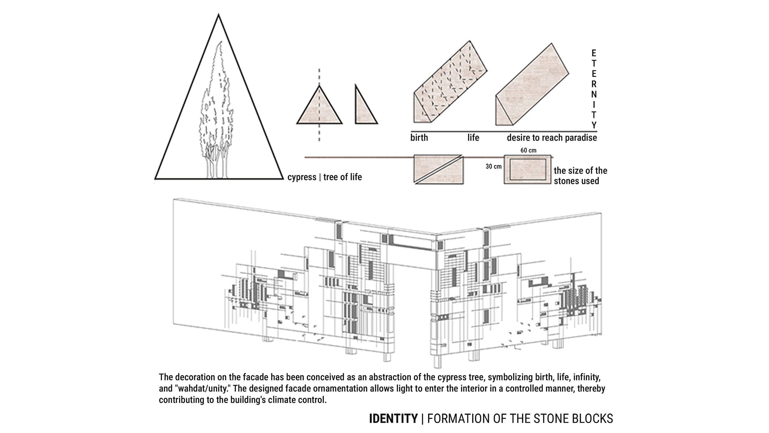 The façade design is characterized by recessed arcades, shaded colonnades, and symbolic motifs. Decorative patterns reference the cypress tree, a cultural emblem of life, death, eternity, and unity. These patterns function not only symbolically but also environmentally, allowing filtered daylight and promoting passive cooling. Some stone blocks, serving as sun breakers while enriching the visual texture.