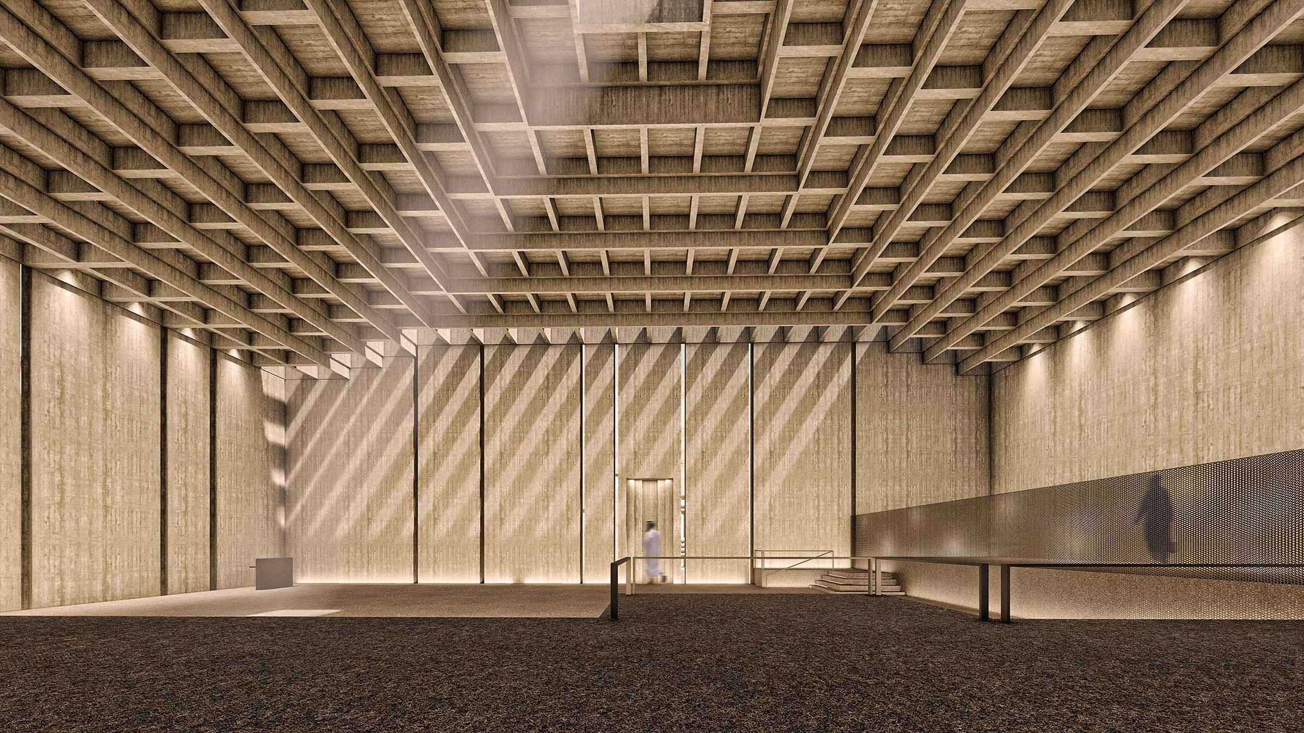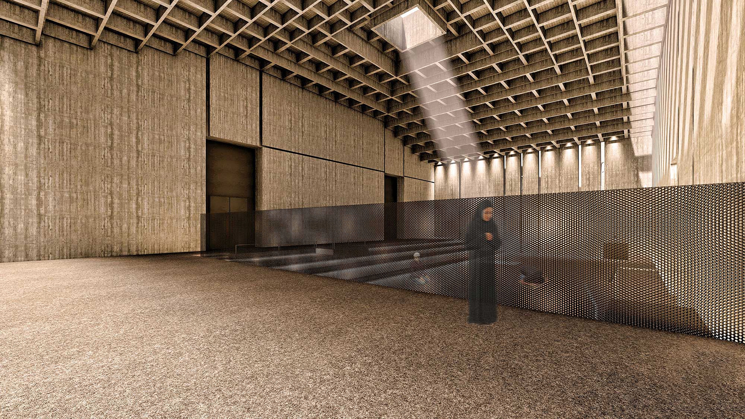 Natural light enters through carefully controlled clerestory openings, enhancing the sense of infinity and serenity. The water feature at the floor level further enhances this spiritual atmosphere, encouraging introspection and humility.