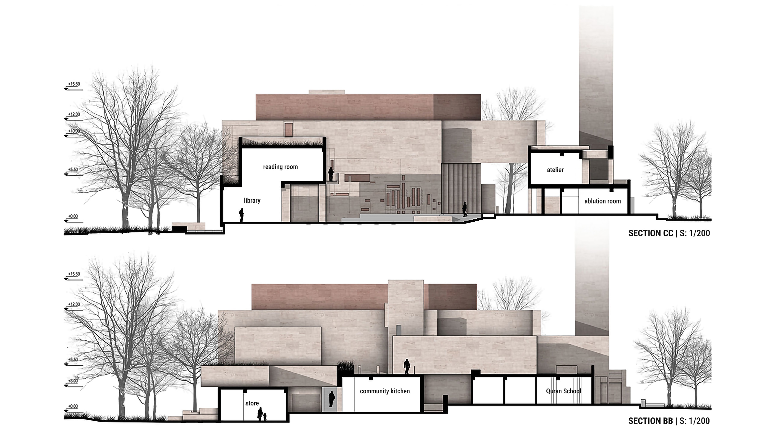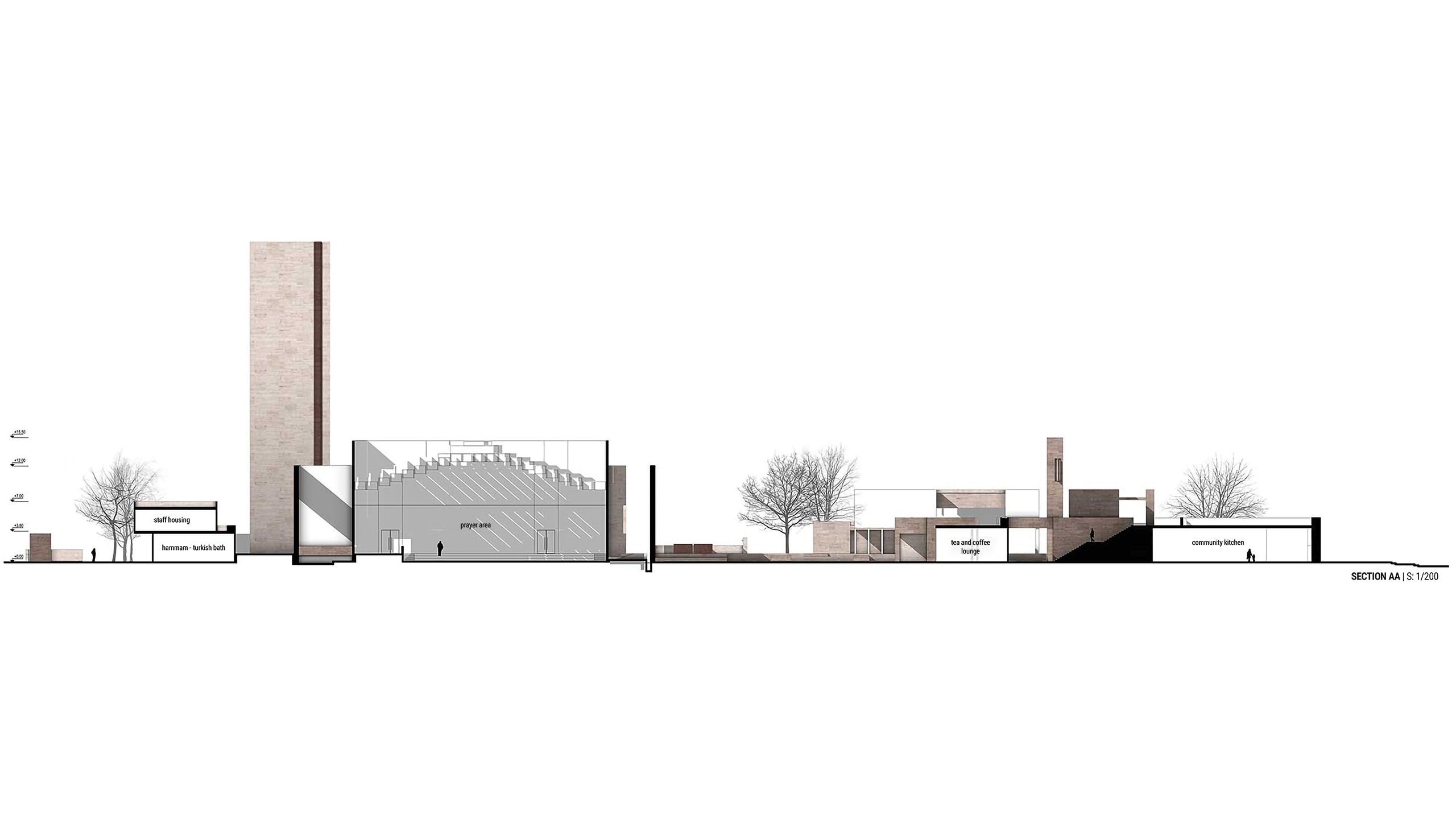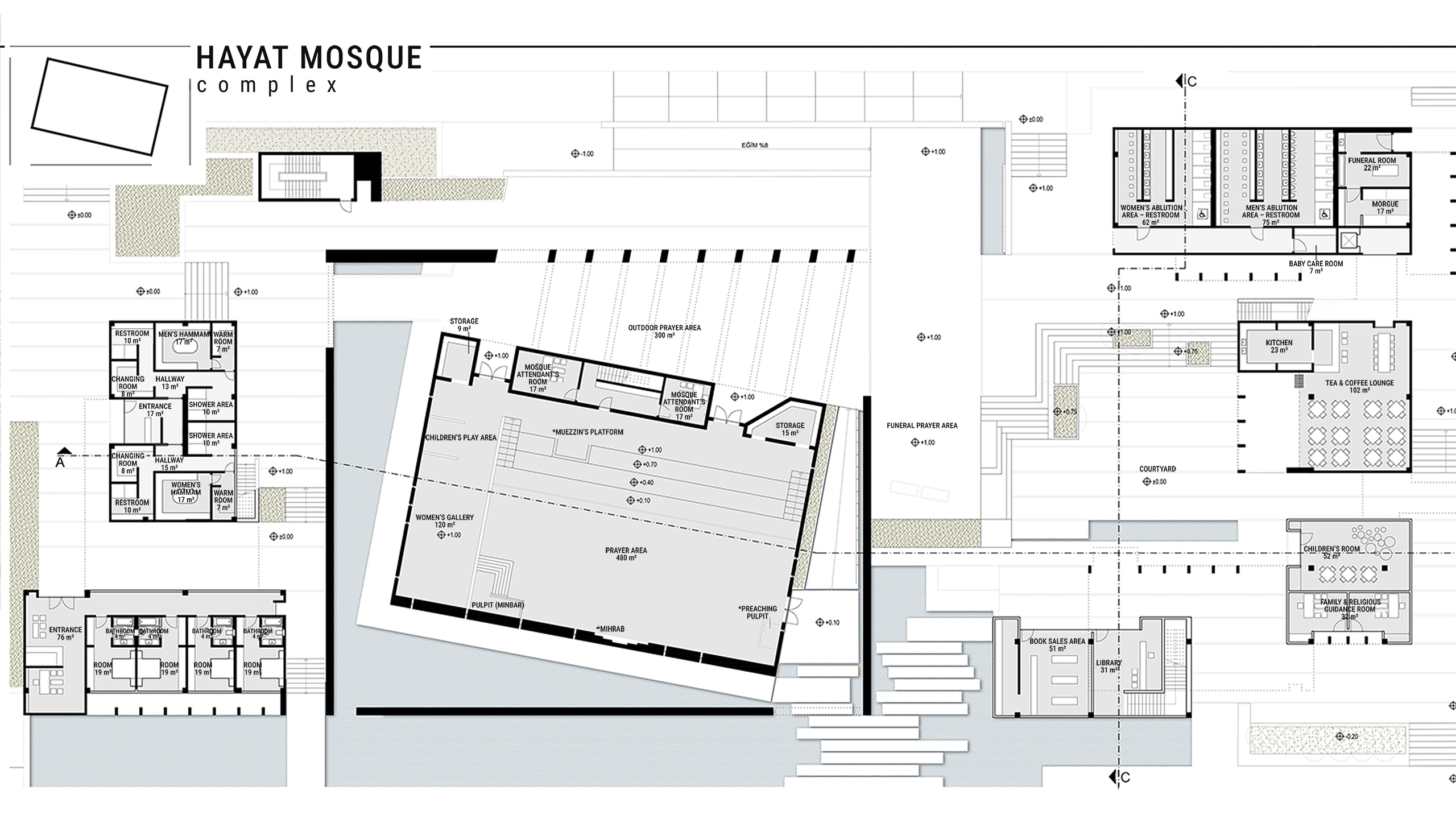 Around the main courtyard, traditional mosque functions such as ablution facilities, shadirvan, prayer stones, and a funeral prayer area are placed. Complementary amenities like a coffeehouse, library, bookstore, and children’s playroom support social interaction, while maintaining reverence and accessibility.