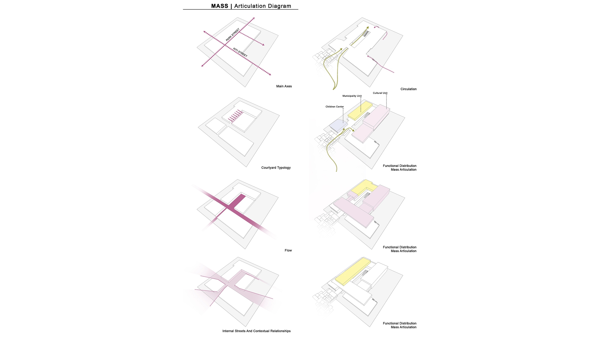 These axes intersect at a central courtyard, designed to host daily activities, gatherings, and cultural events. A small amphitheater, shaded arcades, and active street frontages encourage public use throughout the day.