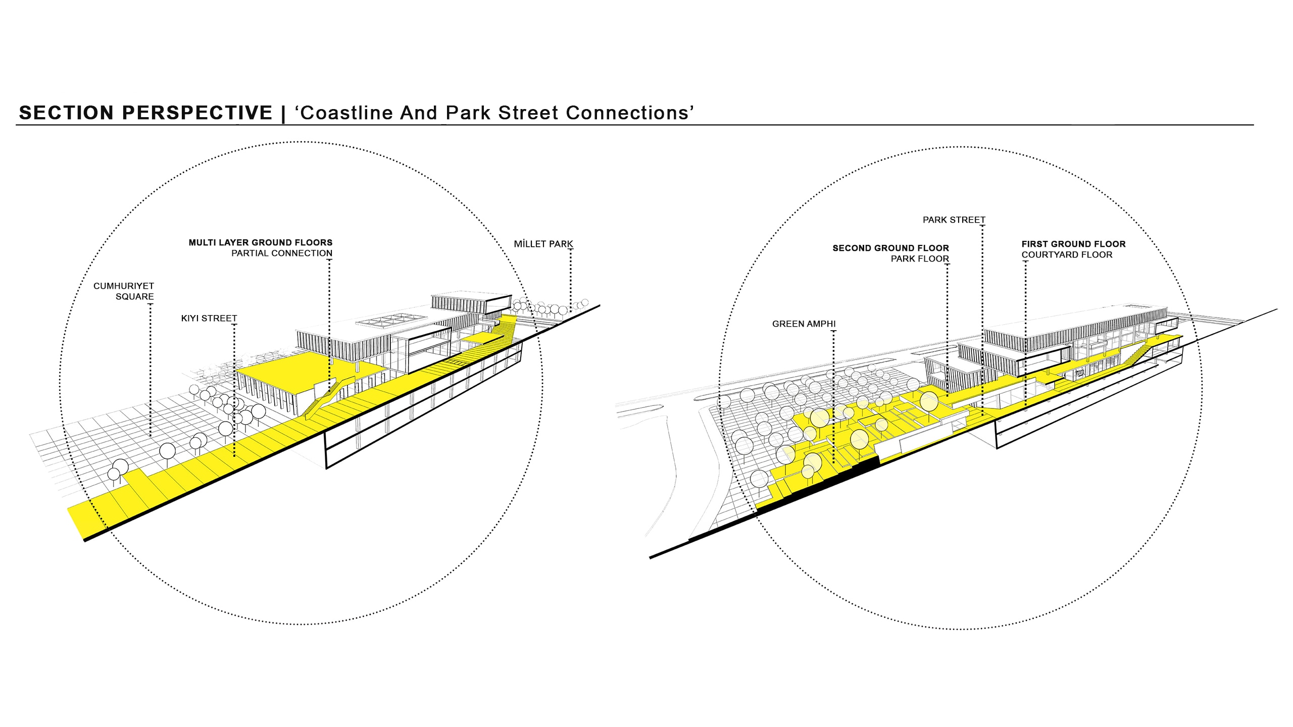 The project introduces a pedestrian-focused spine that links the main city square to the coastal park and a major urban landmark. This axis is extended through the site, integrating it with the surrounding neighborhoods and green corridors.