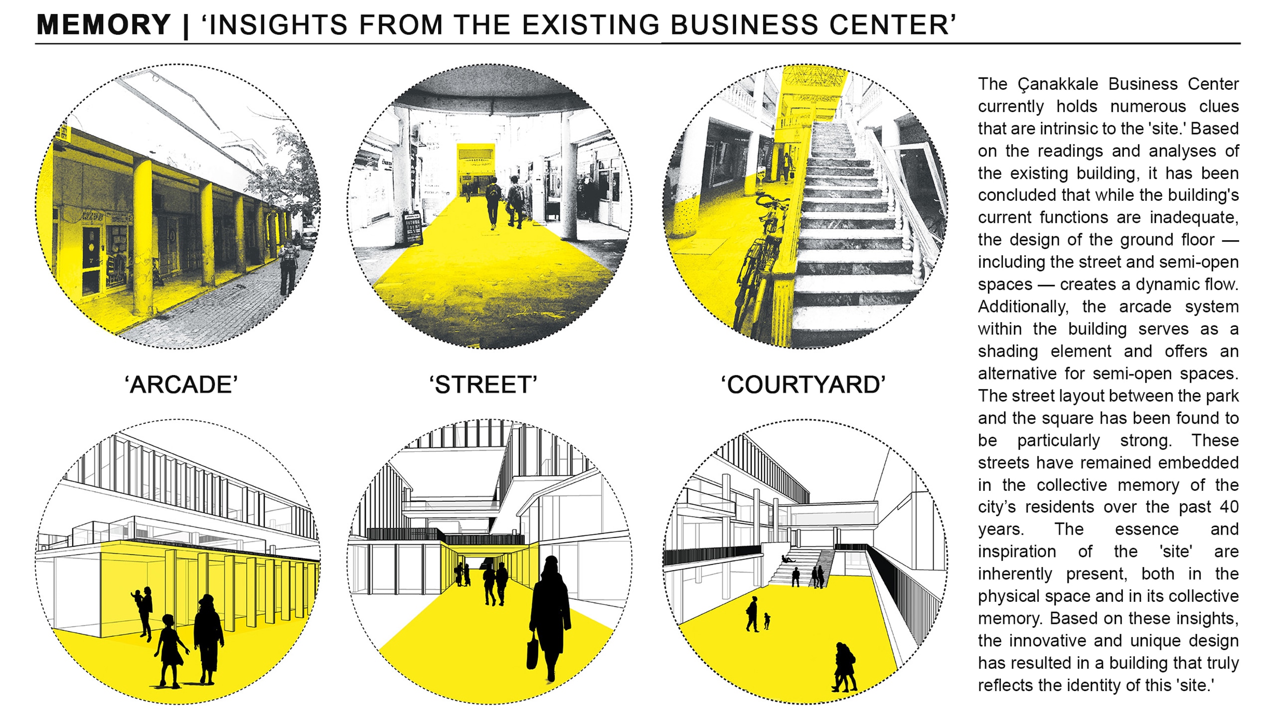 The proposal reimagines a familiar but outdated city block that currently houses a commercial center. While the existing structure lacks functional adequacy, it retains spatial memories - such as arcades and pedestrian passages - that have shaped the local identity over the past 40 years.
