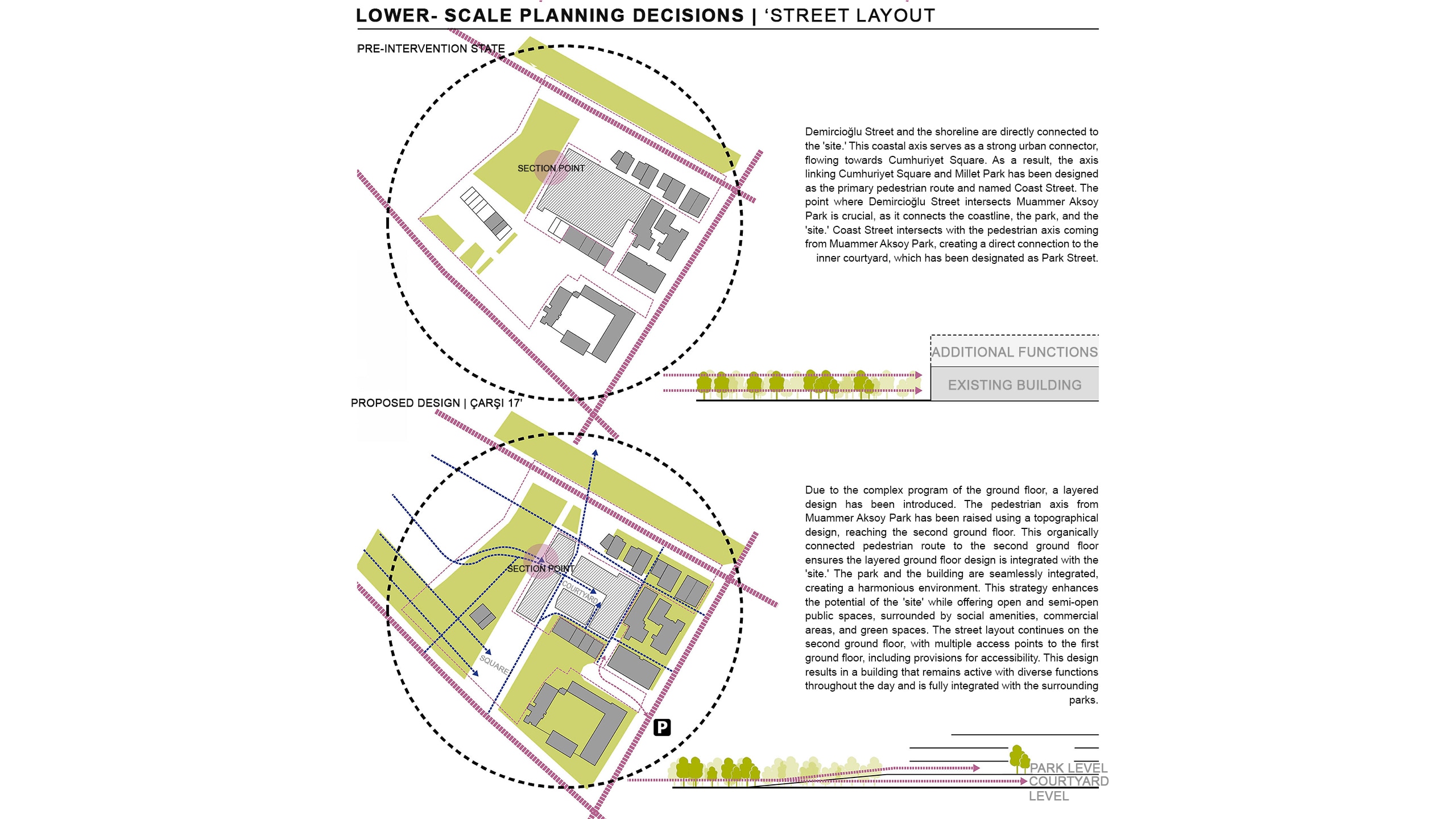 To enhance walkability and public space continuity, a portion of an existing street is pedestrianized. New urban flows are introduced from nearby parks to activate the site from multiple directions, transforming it into a new civic focal point.