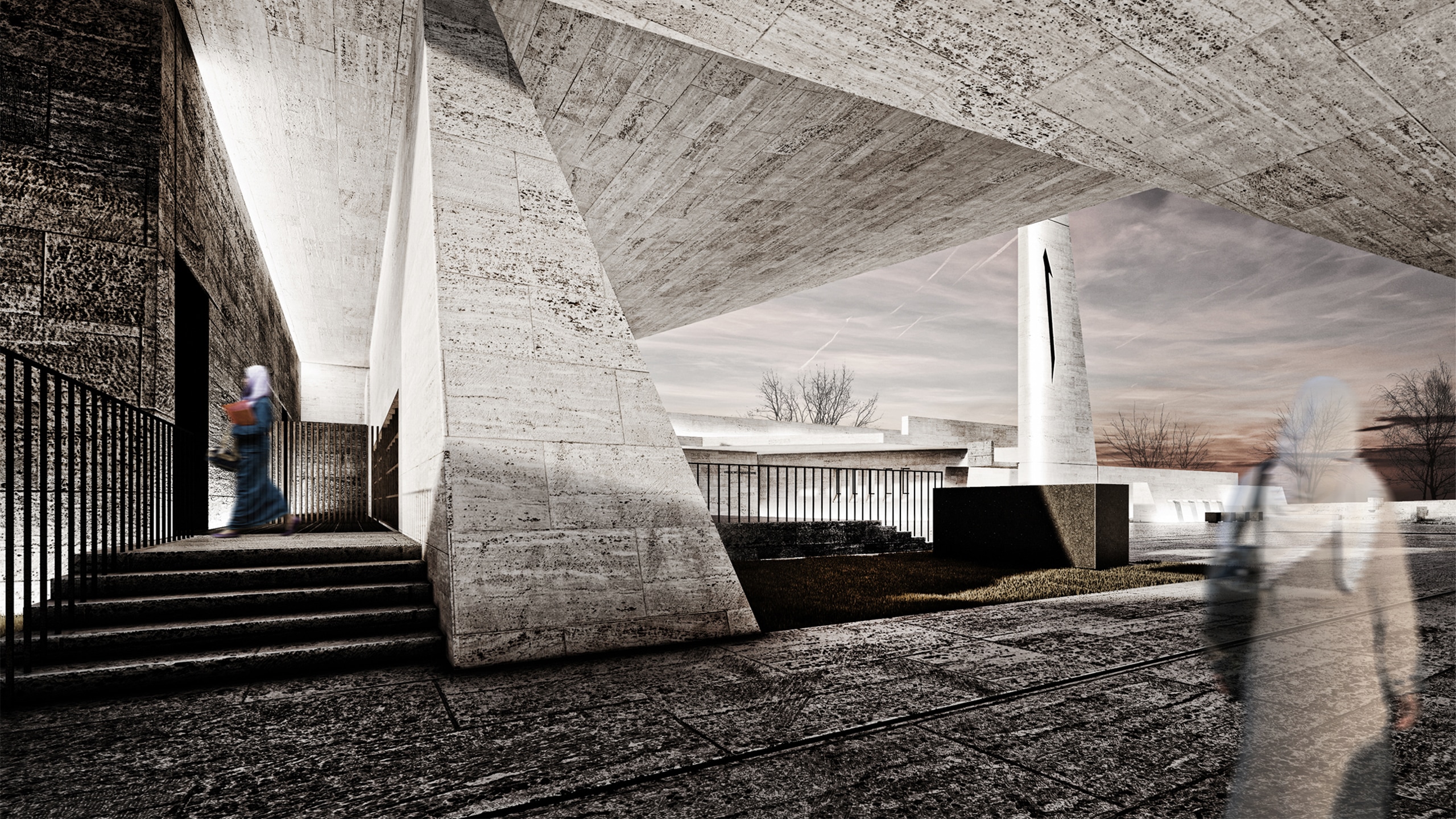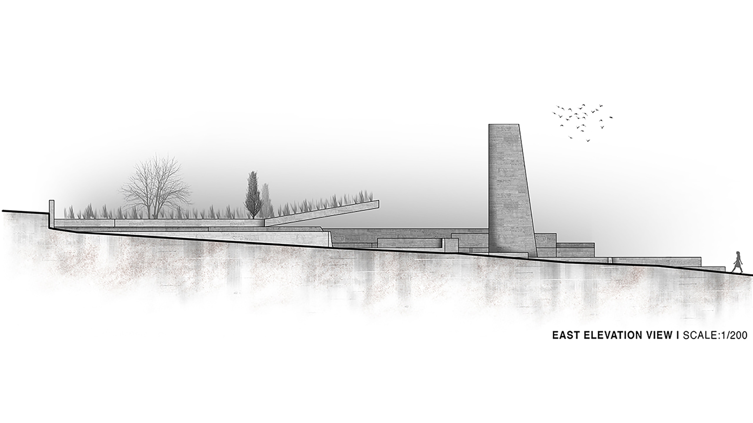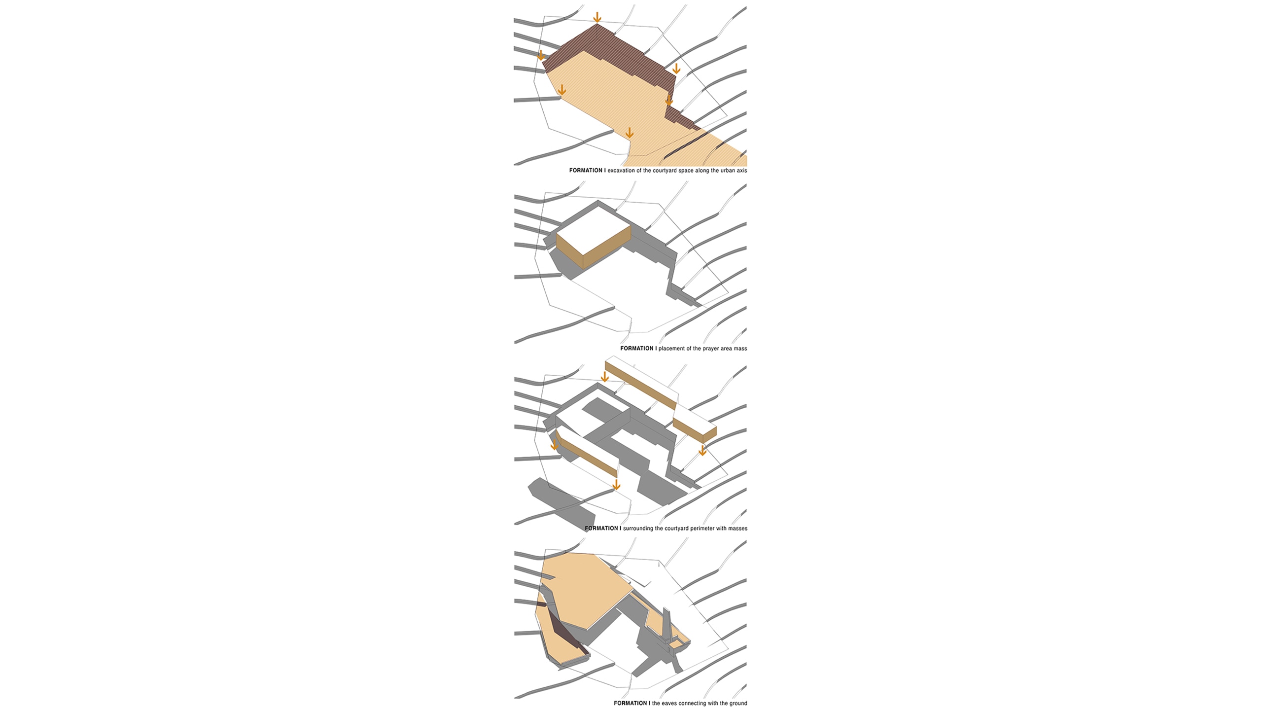 A canopy structure connects all the volumes, sheltering the spaces and symbolizing unity. Its upward-folding edge gestures toward the sky, embodying the vertical aspiration of the spiritual journey.