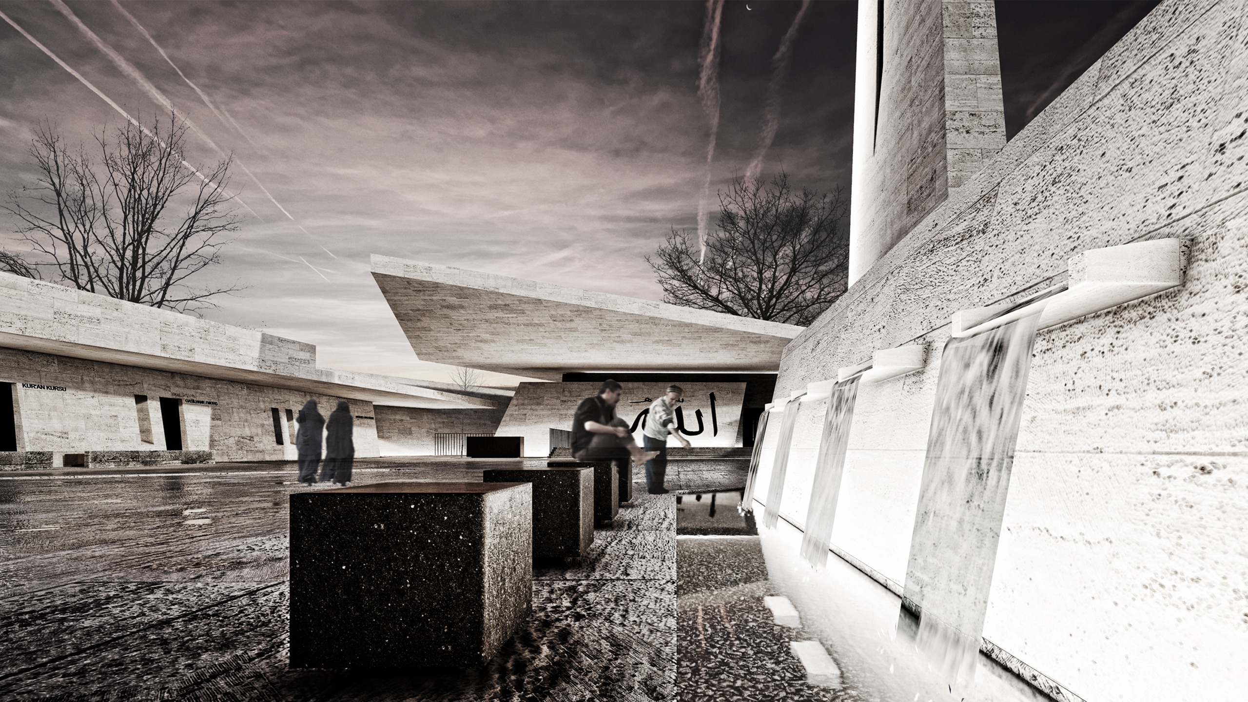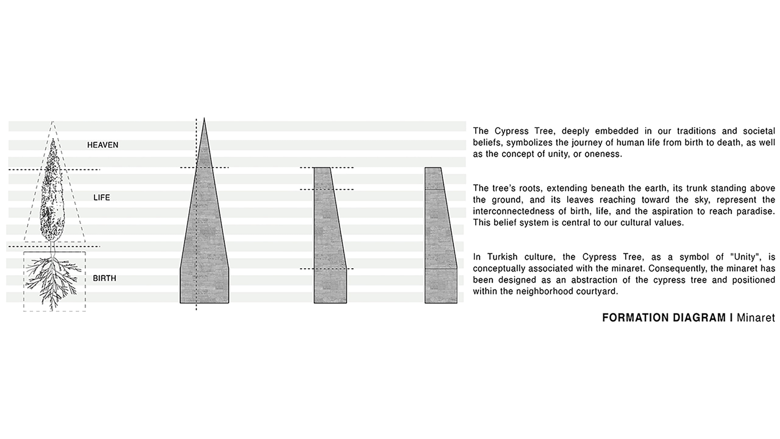 The minaret is conceived as an abstracted cypress tree: a symbol of life, unity, and the human journey toward the divine. In Turkish-Islamic culture, the cypress tree’s form embodies birth, life, and the longing for paradise. The minaret stands in the courtyard as a spiritual beacon rooted in this cultural metaphor.