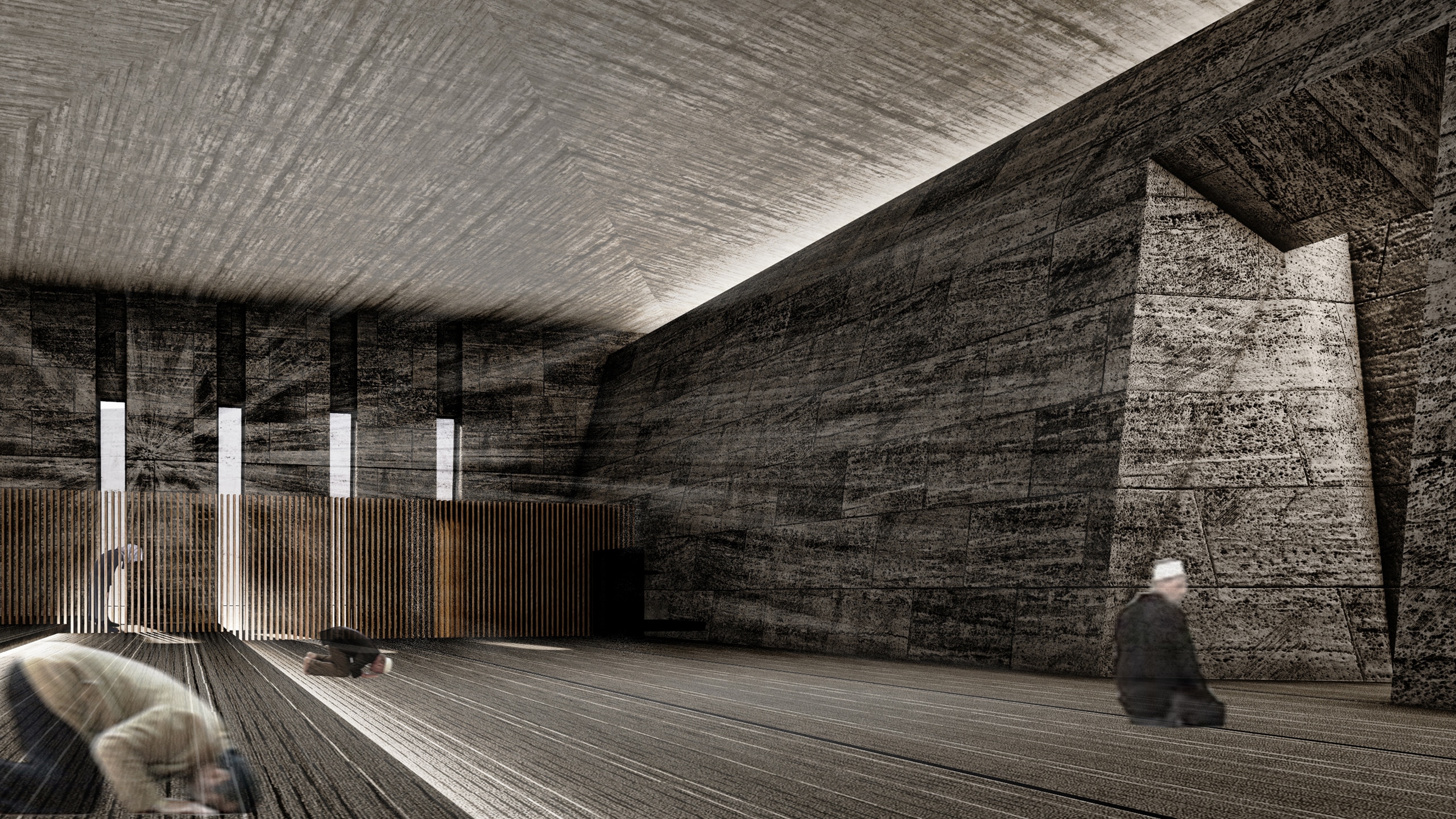 The worship hall, embedded into the earth along the qibla direction, creates a secluded, monastic ambiance. On the opposite sides, it is lifted from the ground and bordered with inner gardens and reflective water pools.