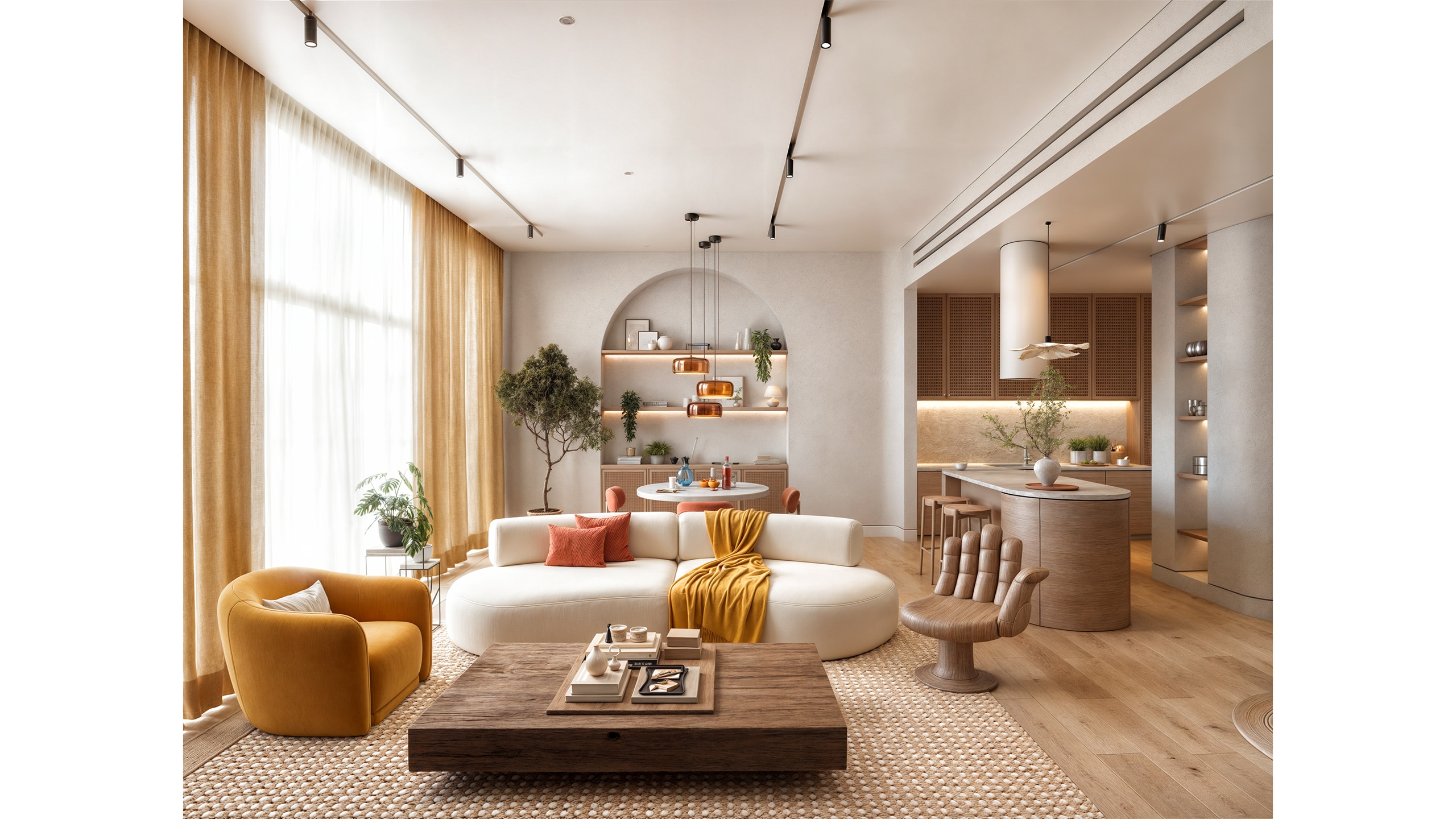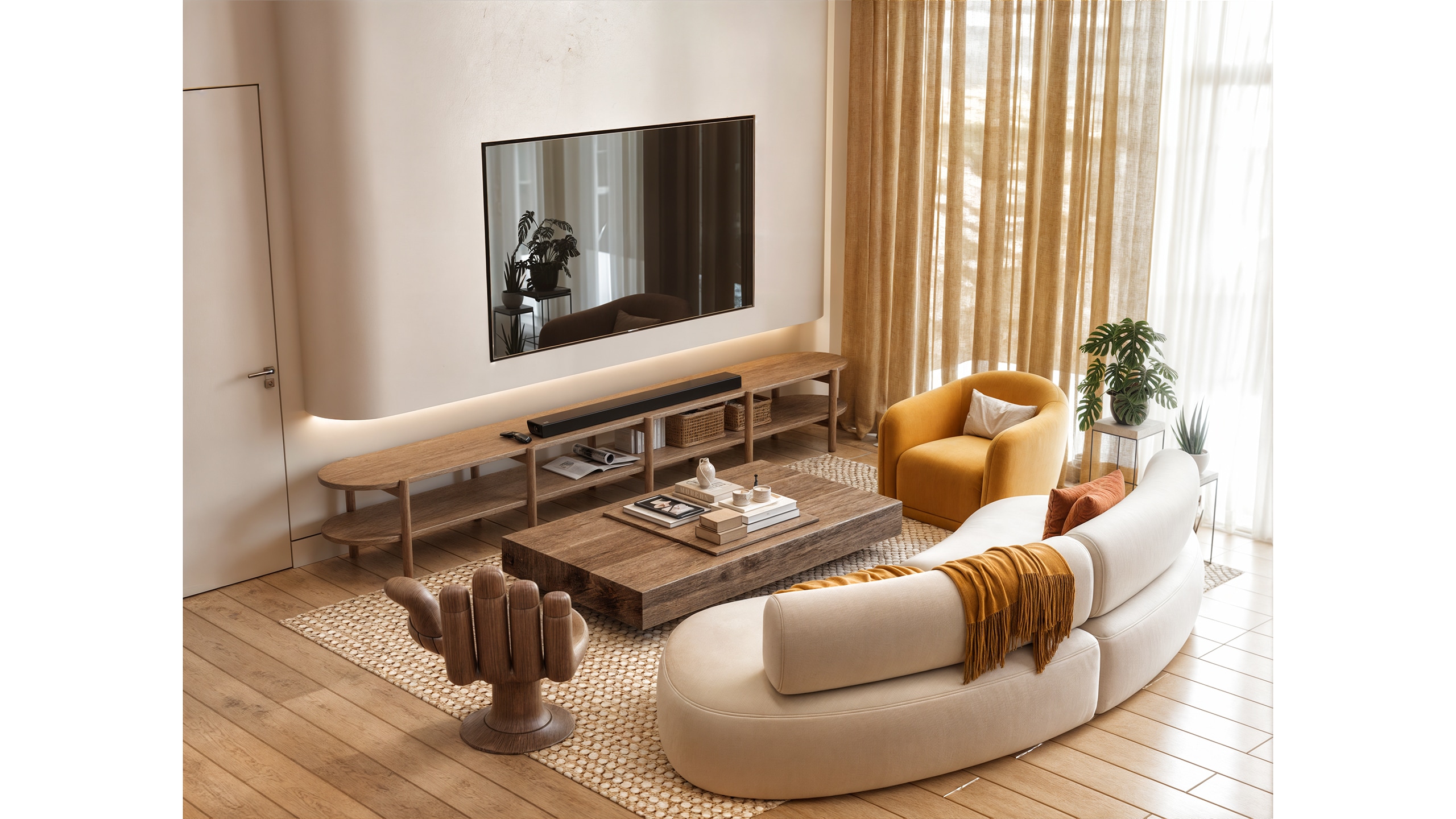 Curved, sculptural furniture pieces were selected to reflect the home's natural aesthetic. A custom TV unit with fluid wooden shapes and a subtly thickened wall for mounting the television adds depth and interest to the living area. The choice of a soft beige sofa, combined with colorful accent cushions, a mustard armchair, and a solid wood coffee table and a wood hand-shape chair contributes to the warm, tactile environment.