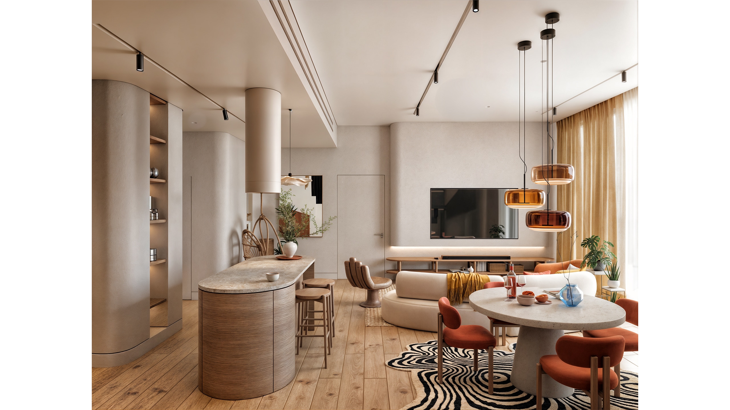 The project stands out with its clean architectural detailing. Frameless doors and recessed baseboards maintain a minimalist and modern appearance, while curved ceiling lights and recessed rail systems provide a layered lighting scheme that supports the eclectic narrative.