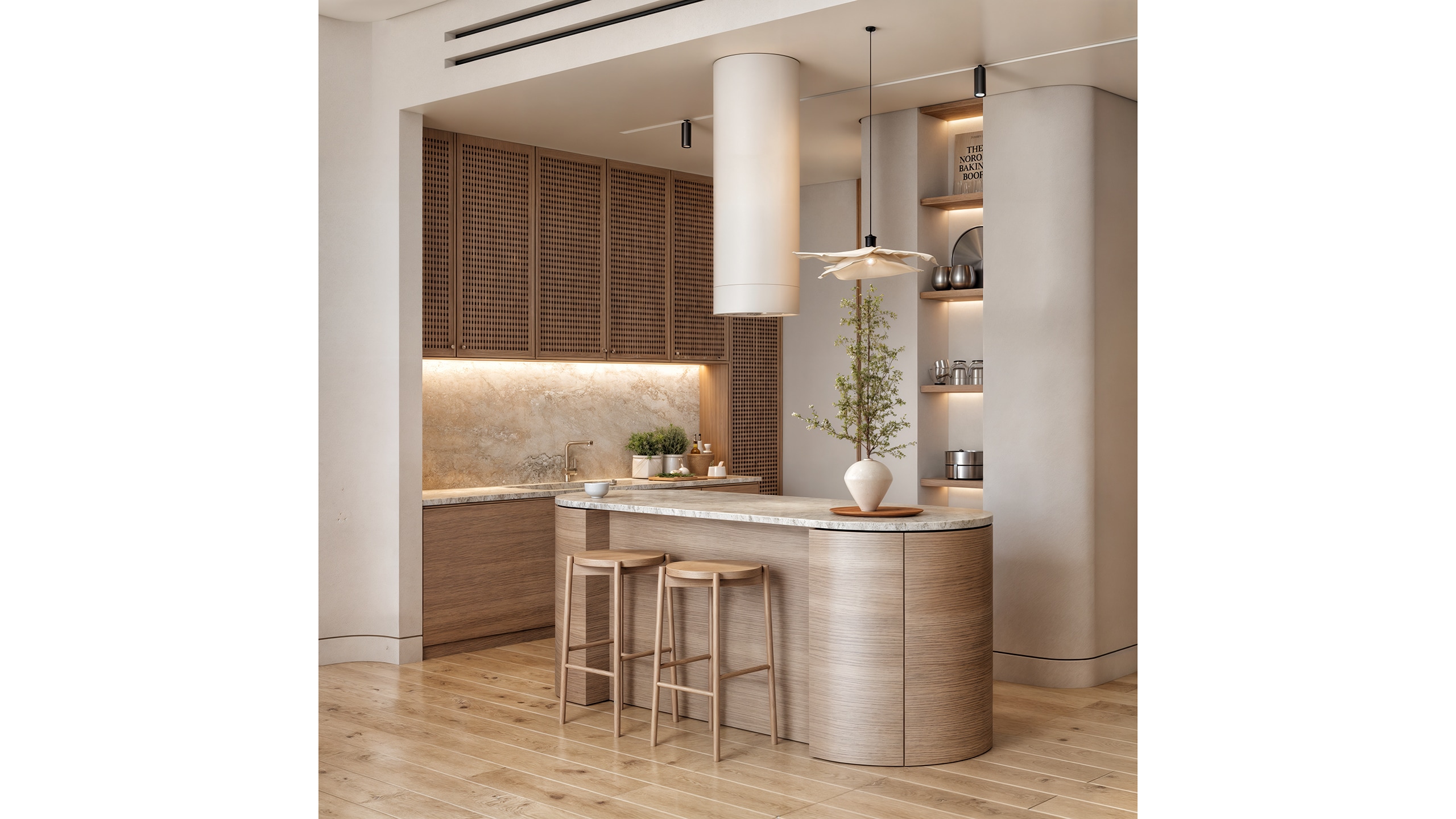 Complementing the flooring, kitchen cabinets and the island base were finished in a darker-toned wood, creating a contrast. These surfaces were paired with natural stone countertops in wet areas to enhance texture and visual interest.