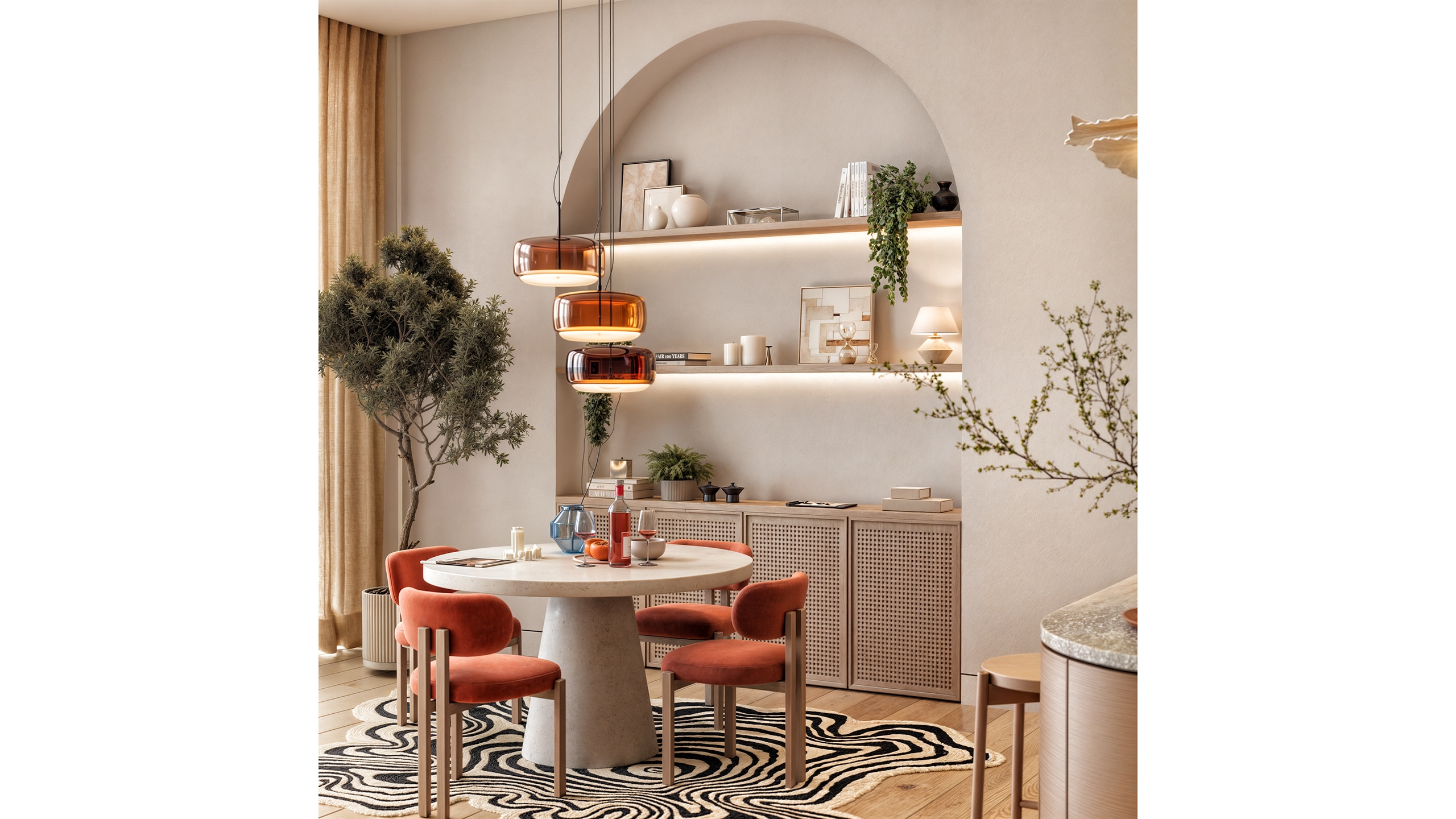 In the dining area, wooden chairs upholstered in brick-red fabric were paired with a round terrazzo table featuring organic contours. Beneath the table, a zebra-patterned rug adds contrast and a sense of eclectic playfulness. A wooden console placed behind the dining set supports the cohesive material language, with a curved niche above housing minimalist decorative pieces.