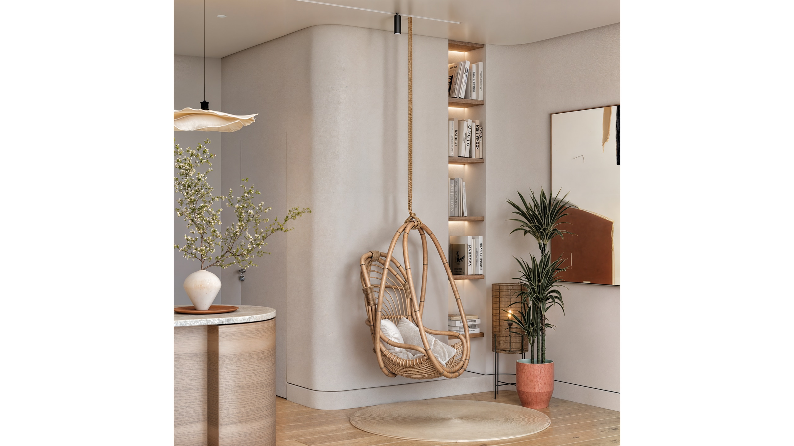 One of the most inviting spaces is the transition zone between the living area and master bedroom, where a swing chair, a plant, and a reading niche with built-in shelving transform a simple corridor into a meditative retreat.