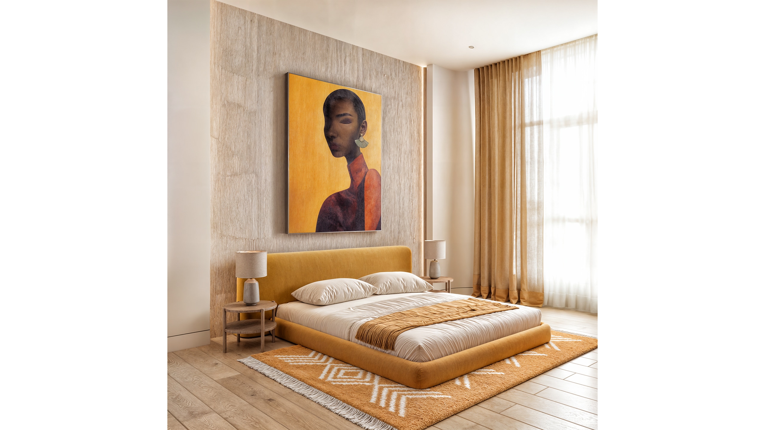 The master bedroom continues the design language of the living areas. The wall behind the bed was subtly thickened on either side to accommodate concealed lighting, with a central wood panel that introduces warmth and texture. Matching wooden nightstands, a mustard-colored bed base, and coordinated textiles in earthy tones preserve visual consistency. A carefully selected artwork above the bed completes the setting, reinforcing the color scheme and tranquil atmosphere.