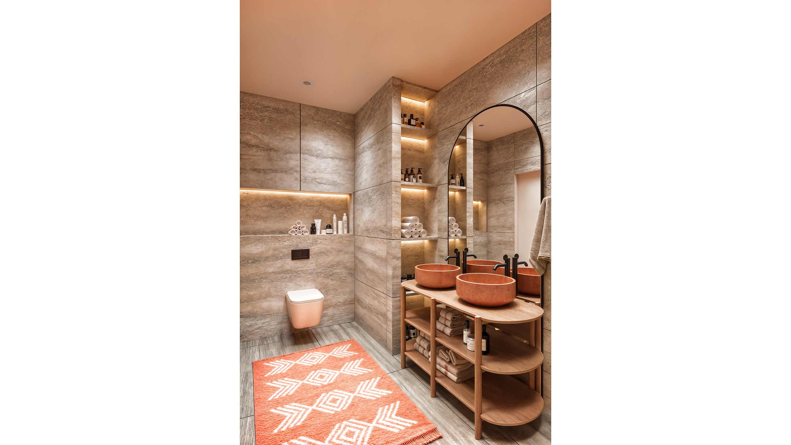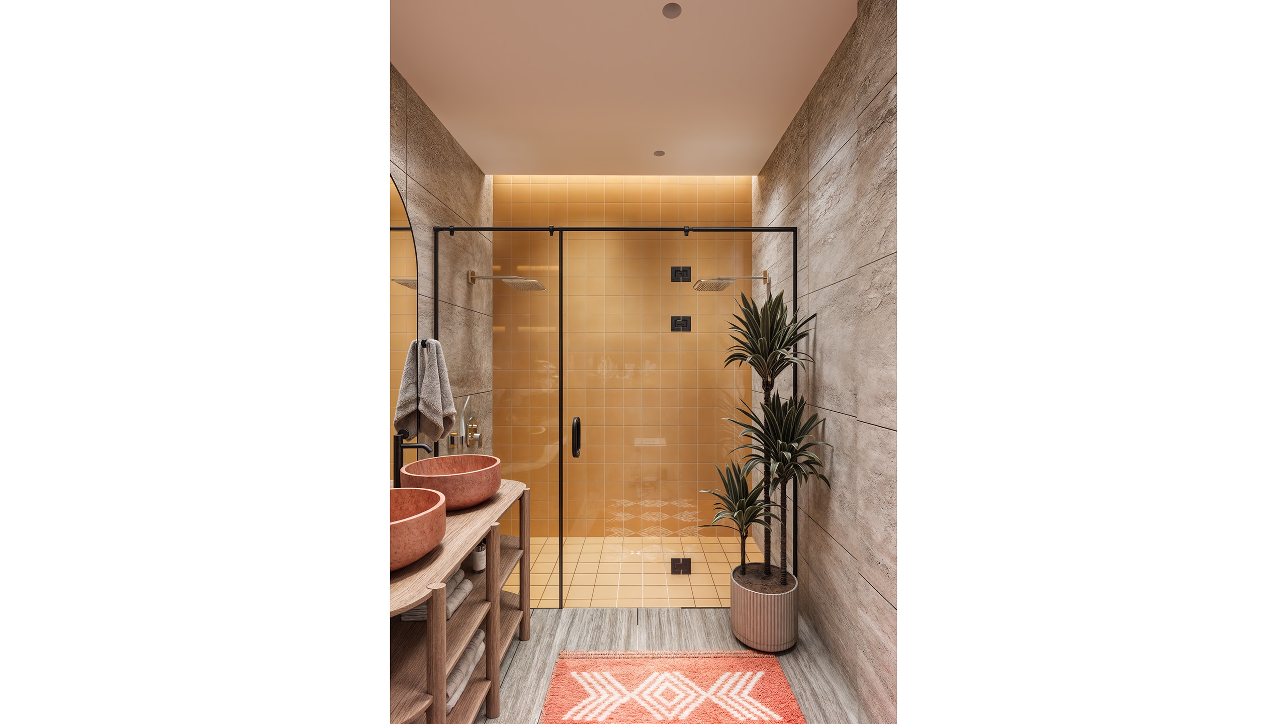In the bathroom, walls were clad in travertine, while mustard-toned tiles added warmth to the shower area. A terracotta sink and wooden vanity reinforce the continuity of natural materials, while soft rugs and thoughtful detailing echo the overall design tone.