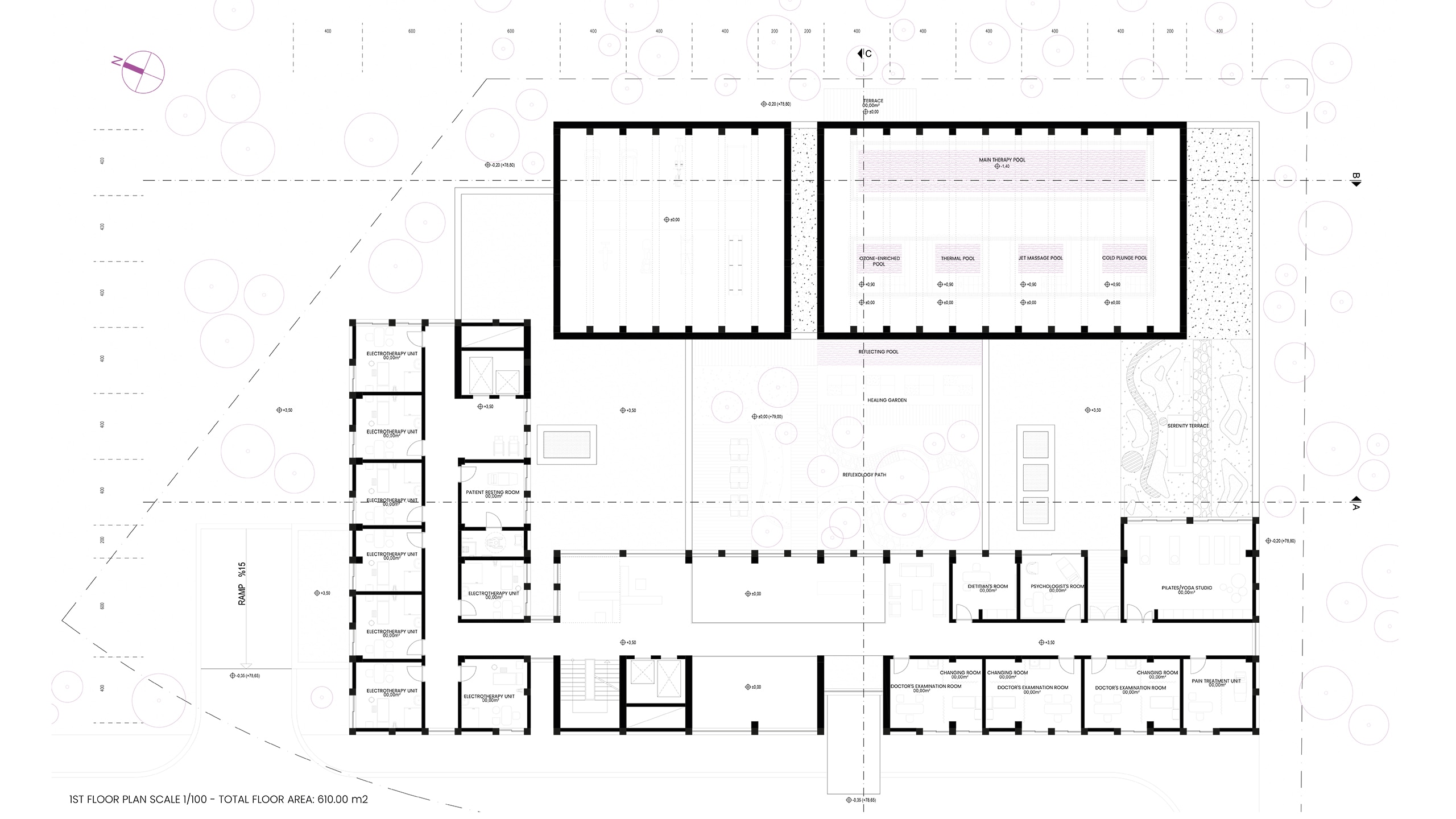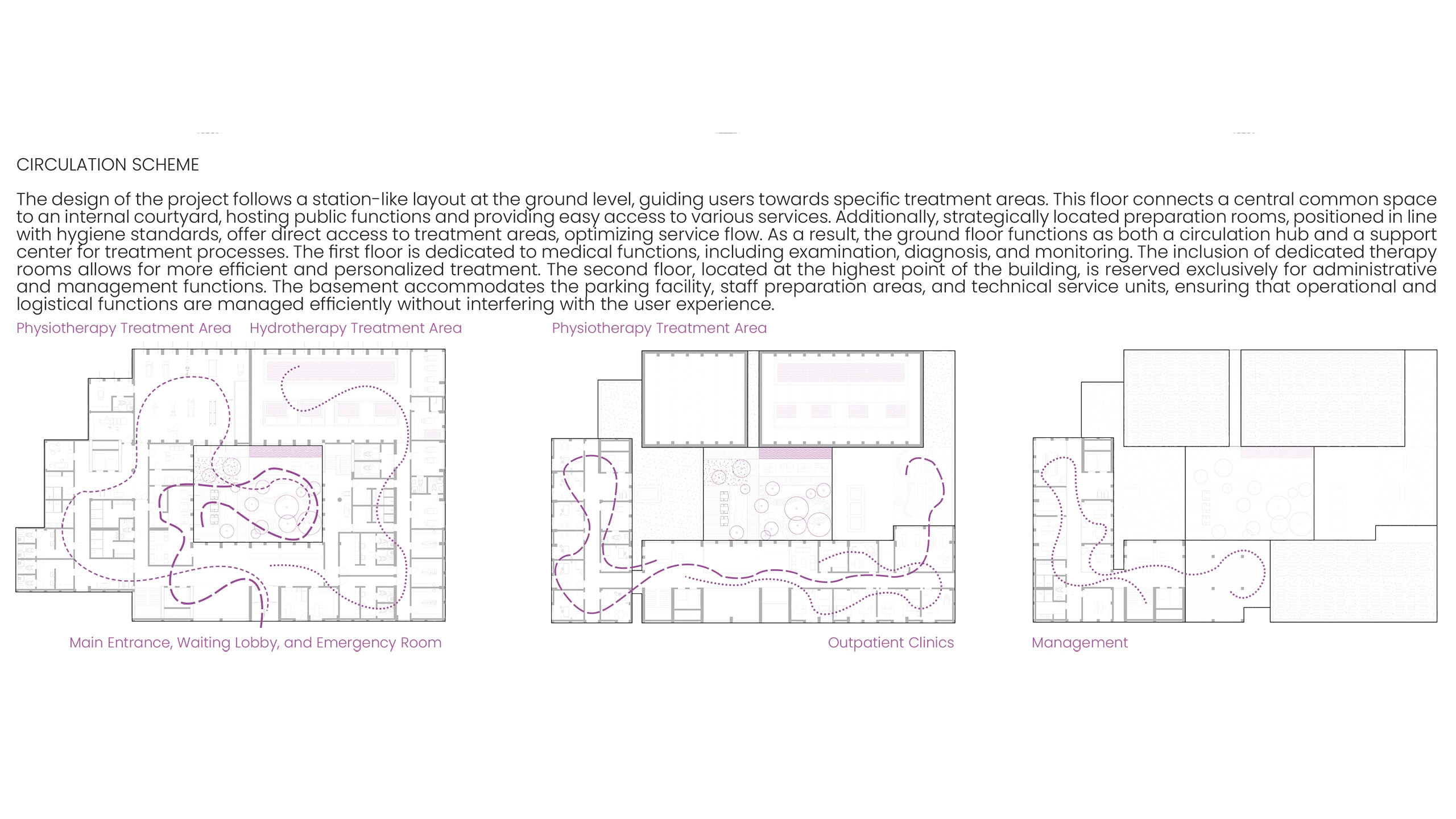 At the core of the project is a layered circulation diagram, organizing the building across four levels: a basement, ground floor, first, and second floors. The ground floor acts as a central hub, channeling users from a shared entrance and waiting area into the courtyard, and then to various treatment departments such as physiotherapy, hydrotherapy, and outpatient clinics. Carefully positioned preparation rooms ensure hygienic flow and direct access to therapy areas.