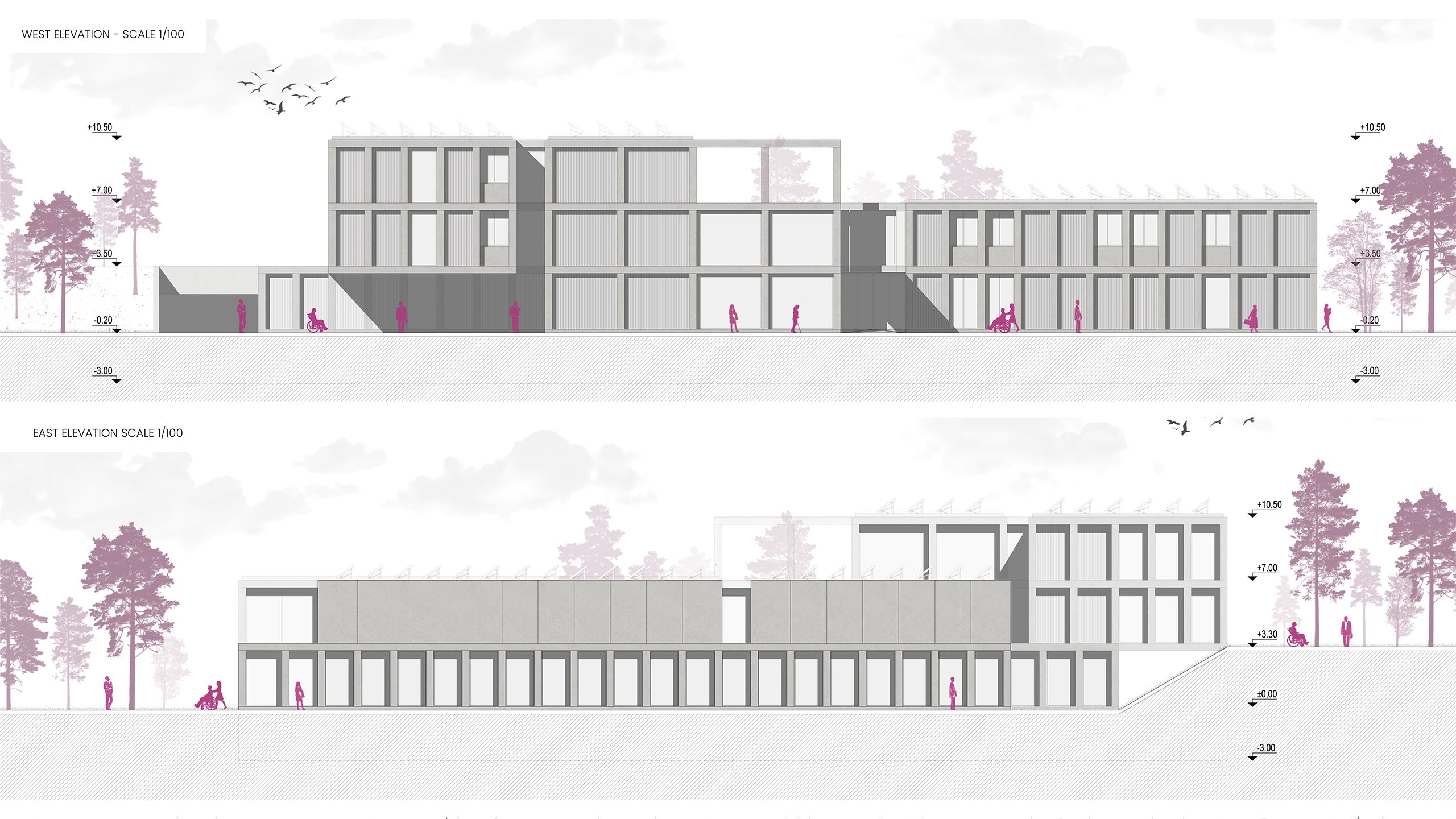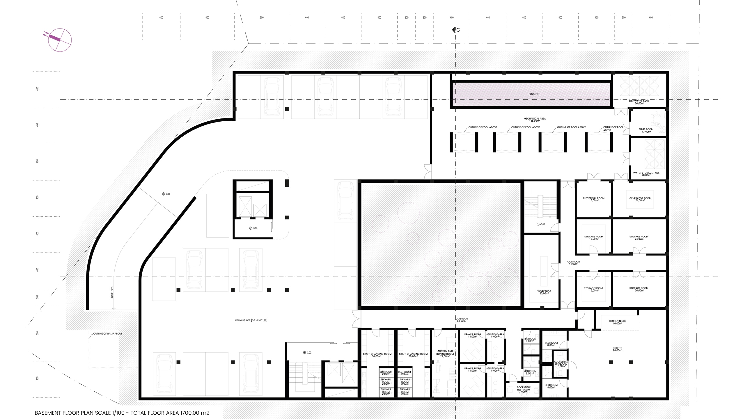 In the basement, technical service units, staff preparation areas, and an indoor parking facility are located, enabling the uninterrupted flow of operational and logistical support while maintaining an undisturbed user experience.