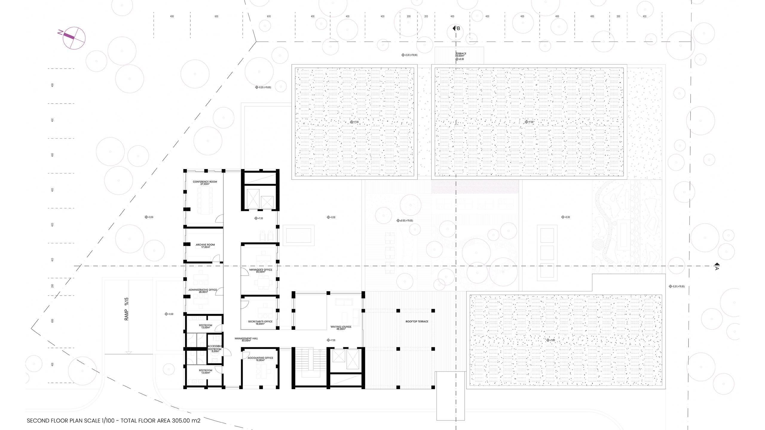 The first floor is reserved for more private medical services such as diagnosis, examination, and personalized therapy rooms, offering individualized care in a tranquil environment. The second floor, occupying only part of the building’s upper level, is allocated to administrative and management functions, ensuring smooth institutional operation without compromising patient-focused zones.