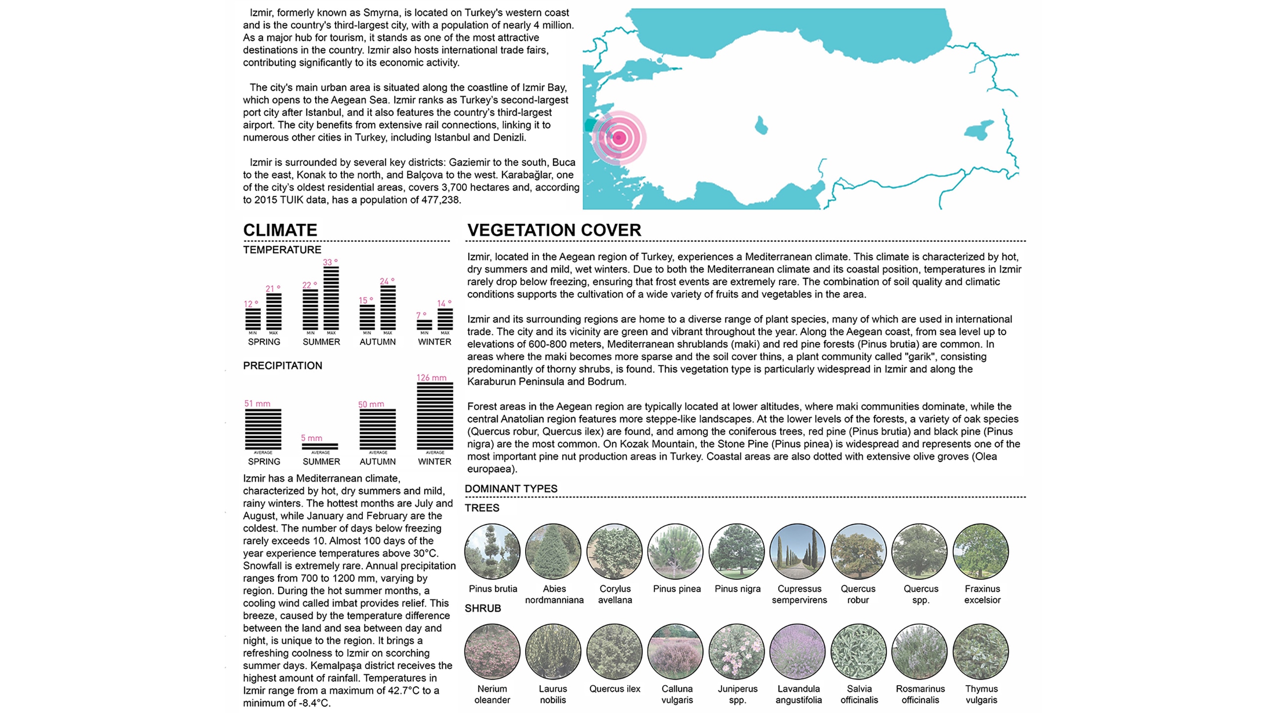 The design responds to Izmir’s Mediterranean climate, where summers are hot and dry, winters mild and rainy, and cooling coastal breezes like the imbat are a natural asset. The planting palette emphasizes drought-resistant, native species, including pines, oaks, and aromatic shrubs like thyme and lavender: providing both ecological resilience and visual richness year-round.