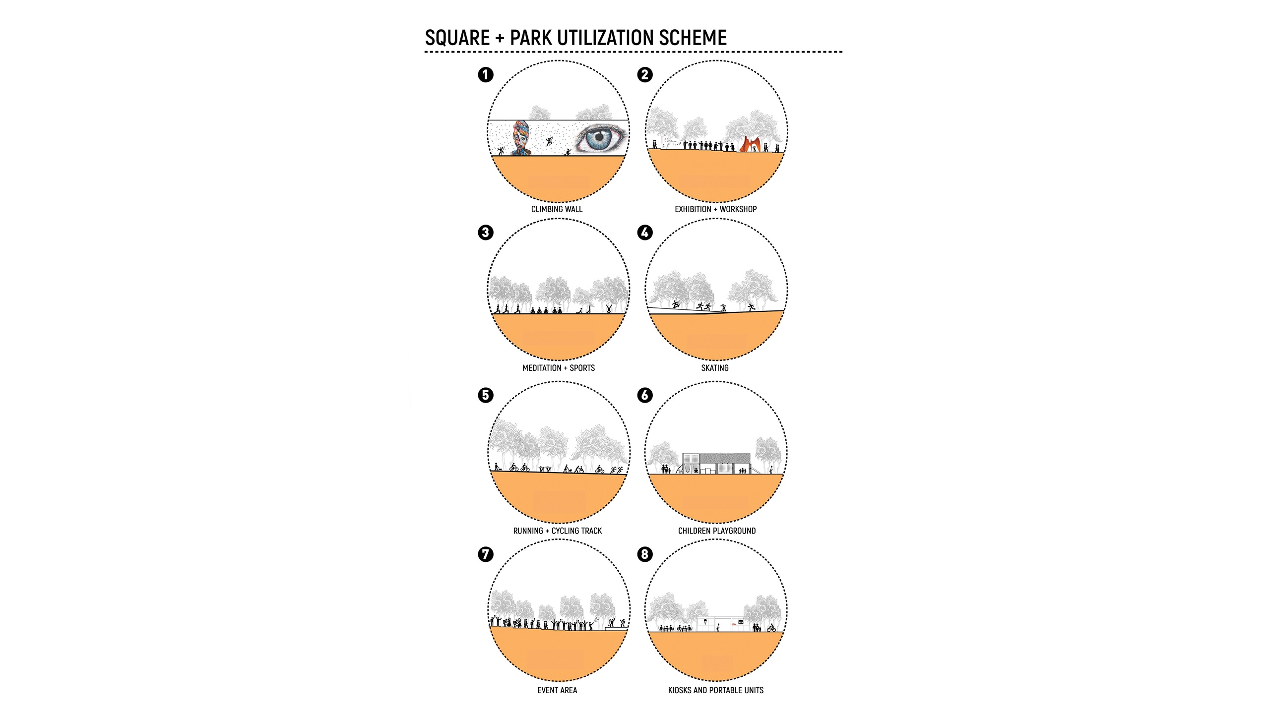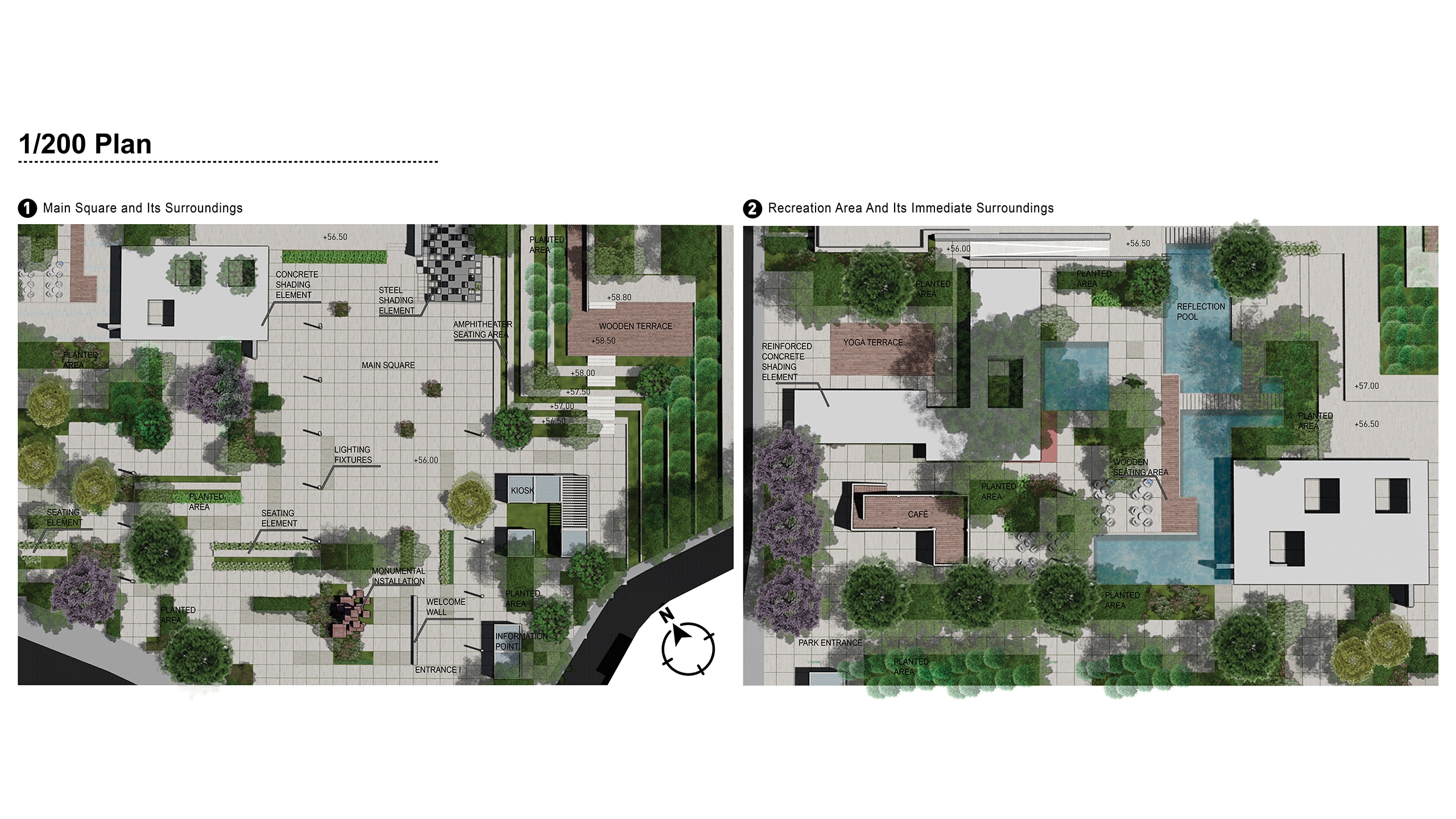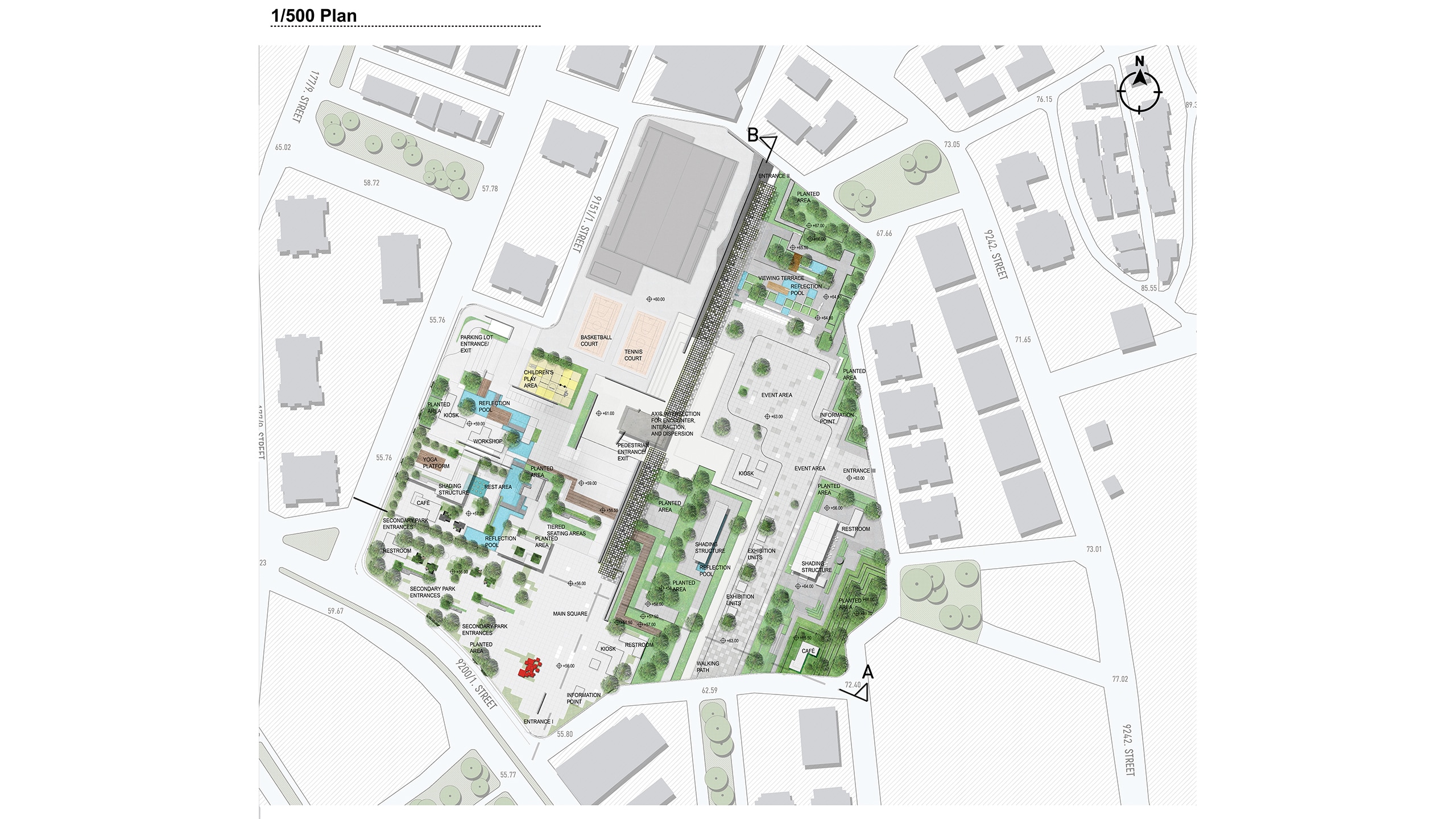 A two-level underground parking facility with a capacity for 200 vehicles, including 10 accessible spaces, supports the site’s connectivity. Its roof, repurposed as a sports surface, maximizes land use without compromising green space. Dual pedestrian exits ensure seamless integration into both the park and market zones.