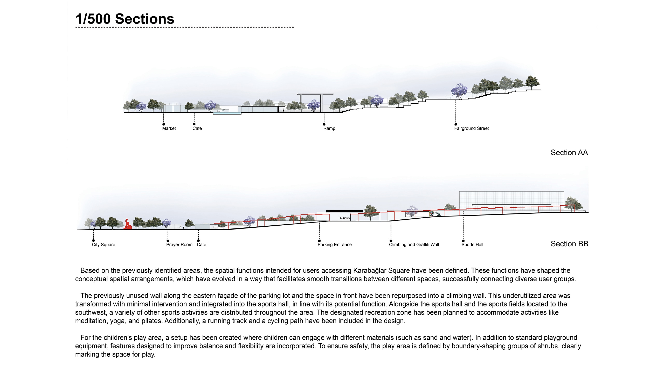 Through a carefully layered spatial strategy, the project transforms Karabaglar’s urban square into a multifunctional, resilient, and welcoming destination, aligning with the needs of both present and future generations.