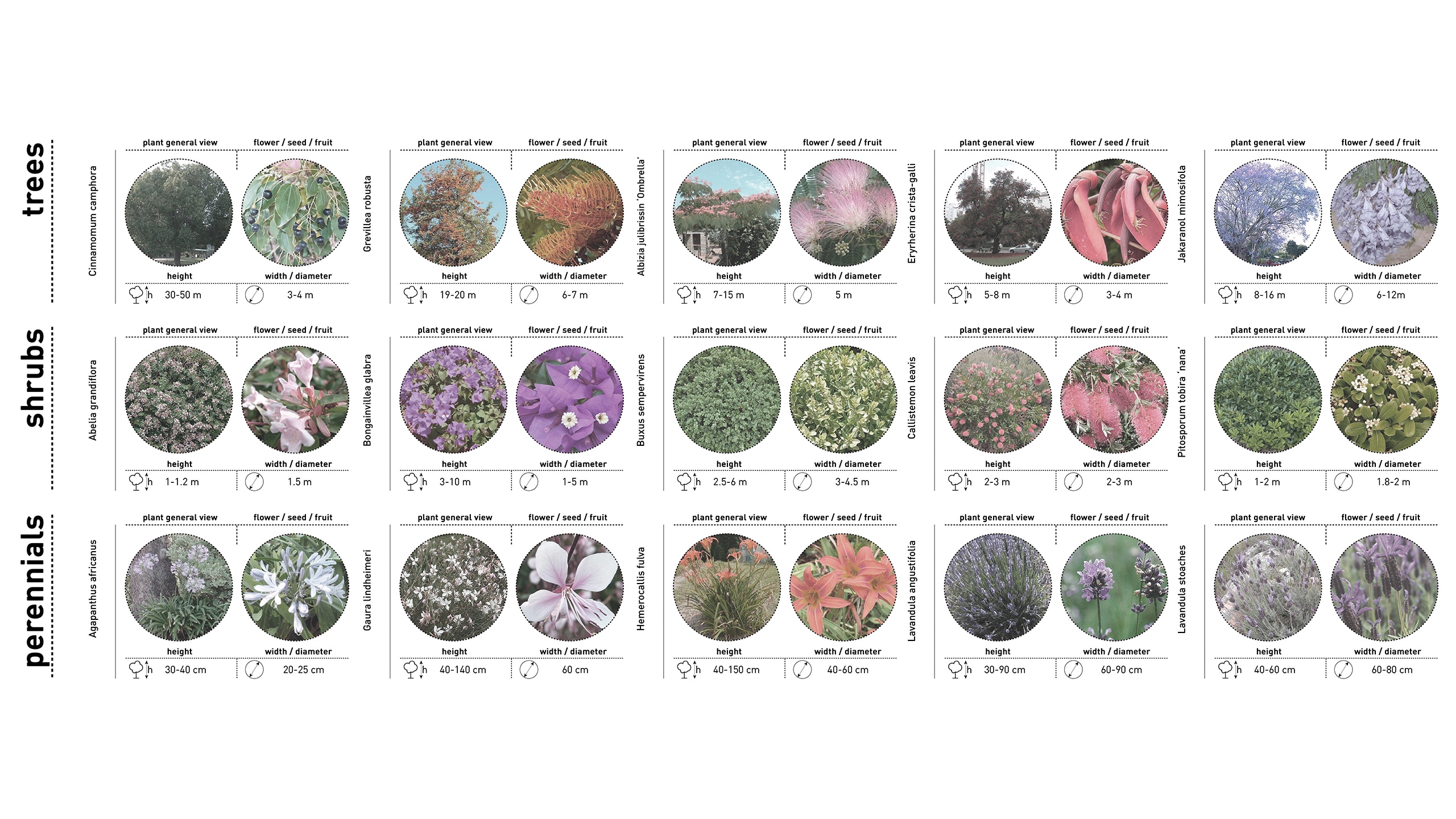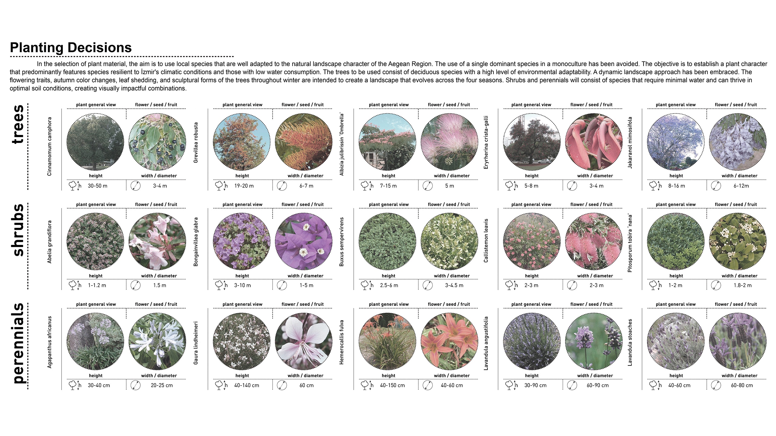 The planting strategy reflects the ecological character of the Aegean Region, prioritizing low water-use and native species that thrive in Izmir’s climate. Selected tree species such as Jacaranda, Camphor Tree, and Persian Silk Tree provide seasonal interest and shading. Shrubs like Bougainvillea, Lavender, and Bottlebrush create layered planting zones, supporting biodiversity and reducing maintenance needs.