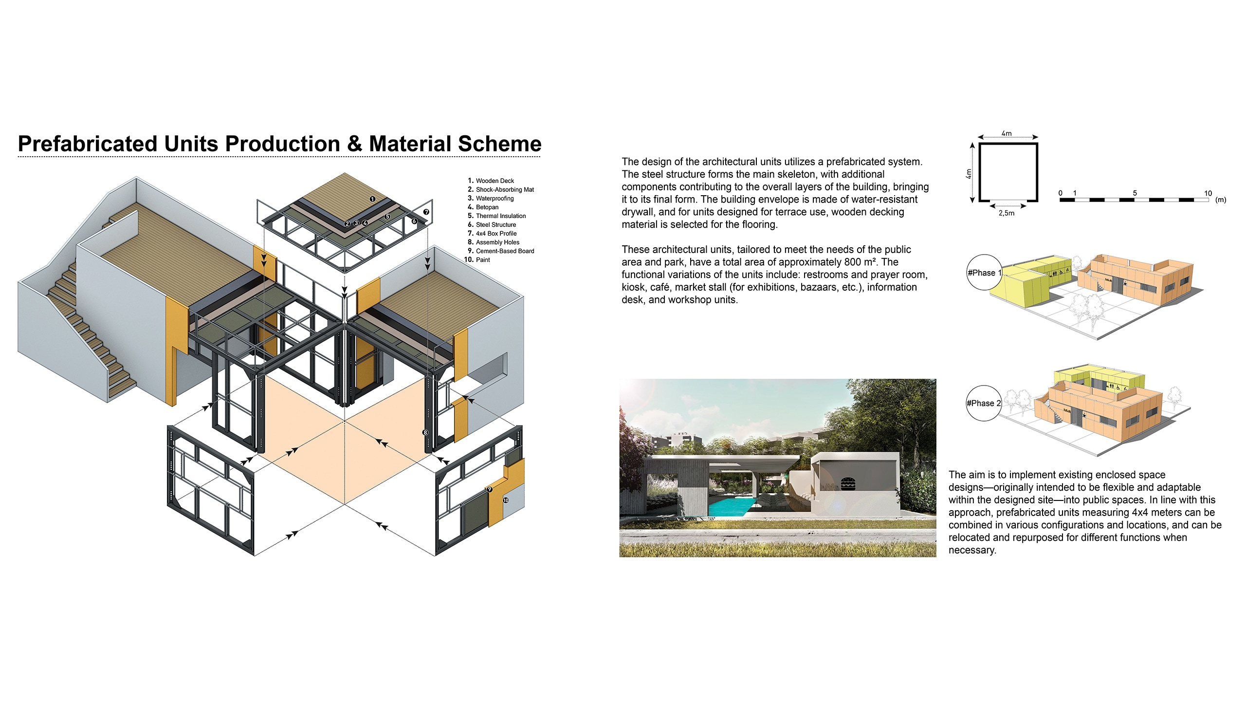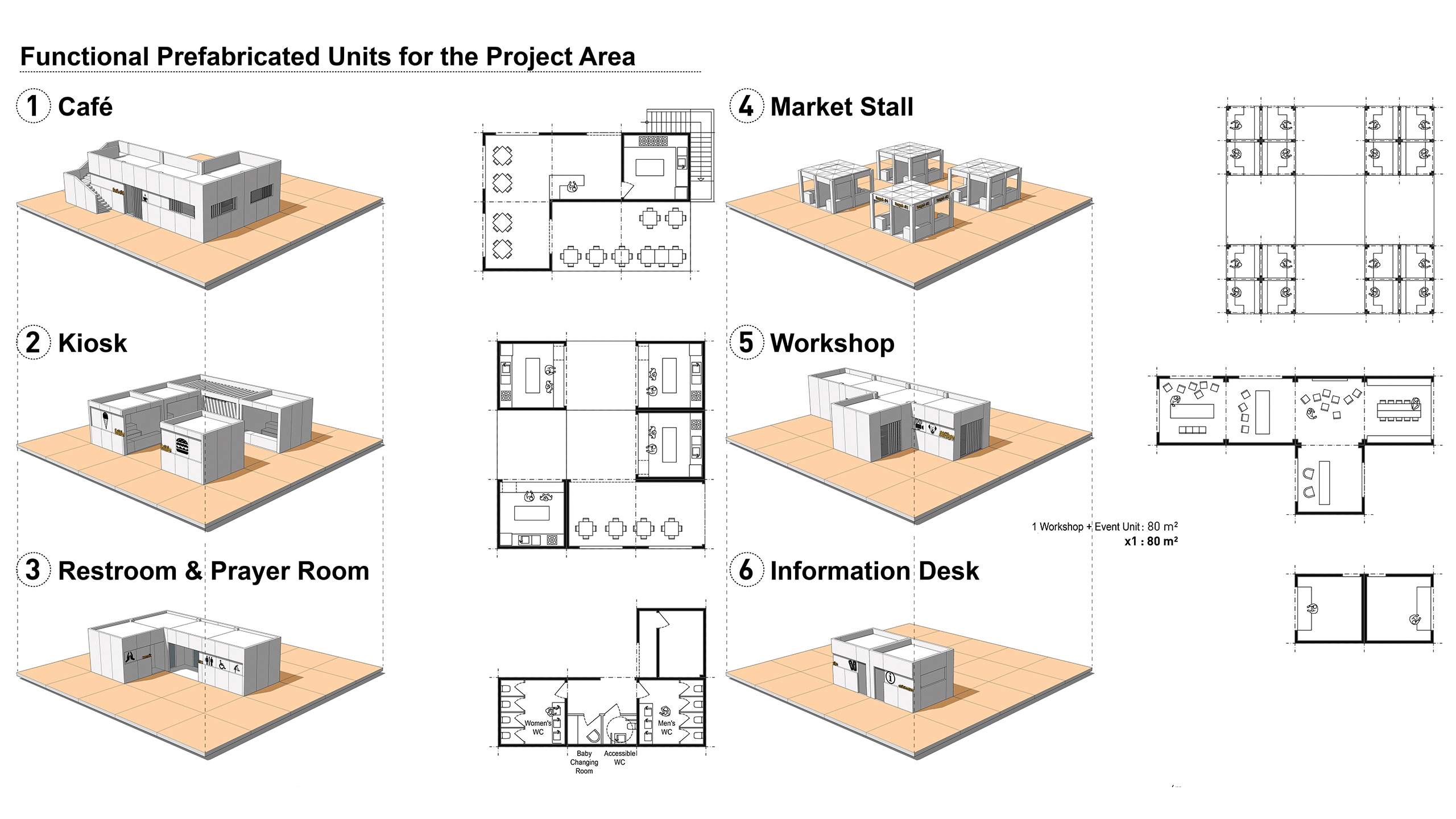The built elements are designed using a prefabricated steel-frame system, promoting flexibility, efficiency, and minimal environmental impact. These modular units serve varied functions -cafés, workshops, restrooms, prayer rooms, and information booths- and can be reconfigured based on seasonal or programmatic needs.