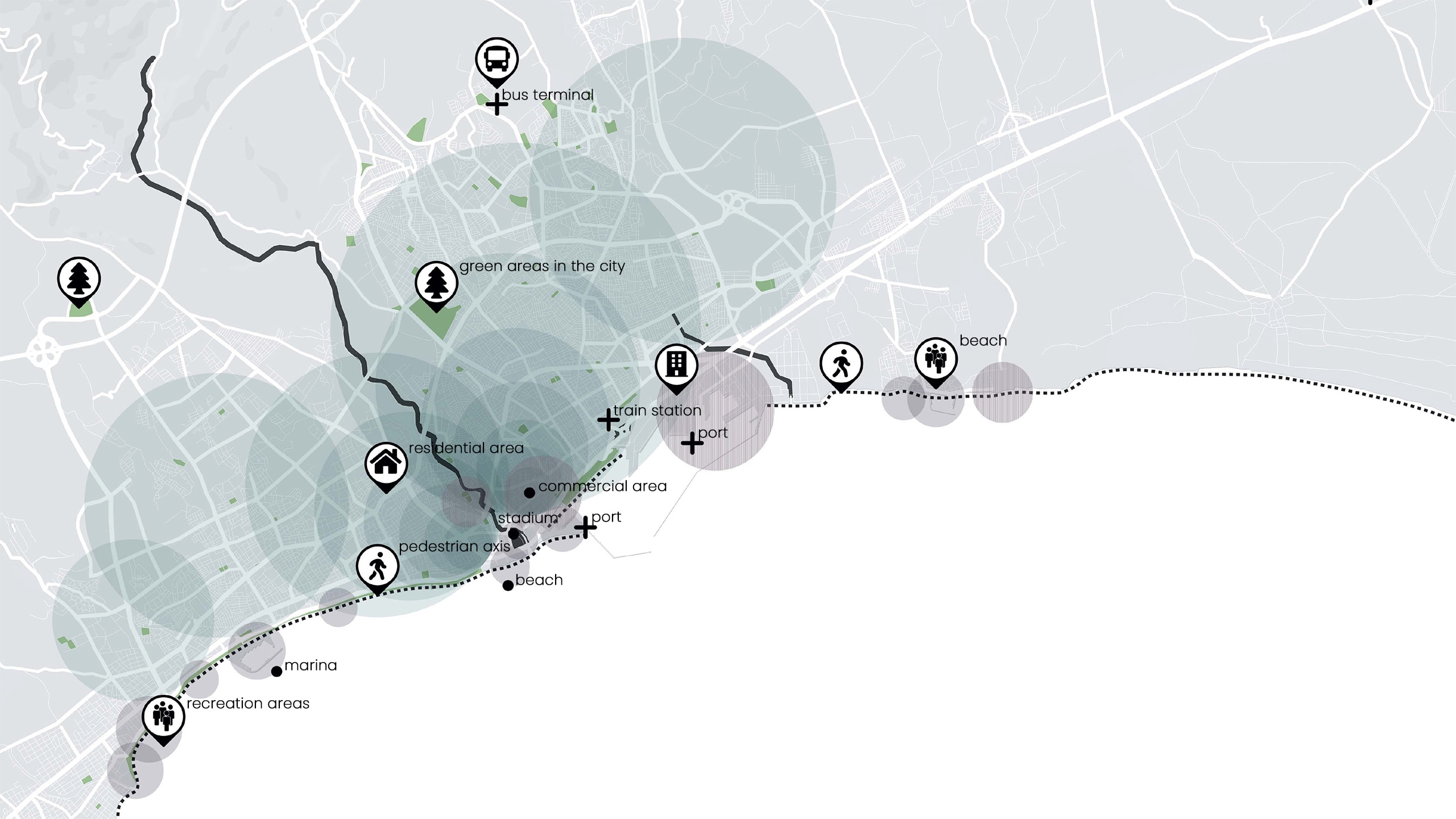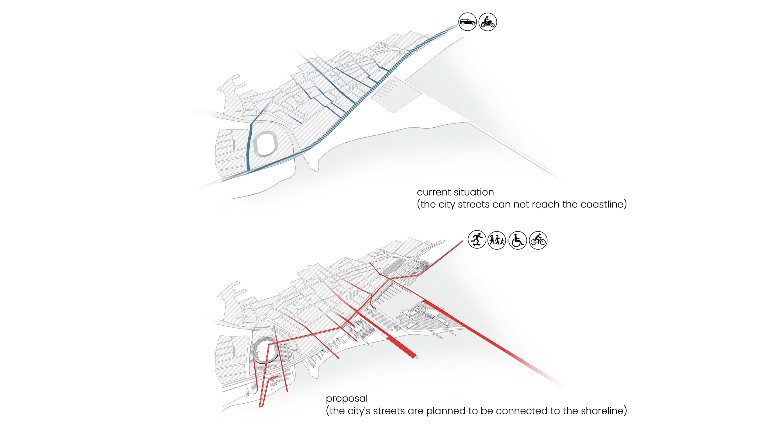 The design addresses a longstanding urban challenge: the disconnection between the densely populated inner city and the Mediterranean shoreline. By introducing a lightweight pedestrian and bicycle axis, the proposal creates an uninterrupted route that crosses over traffic, ensures accessibility for all users, and links major public nodes along the coast. This new spine does not remain confined to the project boundaries; instead, it is designed to be replicated and expanded citywide as a sustainable urban mobility solution.