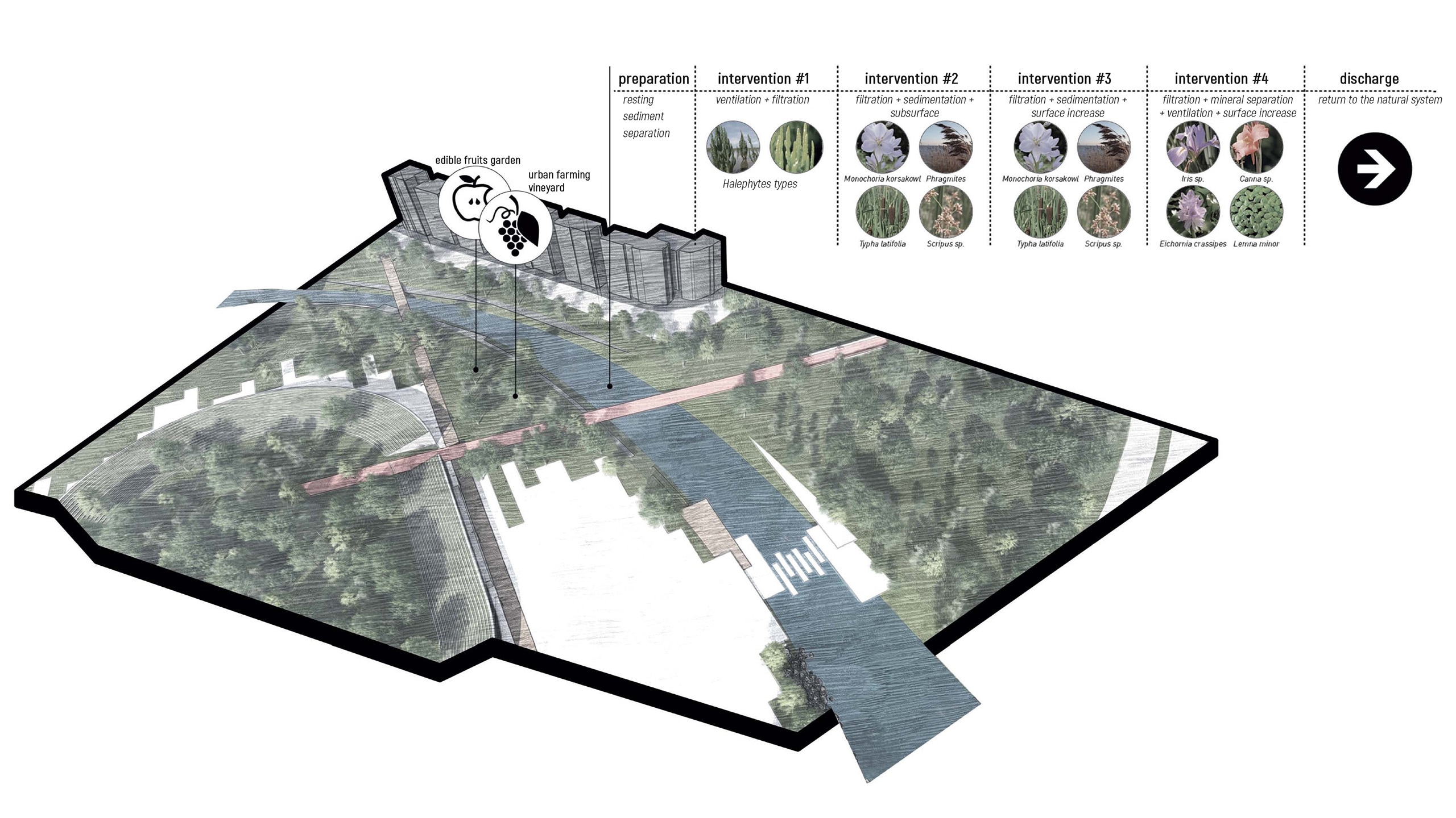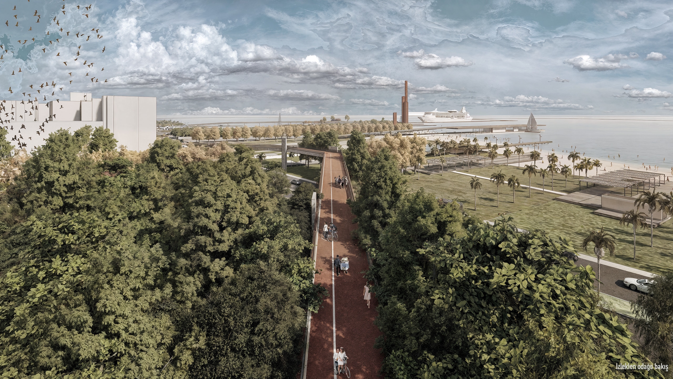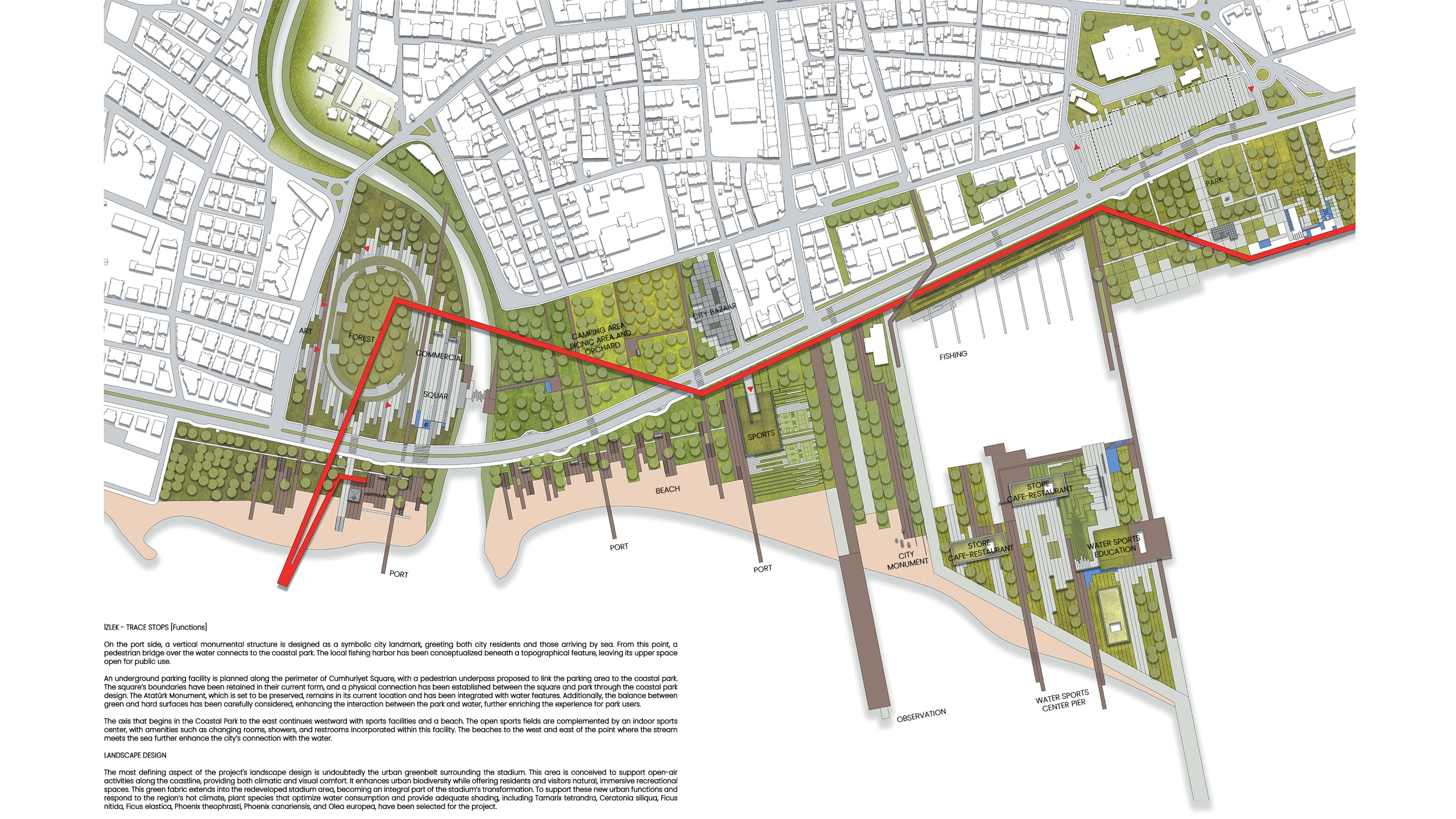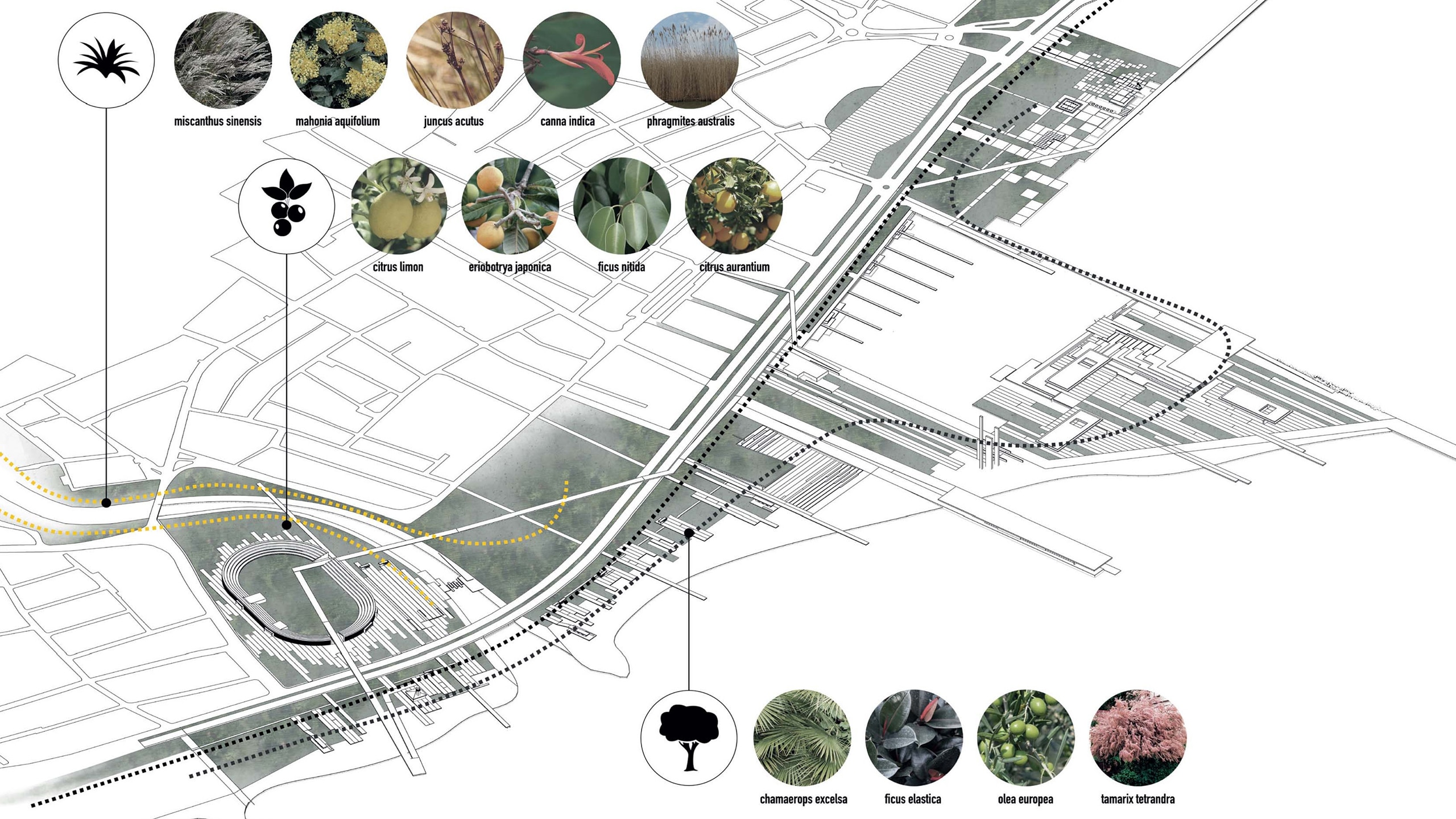 The landscape design focuses on creating a continuous urban forest, particularly around the stadium and along the shoreline. The planting palette consists of climate-adaptive, low-water-consuming species native to the Mediterranean region, including Tamarix tetrandra, Ceratonia siliqua, Olea europaea, Ficus nitida, Ficus elastica, Phoenix theophrasti and Phoenix canariensis.