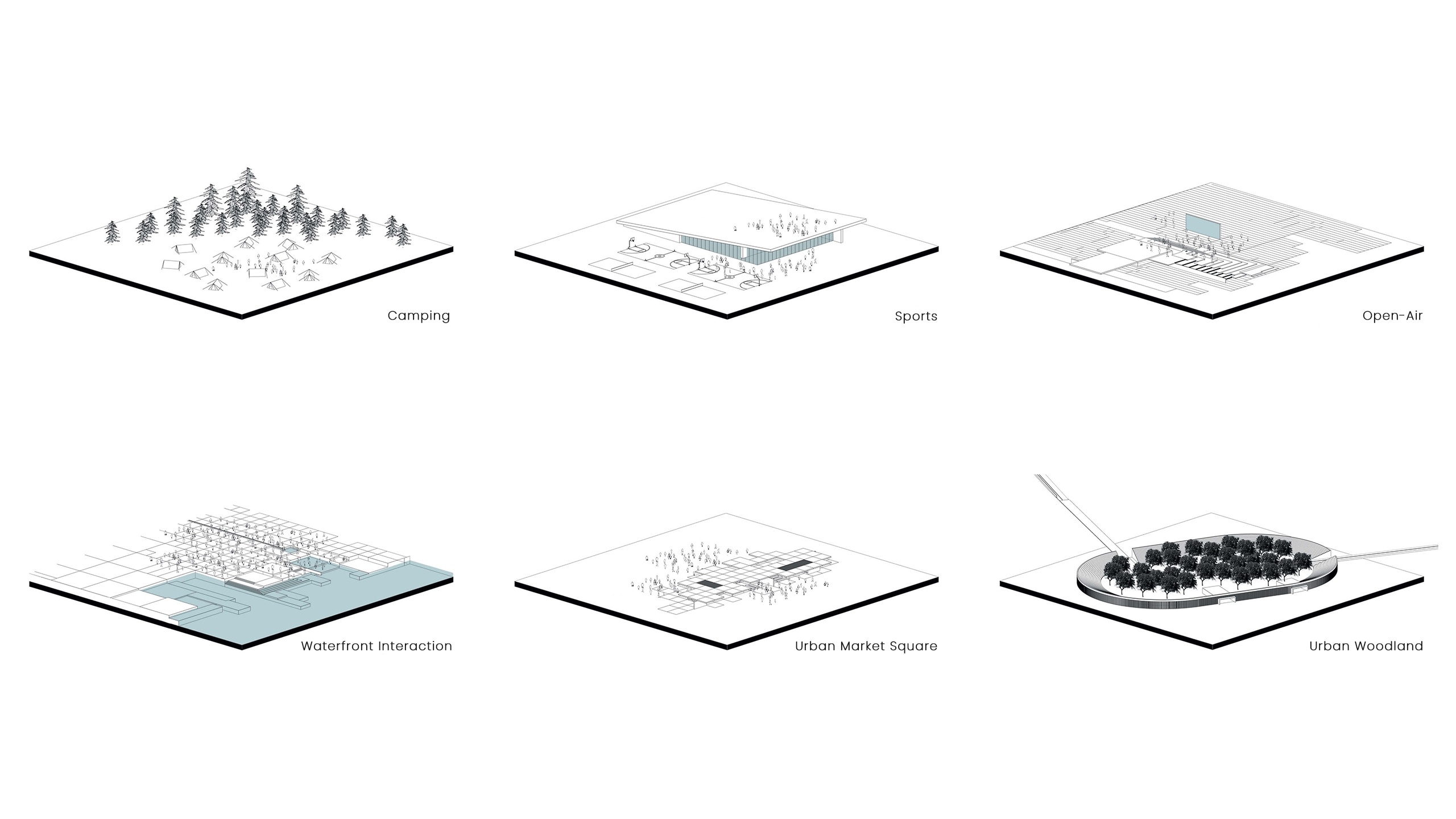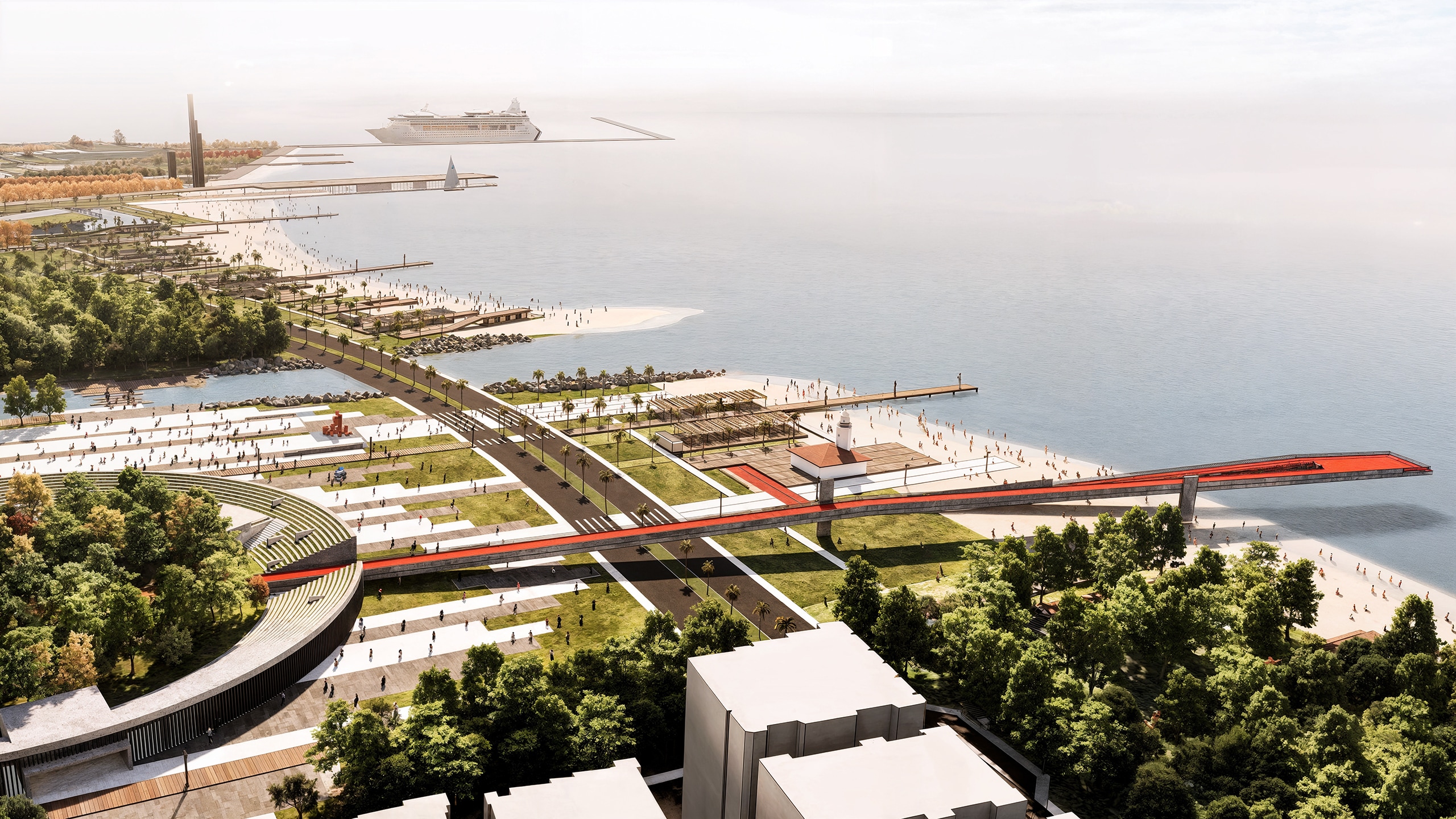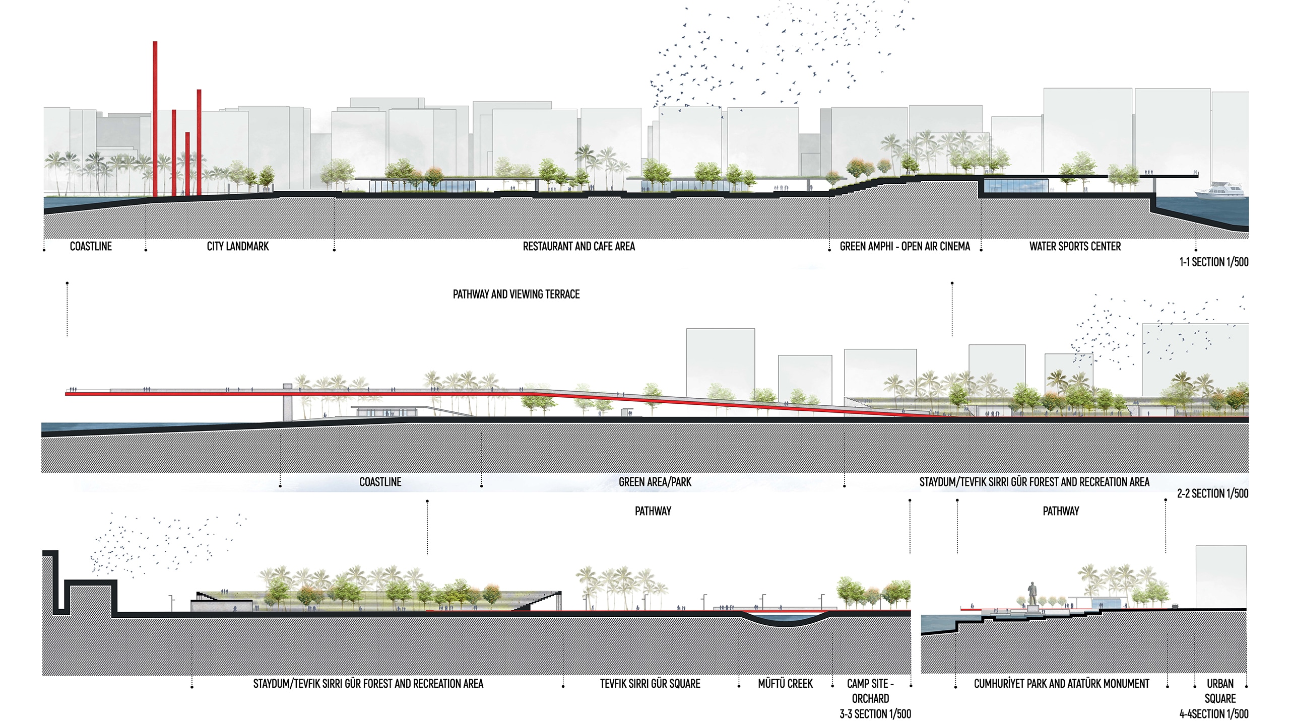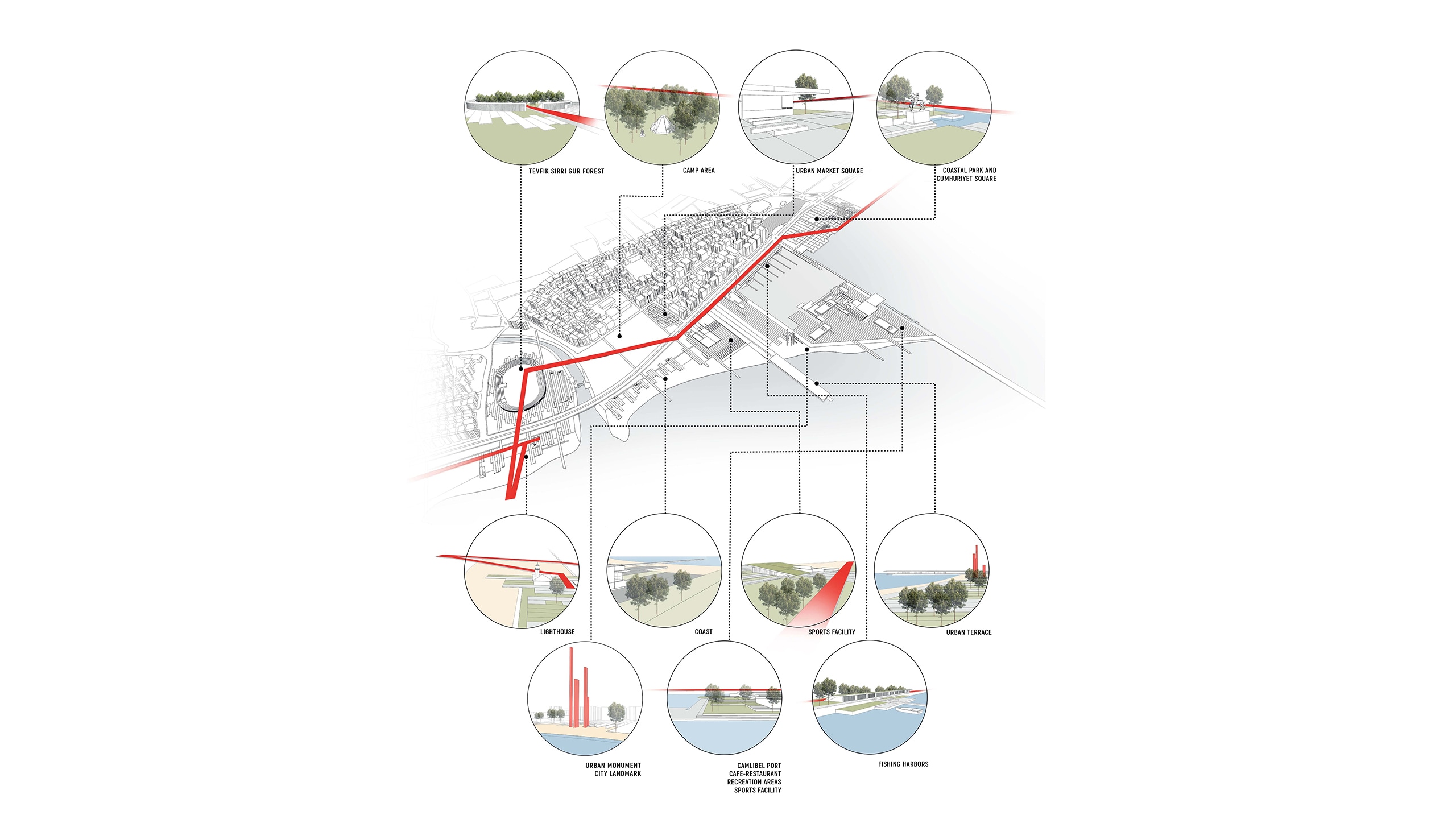 This conceptual urban design project reimagines the coastline between Tevfik Sirri Gur Stadium and Camlibel Port in Mersin, Turkiye. Developed as a large-scale urban regeneration proposal, the project introduces a coastal experience axis that integrates the city with its waterfront, reconnecting residents to the sea through a series of layered public spaces, landscape strategies, and multifunctional infrastructure.