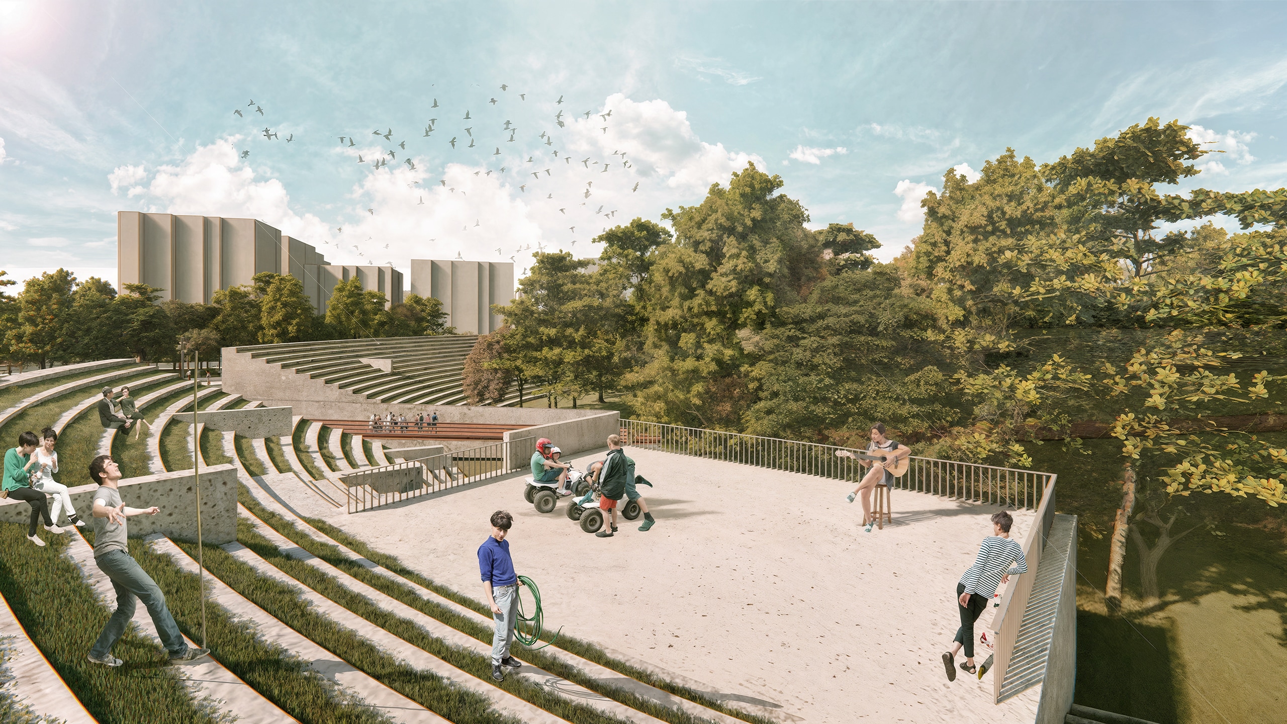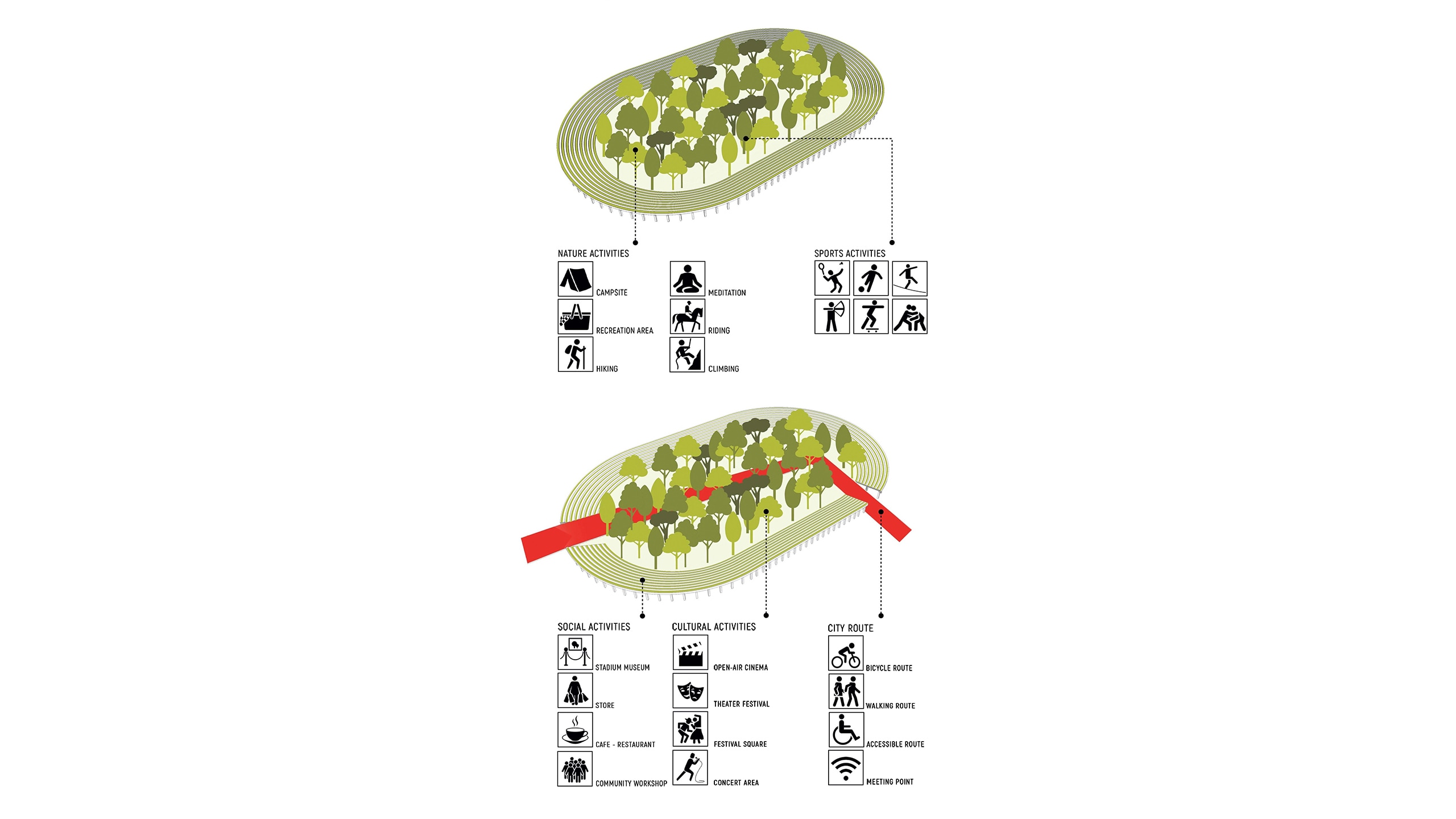 At the heart of the project lies the Tevfik Sirri Gur Stadium, a symbolic structure embedded in the city’s collective memory. Rather than demolishing the building, the design preserves and reinterprets it as an open-air, multi-purpose civic space. Its interior is transformed into a green basin: a sunken urban forest that serves as a setting for cultural events, recreational activities, and community gatherings.