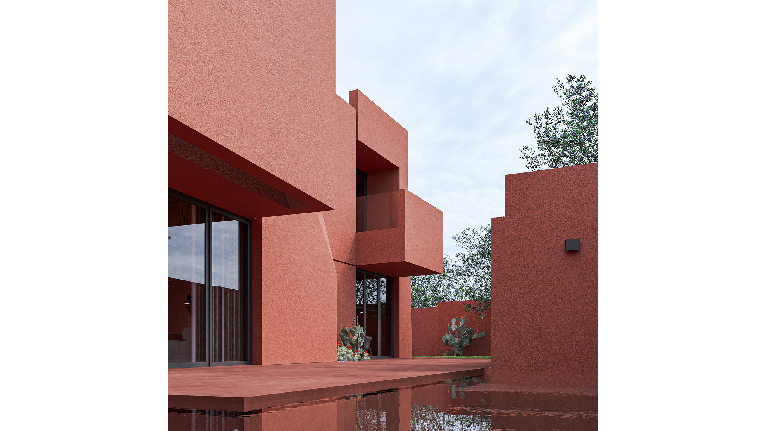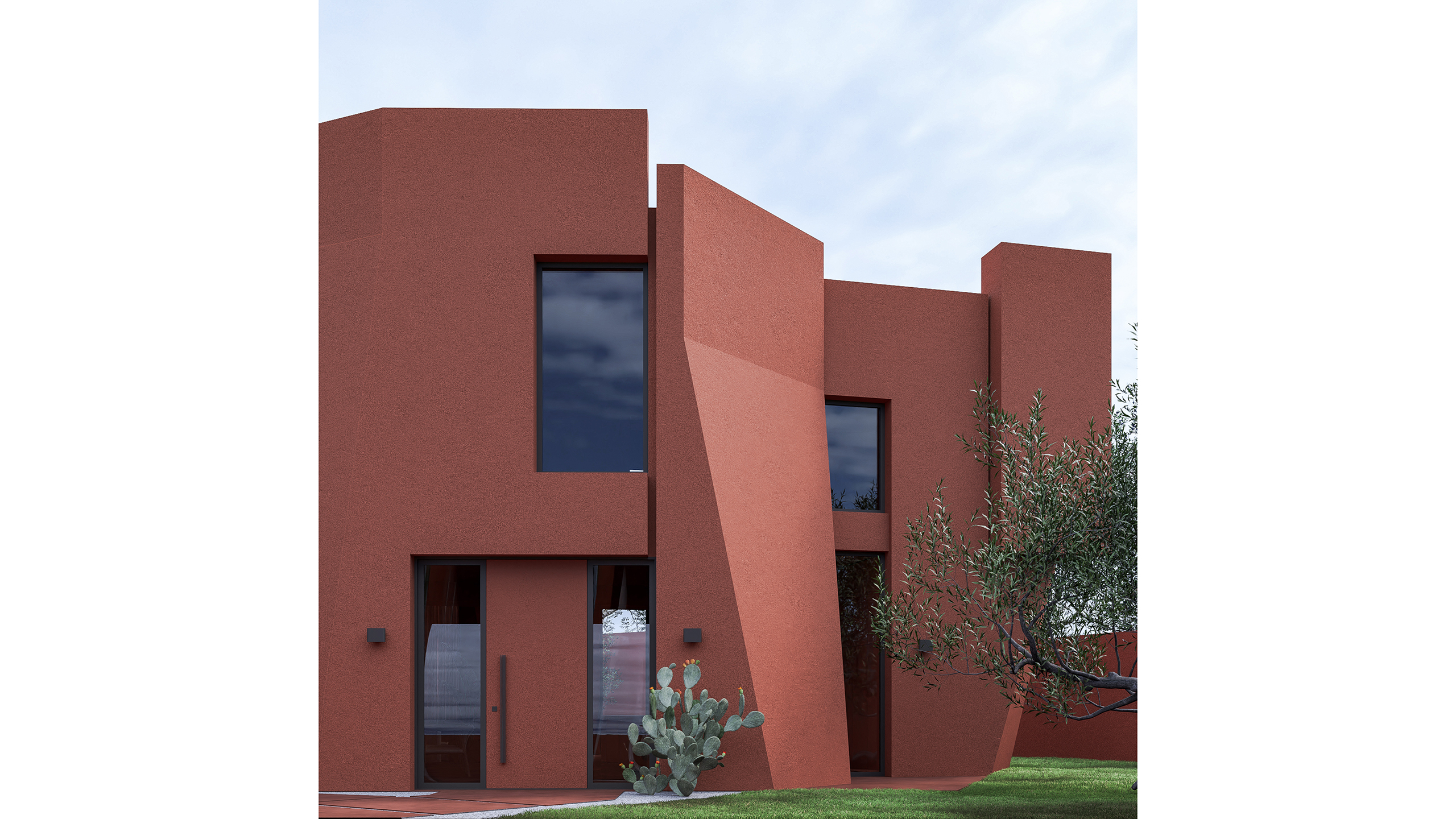 The villa reads as a singular monolithic block at first glance. However, surfaces that fracture in different directions and sliding volumes introduce a controlled tension, giving the structure a dynamic yet balanced presence. Deep niches and sharp façade openings recall the layered logic of metal plates, reinforcing the project's conceptual foundation.
